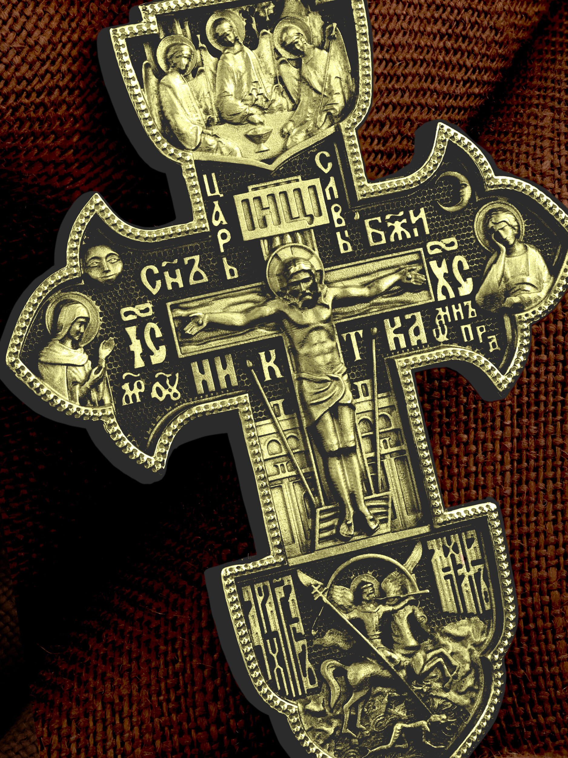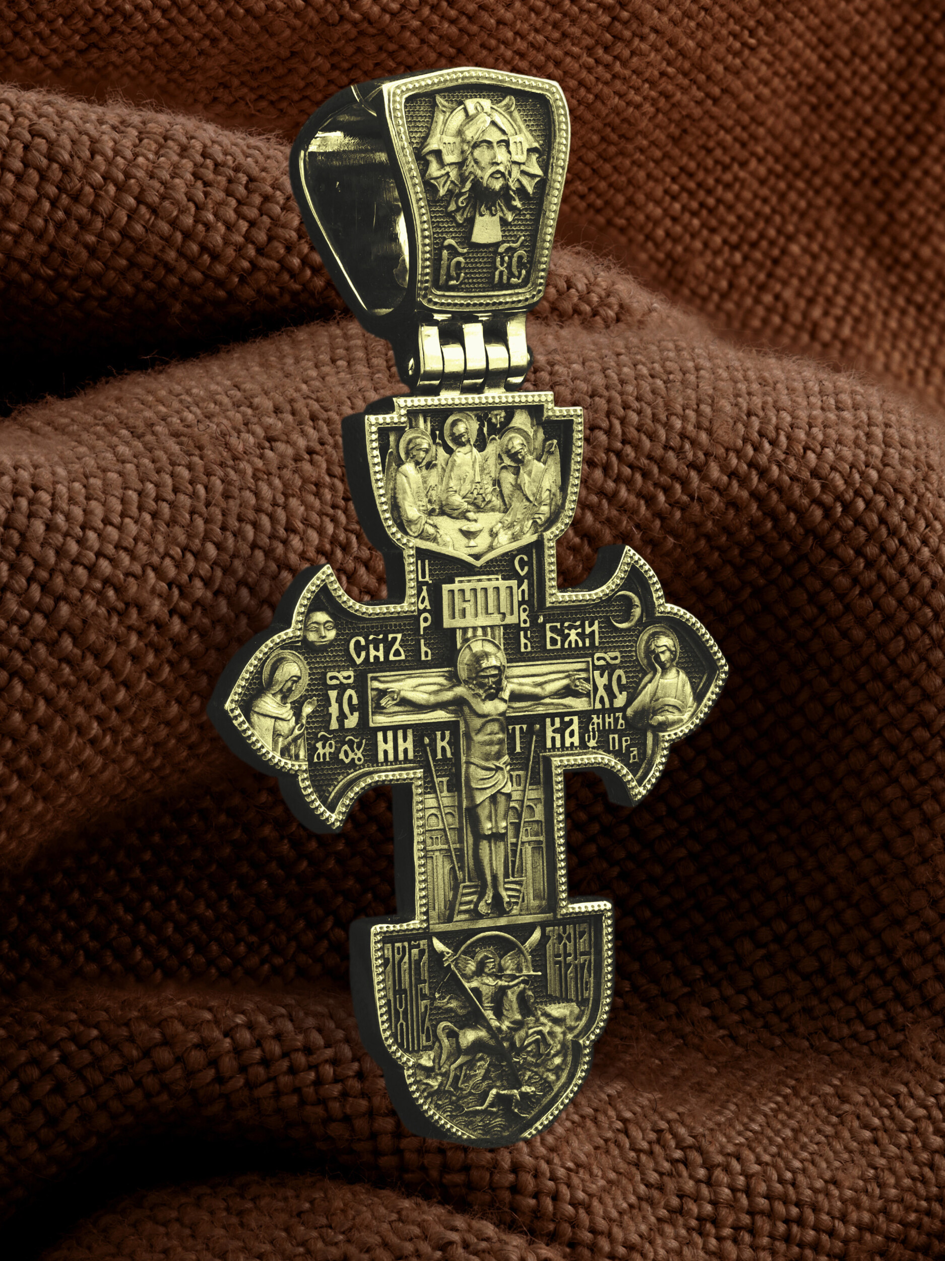 На лицевой стороне креста изображено Распятие Господа и Спасителя нашего Иисуса Христа. Крест- символ спасения и искупления рода человеческого, знамение победы над смертью и адом. Иисус Христос, как искупительная жертва освобождения человечества от власти греха, умер крестной смертью и в третий день воскрес. На верхней табличке, выше головы Иисуса, расположена надпись, составленная Понтием Пилатом — «IНЦI». Она означает «Иисус Назорей, Царь Иудейский». Распятие сопровождается каноническими надписями. Над Распятием находится надпись «Царь Славы». Надпись «IС» « ХС» означает Иисус Христос и помещается на разных сторонах поперечной (большой) перекладины креста. Рядом расположены надпись «Сын Божий» и слово «НИКА», что означает «победитель». Слева от Распятия изображена Пресвятая Богородица, справа — апостол и евангелист Иоанн Богослов, один из ближайших учеников Иисуса Христа. За Распятием высится Иерусалимская стена, в знак того, что Господь был распят вне стен города. Вдоль креста изображены копие сотника Лонгина и трость с губкой и буквы «К» и «Т». Рядом — слово «НИКА», что означает «победитель». Над распятием помещено изображение иконы Святой Троицы в виде трех ангелов. Ниже распятия изображен Архангел Михаил, восседающим на огненном крылатом коне. От уст архангела исходит труба, возвещающая наступление Второго пришествия и Страшного суда, а над его распростертыми крыльями изображена радуга. Копьем с крестом он пронзает поверженного сатану. На кулонном кольце изображен Нерукотворный образ Господа и Спасителя нашего Иисуса Христа, чудесно отпечатавшийся на плате, котором Христос вытер свой лик.