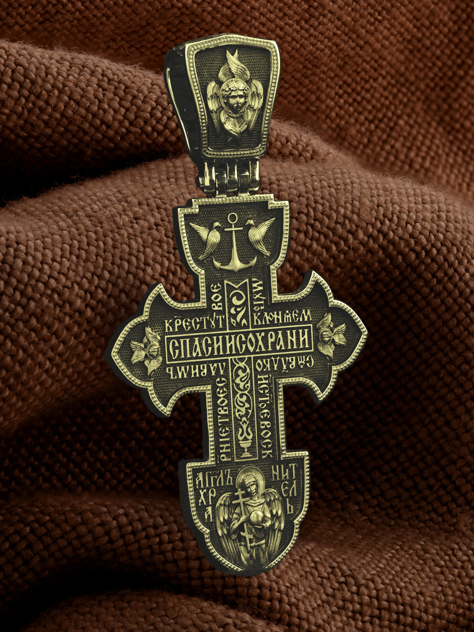 В центральной части оборотной стороны креста написана молитва: «Спаси и сохрани». Рядом — песнь: «Кресту Твоему поклоняемся, Владыко, и святое Воскресение Твое славим». Ниже изображен святой Ангел-Хранитель в виде прекрасного юноши держащего в правой руке крест, а в левой — сферу.. На кулонном кольце изображен Ангел Серафим.
