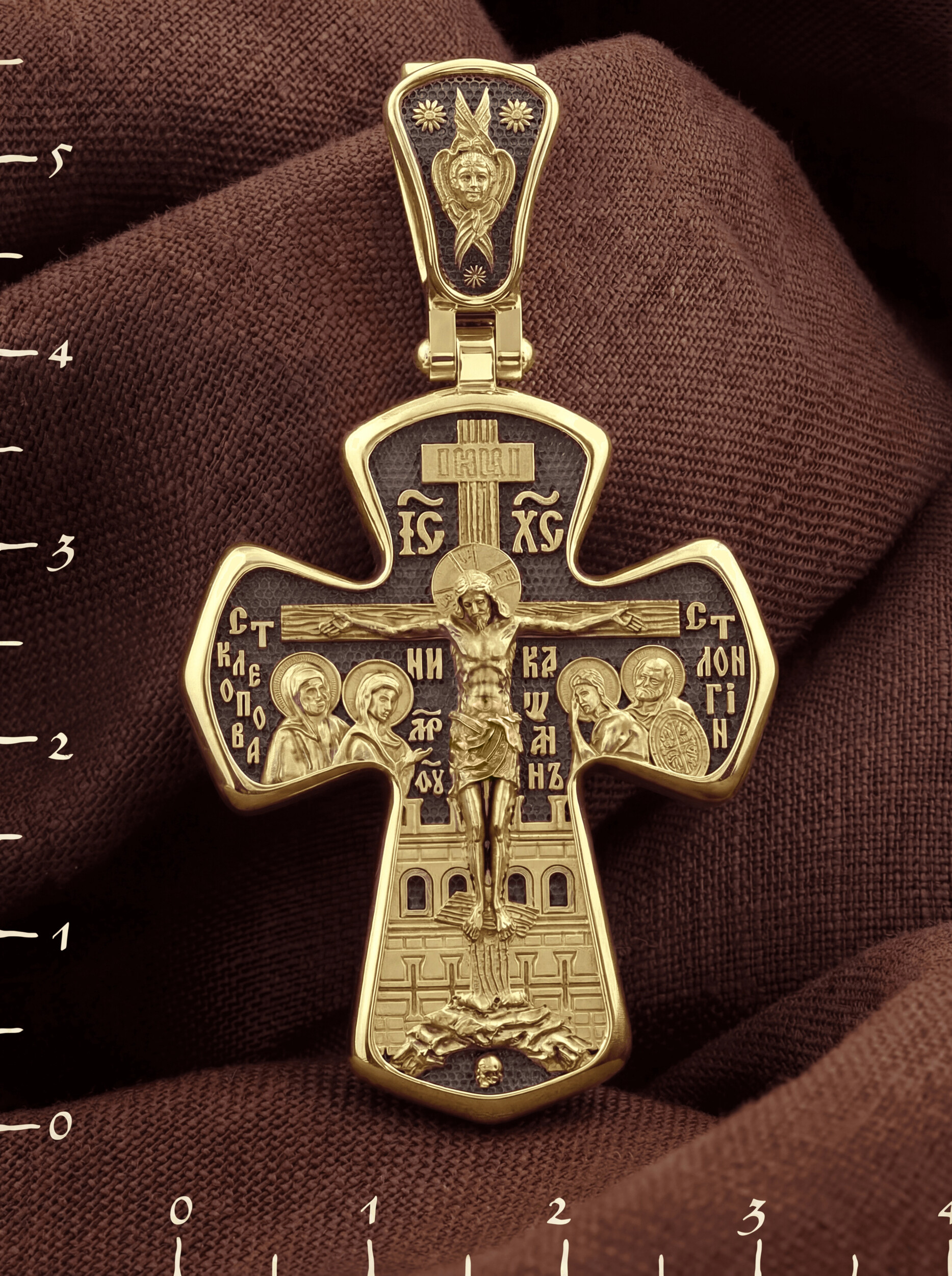 На лицевой стороне креста изображено Распятие Господа и Спасителя нашего Иисуса Христа, отдавшего Себя на смерть, для искупления грехов мира. Господь сказал: кто хочет идти за Мною, отвергнись себя, и возьми крест свой, и следуй за Мною. (Мк. 8: 34). Крест является символом жертвенной любви всеблагого Бога к падшим людям, всепобеждающим духовным оружием христиан, основанием и средоточием церковной жизни. На верхней перекладине помещена надпись «IС» « ХС», что означает Иисус Христос. Ниже — слово «НИКА», что означает «победитель». Слева от Распятия изображена Пресвятая Богородица, справа — апостол и евангелист Иоанн Богослов, один из ближайших учеников Иисуса Христа. За Распятием высится Иерусалимская стена, в знак того, что Господь был распят вне стен города. Возвышение, на котором стоит Крест, символизирует гору Голгофу, на которой произошло Распятие. Под подножием Креста изображена покоящаяся голова (череп) Адама. На кулонном кольце помещен крест