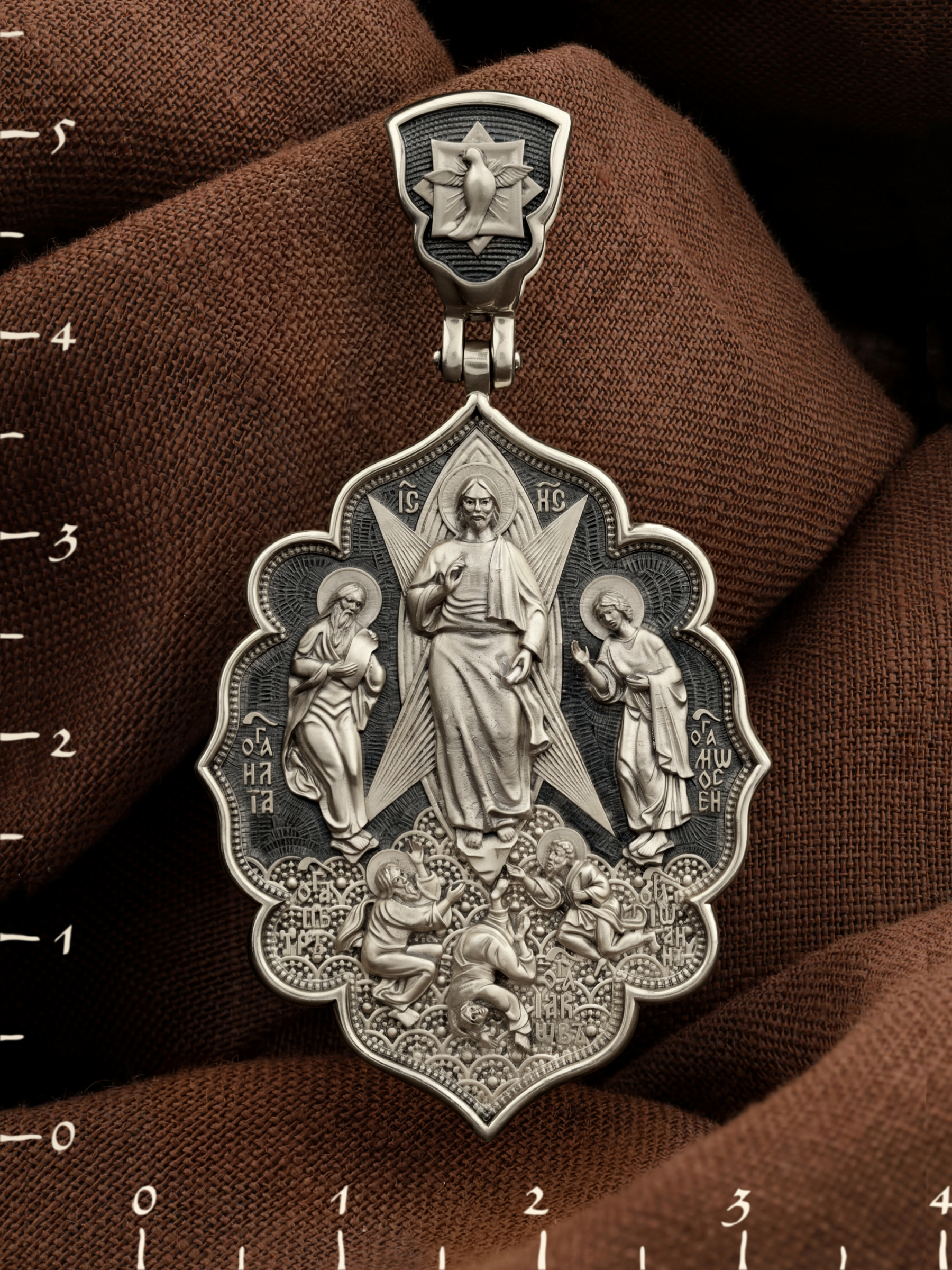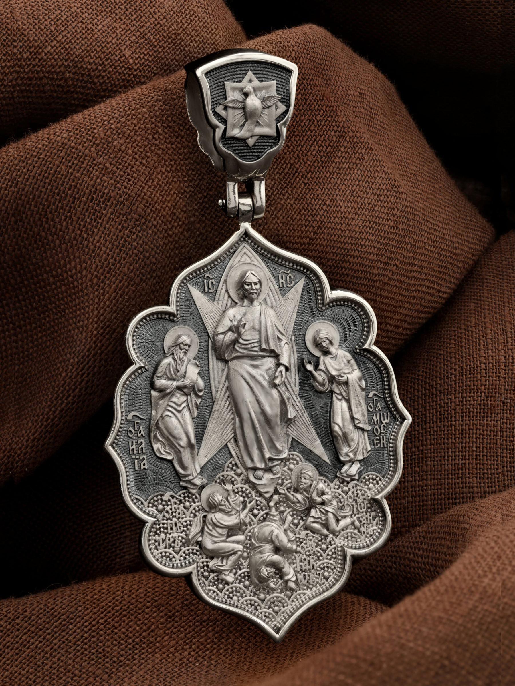 На лицевой стороне образка изображена икона «Преображения Господня». Преображение — одно из немногих Евангельских событий, которое по канону можно изображать не только там, где оно реально происходило. Преображение Господне на иконах можно увидеть на фоне посвященных ему монастырей и храмов. Это объясняется тем, что каждый христианский храм является духовным Фавором, где в церковных таинствах и молитве душа верующих приближается к своему преображению. Образ являет Господа Иисуса Христа в тот момент, когда Он предстал трем Своим ученикам: Петру, Иакову и Иоанну Богослову. Пророки Моисей и Илия предстояли рядом и беседовали с Ним. Апостолы едва могли вынести бесконечную радость, которая охватила их в присутствии Бога. Когда же на гору спустилось облако и раздался глас Божий: «Сей есть Сын Мой Возлюбленный; Его слушайте», апостолы в сильном страхе пали на землю (Лк. 9:35). На иконах «Преображение Господне» они так и изображаются — лежащими у ног Христа. Во главе образка изображен парящий голубь — символ Святого Духа и Его благодати.