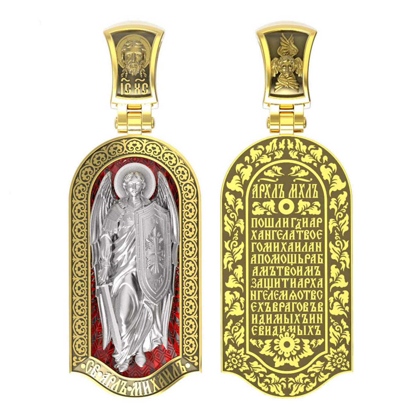 Основой композиции лицевой стороны является ростовое изображение Архангела Михаила — Архистратига всех Небесных Воинств. Он ведет непримиримую войну против сил зла, охраняет райские врата и защищает души людей. Его имя означает «Кто яко Бог?», так как он самый могучий и грозный враг зла. Он первым ополчился на Денницу, когда тот восстал против Бога, низверг его с Неба и не перестает сражаться с его темным воинством. Поэтому он часто изображается в виде воина, в доспехах и с огненным мечом. Но как служитель Небесного Царя и глава Ангелов и Архангелов на многих иконах он предстает в богатой одежде византийских придворных.