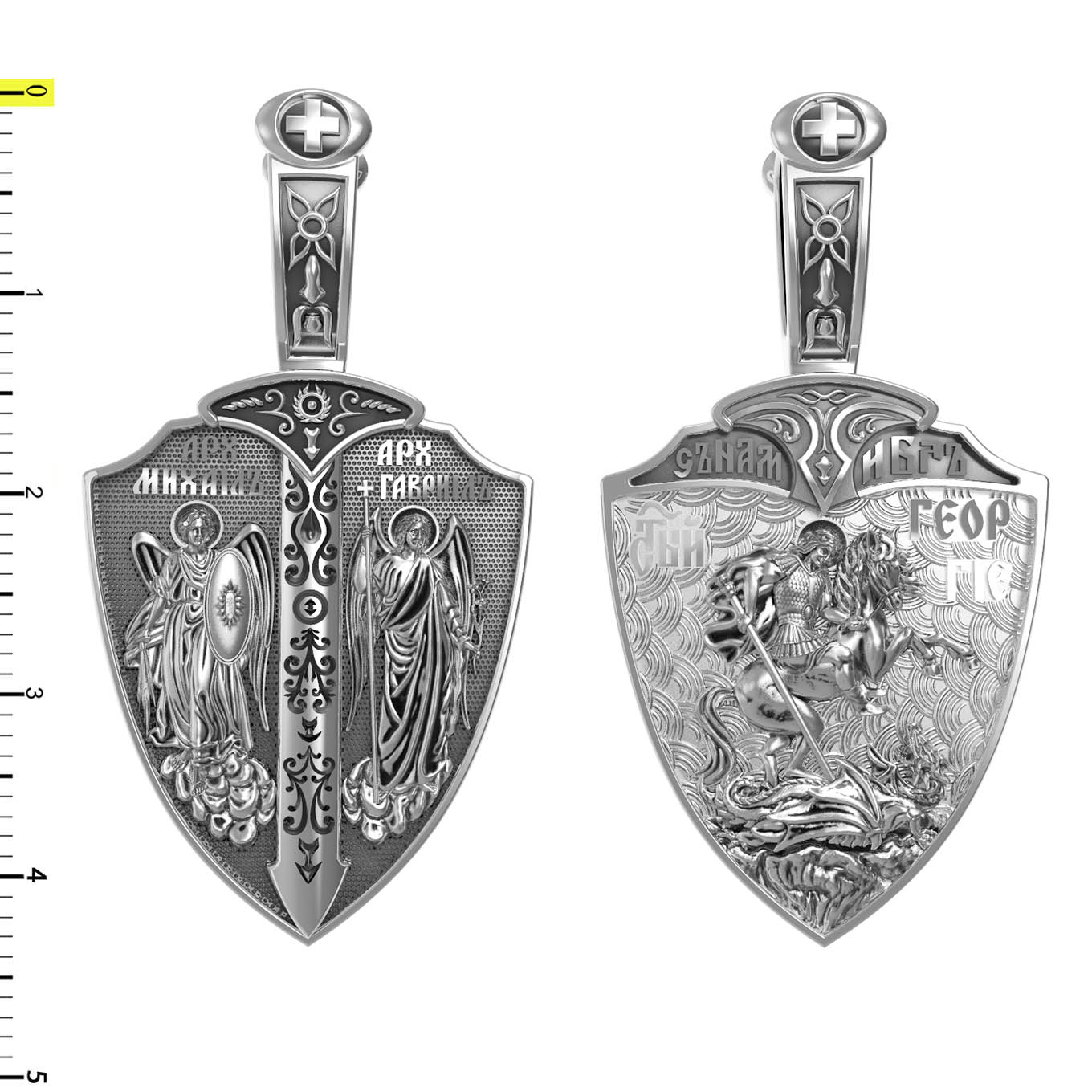 Образок выполнен в виде воинского щита и меча. На лицевой стороне образка изображены Архангел Михаил и Архангел Гавриил. Архангел Михаил изображен в воинственном виде с огненным мечом в правой руке и щитом в левой руке. Архангел Михаил — верный служитель Божий, который низринул с Неба возгордившегося денницу с другими павшими духами. В Православии его называют Архистратигом, что означает глава святого воинства Ангелов и Архангелов. Архангел почитается как покровитель воинов и всех верных Богу и ведущих борьбу против сил зла, борец против ересей, а также защитник душ умерших, страж райских врат. Архангел Гавриил изображен с крестом в правой руке и цветком лилии в левой руке. Он несколько раз упоминается в Писании, как Небесный вестник, которого Бог посылает, чтобы возвестить людям Свои планы о спасении рода человеческого. Так, Архангел Гавриил несколько раз являлся пророку Даниилу и раскрывал ему тайны пришествия Мессии, гонений антихриста и конца мира (Дан. 8, 16, 9−21). Перед пришествием Сына Божия в мир архангел Гавриил явился в храме старцу Захарии и сообщил ему о чудесном зачатии Предтечи. Через шесть месяцев он явился в Назарете Деве Марии с вестью об избрании Ее быть Матерью Христа Спасителя (Лк. 1). Когда Господь перед Своими страданиями молился в Гефсиманском саду до кровавого пота, на укрепление Его, по Церковному Преданию, был послан с Небес Архангел Гавриил. (Лк.22:43). Жены мироносицы услышали от Архистратига радостную весть о Воскресении Христовом.