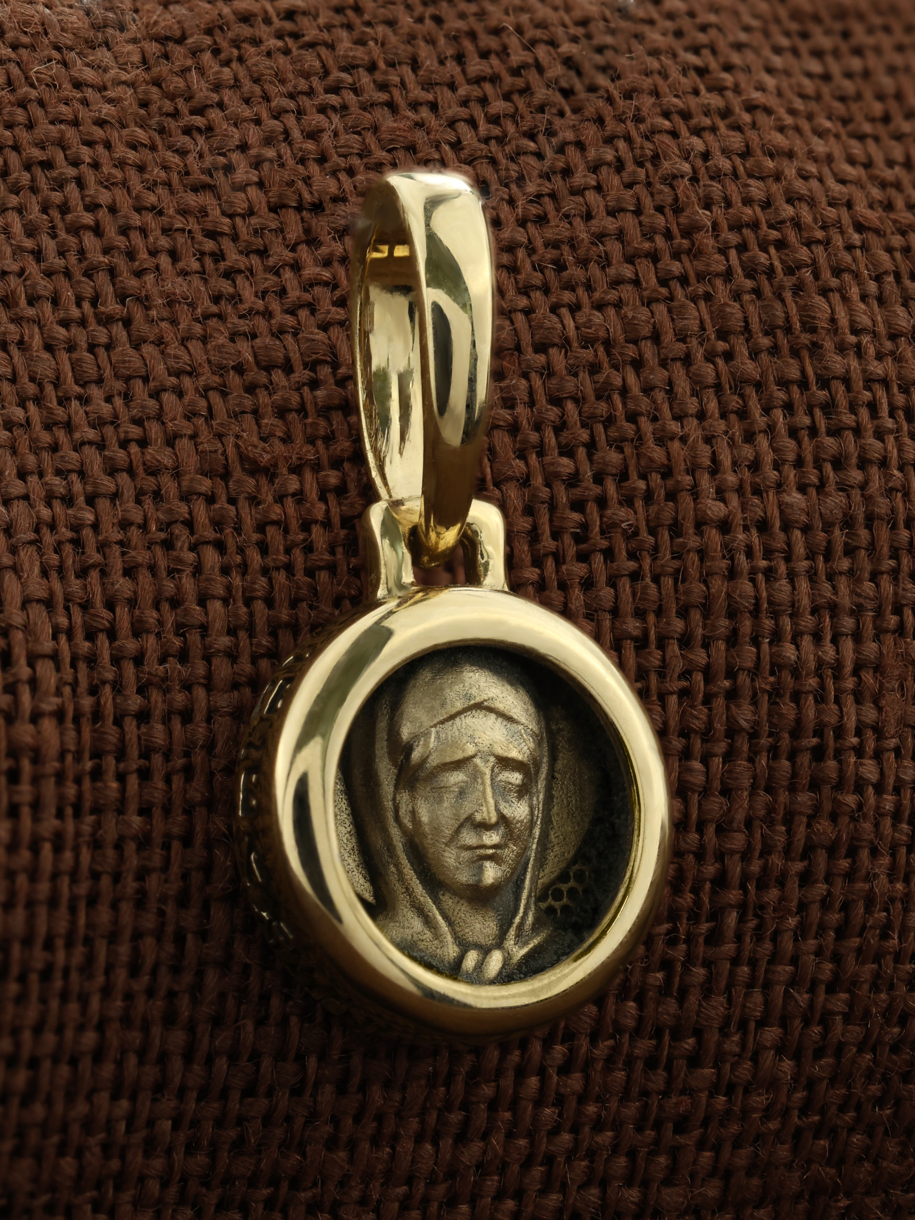На лицевой стороне образка изображена Святая Матрона Московская. Родилась блаженная Матрона (Матрона Дмитриевна Никонова) в 1881 г. в деревне Себино Тульской губернии, недалеко от знаменитого Куликова поля, в бедной, но благочестивой крестьянской семье. Кроме Матроны, в семье уже было трое детей: двое братьев и сестра. Поэтому мать Матроны решила отдать будущего ребенка в приют, но увидела вещий сон. Еще не родившаяся дочь явилась ей во сне в виде белой птицы с человеческим лицом и закрытыми глазами и села ей на правую руку. Приняв сон как знамение, богобоязненная женщина отказалась от мысли отдать ребенка в приют. Дочь родилась слепой, но мать любила свое «дитя несчастное».