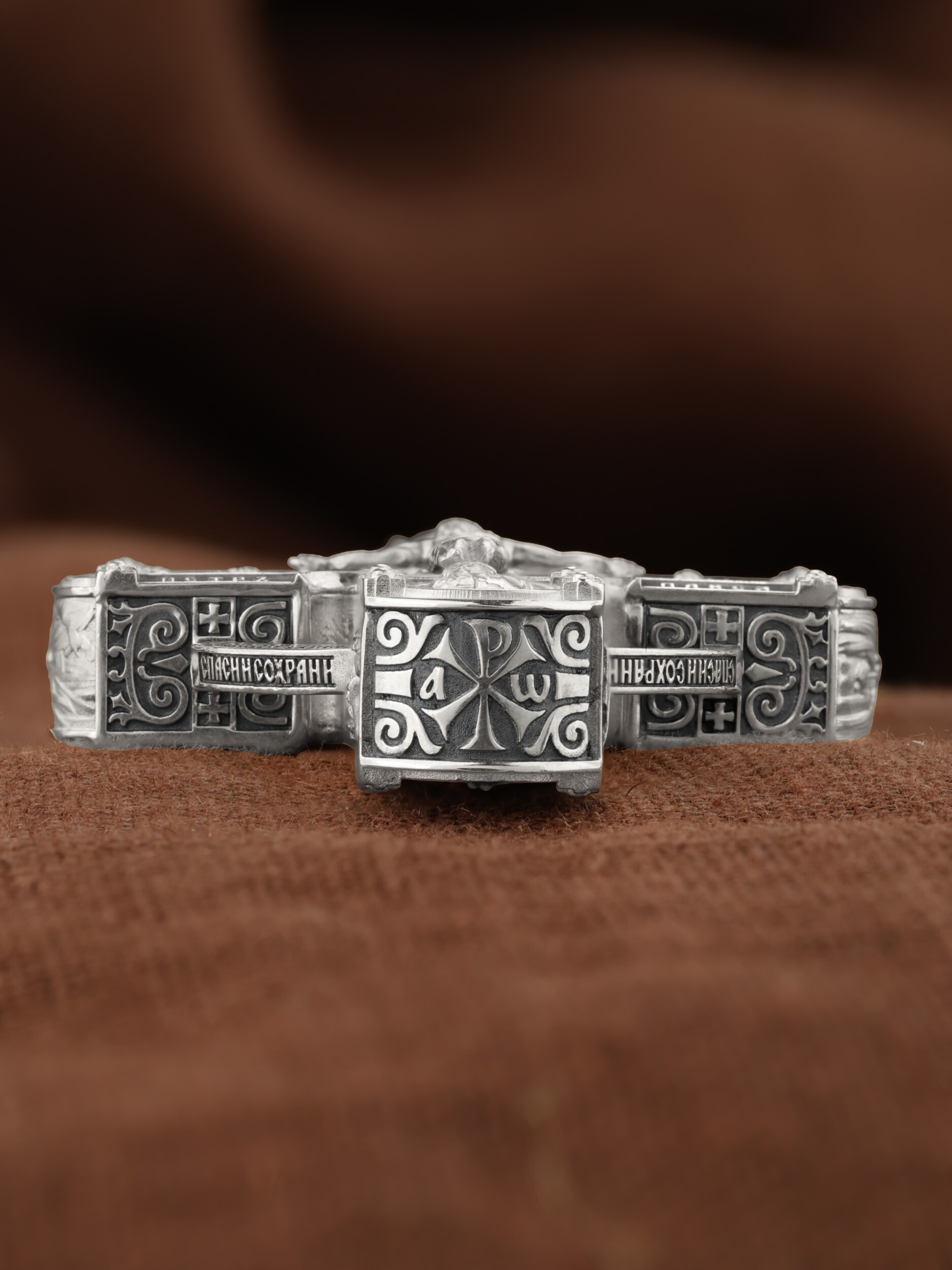 Крест объединяет в одной фигуре два христианских символа — круг-нимб и крест. На лицевой стороне креста изображено Распятие Господа и Спасителя нашего Иисуса Христа. Крест — символ спасения и искупления рода человеческого, знамение победы над смертью и адом. Распятие сопровождается каноническими надписями. На верхней табличке, выше головы Иисуса, расположена надпись, составленная Понтием Пилатом — «IНЦI». Она означает «Иисус Назорей, Царь Иудейский». Надписи «IC» «ХC», что означает Иисус Христос и «Сын Божий» размещается на разных сторонах поперечной перекладины креста. Вдоль Распятия размещены надписи «Царь Славы», «НИКА» (греч. — Победитель) и «МЛРБ» — «место лобное рай бысть» означает место лобное стало раем». Крест стоит на горе камней, символизирующих Голгофу. В ее основании различается череп — это голова Адама. Вдоль креста изображены орудия Страстей Христовых: копие сотника Лонгина, которым пронзили подреберье мёртвого Иисуса, чтобы убедиться в Его смерти, и трость с губкой, с которой Иисуса напоили уксусом. Они обозначены буквами «К» и «Т». Слева от Распятия помещены лики Пречистой Богородицы и Апостола Петра, справа изображены Апостол и евангелист Иоанн Богослов и Апостол Павел. Над Распятием изображен Святой Ангел-Хранитель, ниже — икона Божией Матери «Семистрельная». По кругу размещена молитва: «Кресту Твоему поклоняемся, Владыко, и Святое Воскресение Твое славим». На кулонном кольце помещено изображение Креста «Голгофа», на котором был распят Господь и Спаситель наш Иисус Христос.