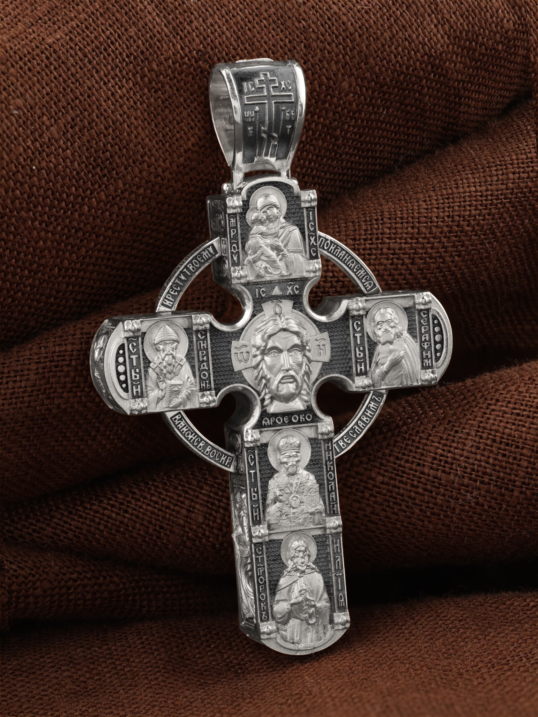 В центре оборотной стороны креста размещен образ Господа и Спасителя нашего Иисуса Христа  — Господь Вседержитель или Пантократор (от греч. всевластный, всесильный). Именование Иисуса «Вседержителем» указывает, с одной стороны, на Его Божественную природу: «Аз есмь Альфа и Омега, начало и конец, говорит Господь, Который есть и был и грядет, Вседержитель» (Откр. 1: 8). С другой стороны, такое именование связано и с человеческой природой Христа, искупившего крестной жертвой людские грехи и обновившего тем самым человеческую природу. Над образом изображена икона Божией Матери «Владимирская», ниже — образы святителя Николая Чудотвореца, архиепископа Мир Ликийских и пророка Ильи. Слева изображен святитель Спиридон Тримифунтский, справа — преподобный Серафим Саровский. На кулонном кольце размещен образ шестикрылого Серафима.
