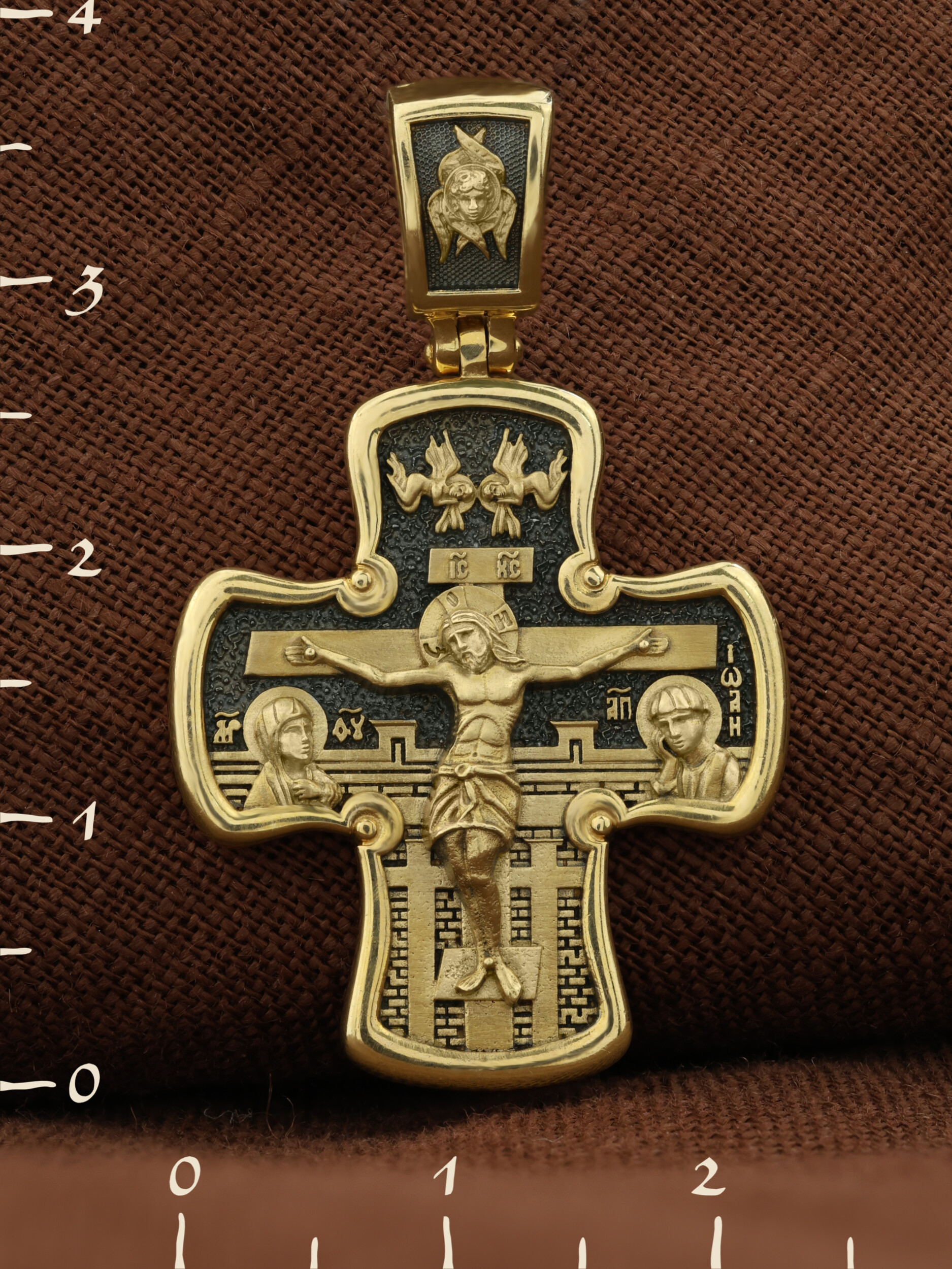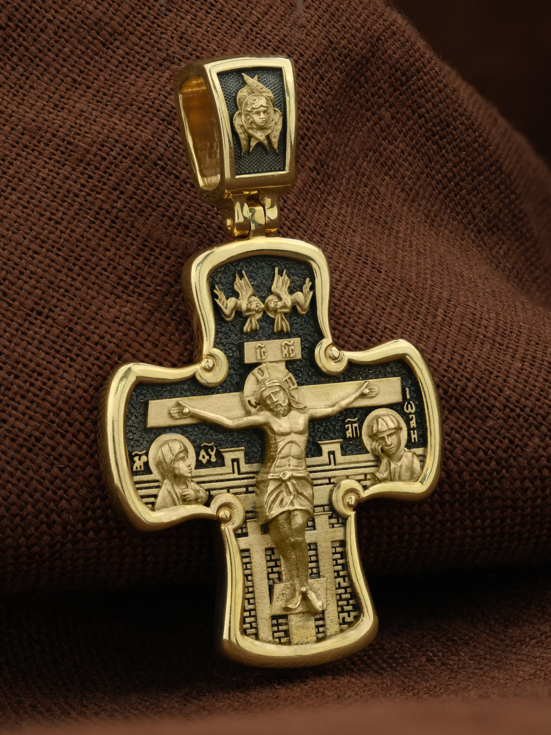 Лицевая сторона креста по канону посвящена Господу Иисусу Христу. Чаще всего на нательных крестах изображается Распятие, которое символизирует победу над грехом и смертью. Своими страданиями Господь искупил грехи человечества: умерев и сошествовав во ад, Он победил дьявола, освободил души праведников от вечной смерти и открыл им Небесные врата рая. Жертва Христа сделала возможным спасение для каждого человека. Поэтому на православных крестах Господь изображается не страдающим, а словно возносящимся и обнимающим весь мир. Он — Спаситель человечества, поправший смертию смерть и призывающий к Себе «все концы земли» (Ис. 45, 22). С двух сторон от Христа изображаются Его Мать, Пресвятая Богородица, и любимый ученик, апостол Иоанн Богослов. Они стояли у Креста неотлучно до самого конца, пока Господь не предал дух Свой Небесному Отцу. Позади — Иерусалимская стена. На иконах она обозначает место казни и символизирует Небесный Иерусалим, путь в который открылся для человечества через Голгофу.