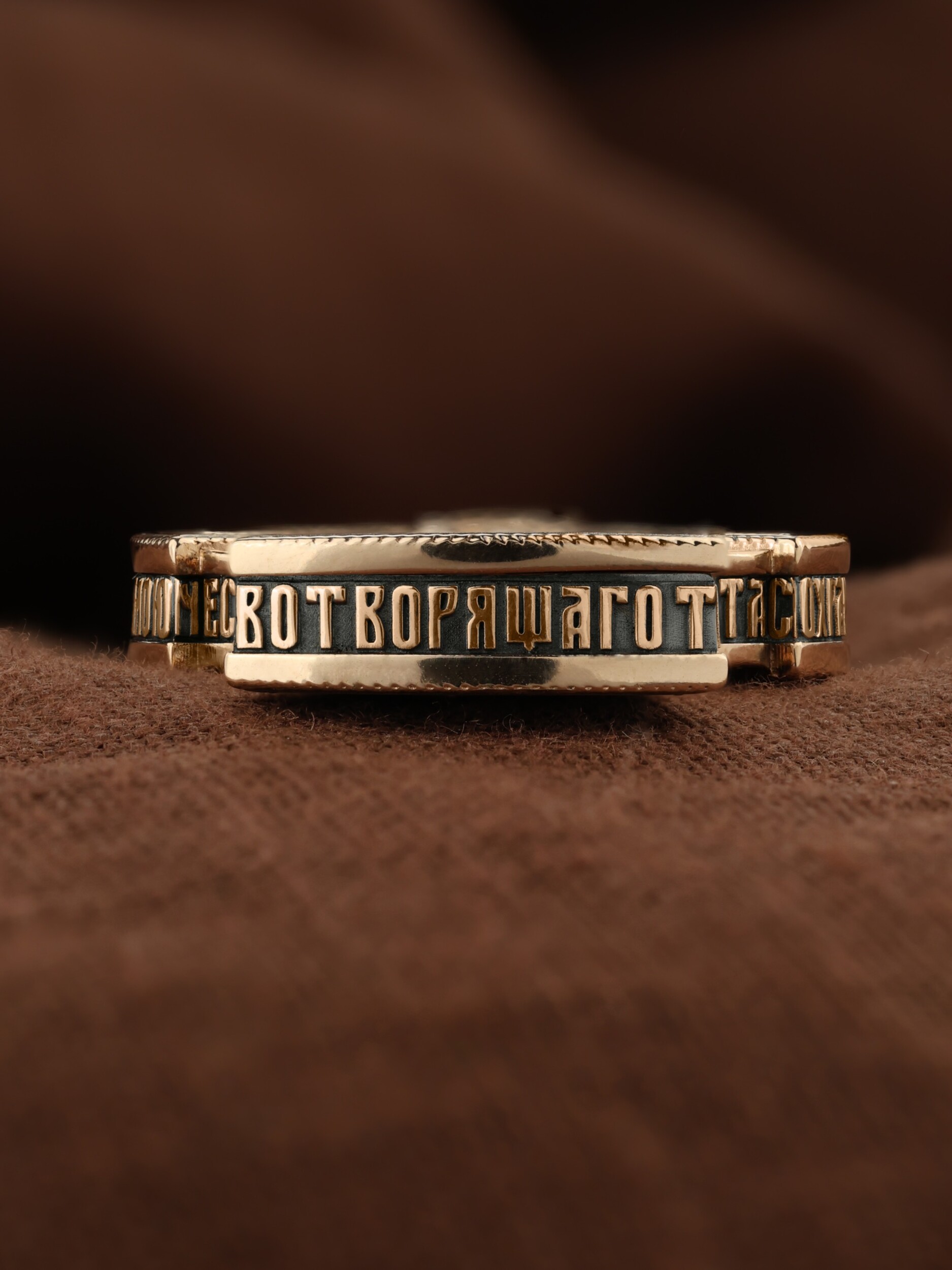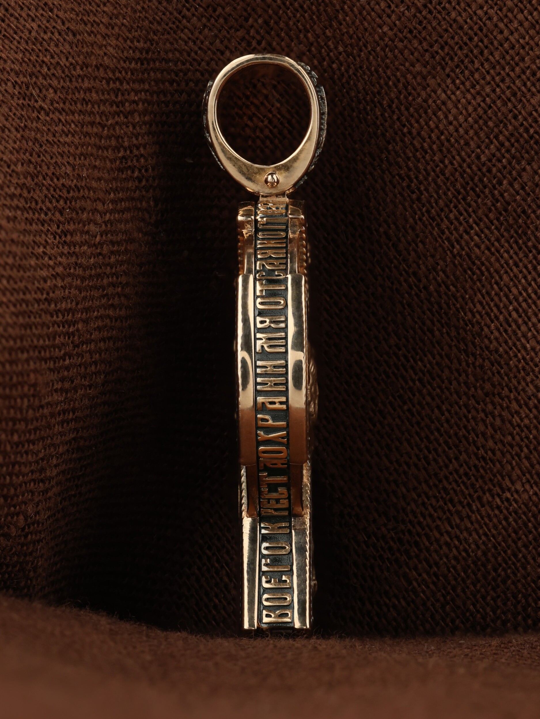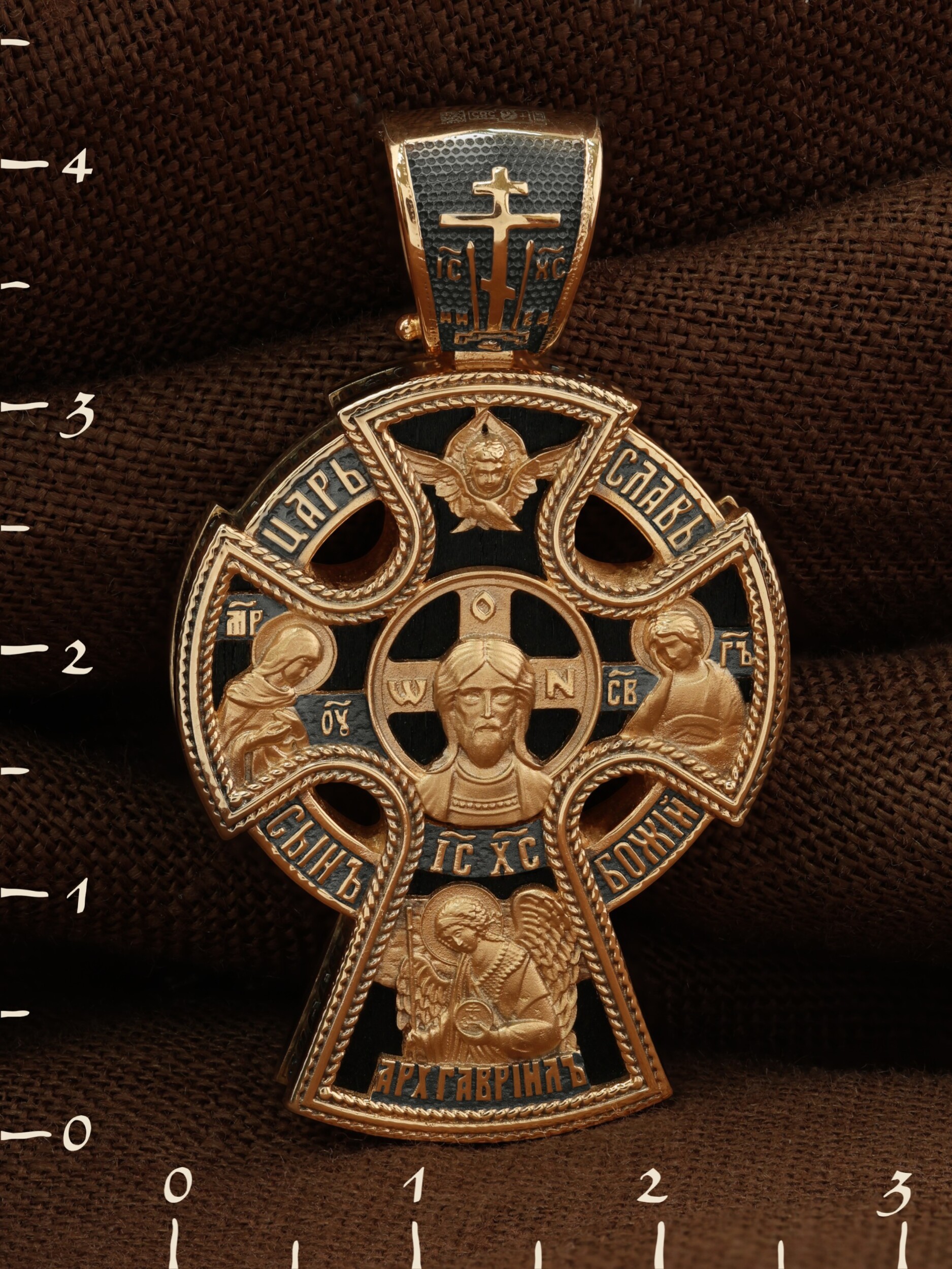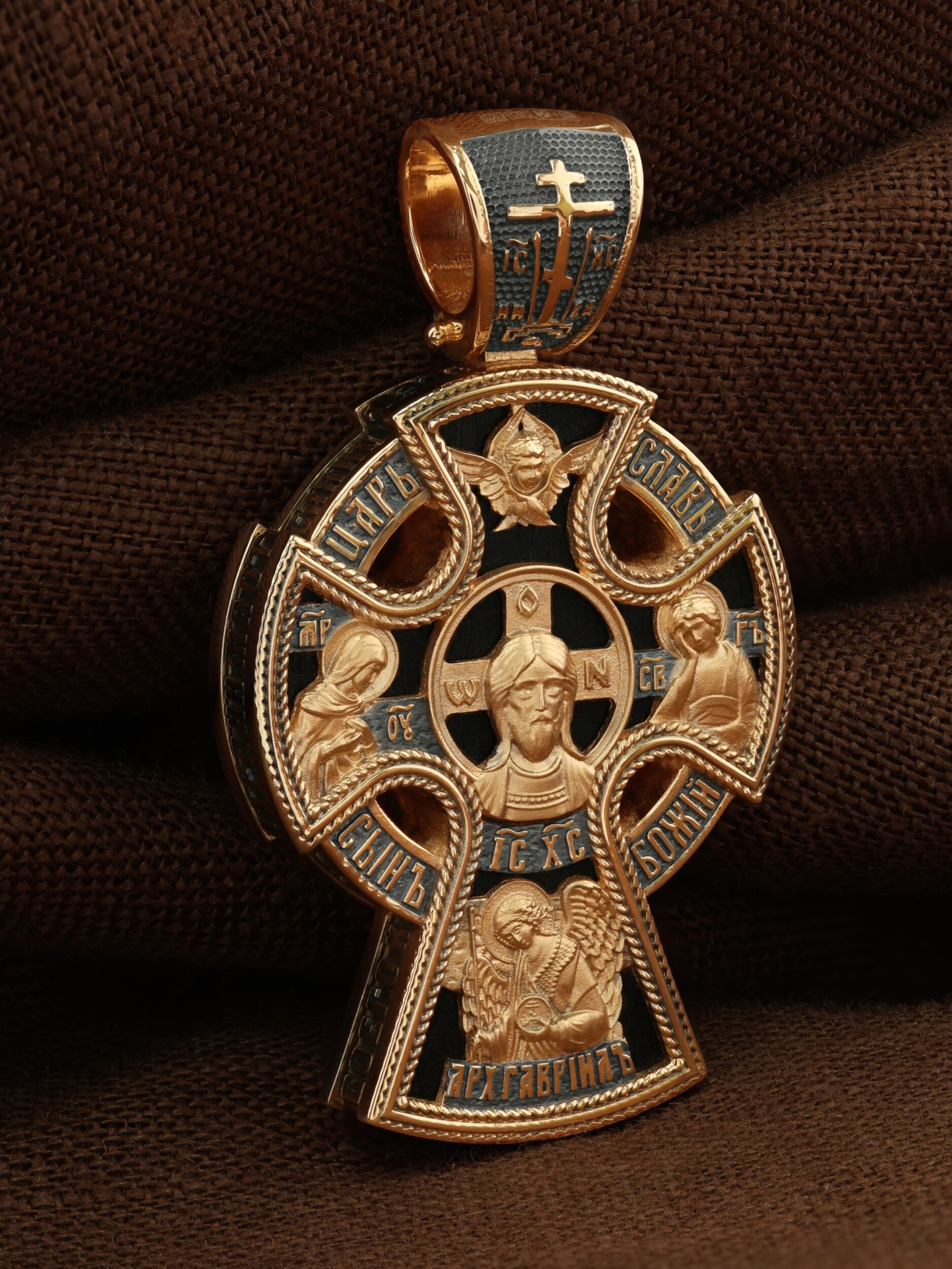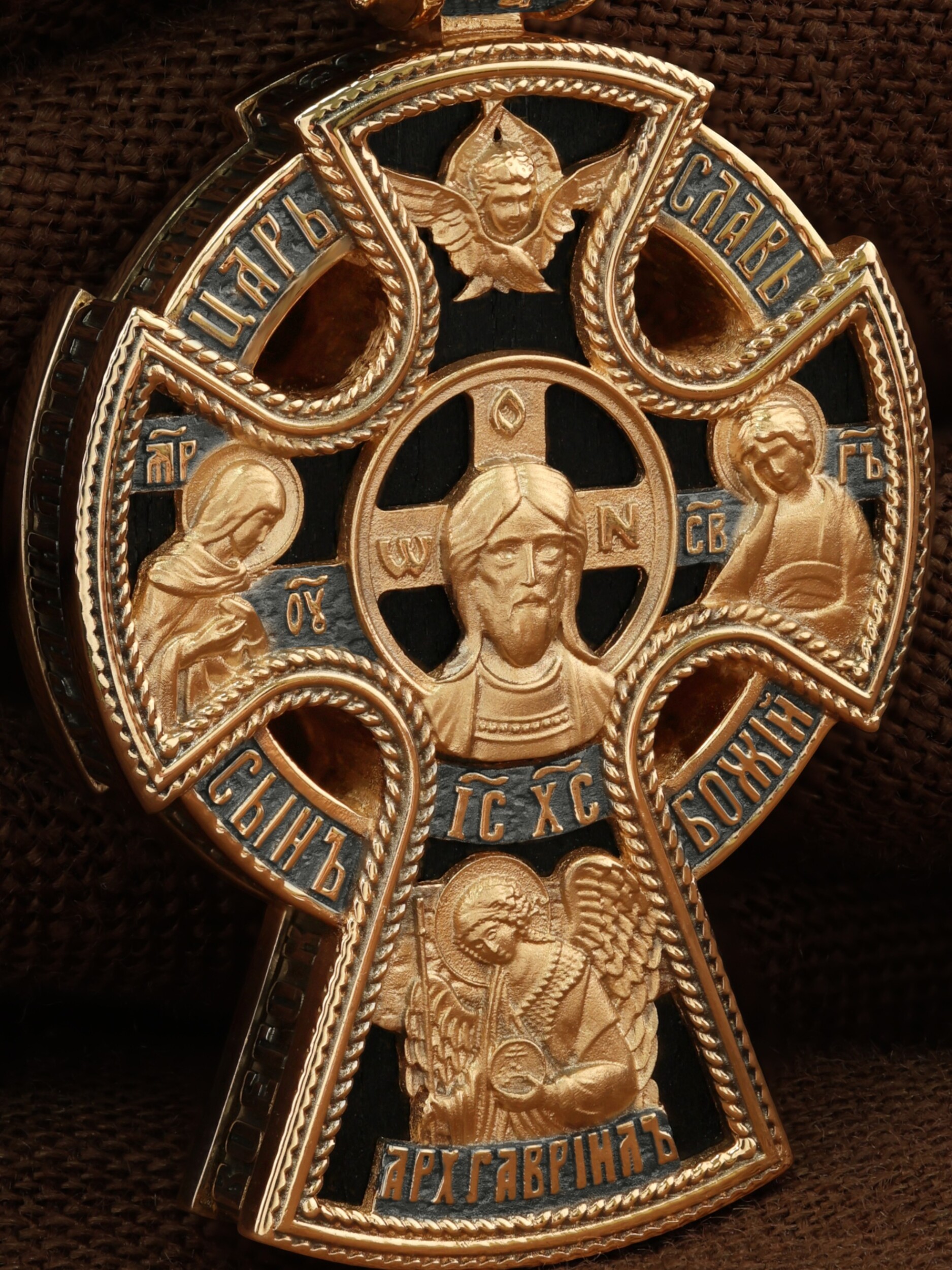 Крест объединяет в одной фигуре два христианских символа — круг-нимб и крест. Крест подобной формы был распространён в Новгородских землях в XIII—XVI веках. В центре лицевой стороны креста размещен образ Господа и Спасителя нашего Иисуса Христа  — Господь Вседержитель или Пантократор (от греч. всевластный, всесильный). Именование Иисуса «Вседержителем» указывает, с одной стороны, на Его Божественную природу: «Аз есмь Альфа и Омега, начало и конец, говорит Господь, Который есть и был и грядет, Вседержитель» (Откр. 1: 8). С другой стороны, такое именование связано и с человеческой природой Христа, искупившего крестной жертвой людские грехи и обновившего тем самым человеческую природу. Крест сопровождается каноническими надписями: «Царь Славы» и «Сын Божий», что означает божественную природу Иисуса Христа, которые размещены по кругу. Слева от образа помещен лик Пречистой Богородицы, скорой помощницы и заступницы рода Христианского. Справа изображен апостол и евангелист Иоанн Богослов, один из ближайших учеников Иисуса Христа. Выше образа размещено изображение шестикрылого Серафима, ниже — Ар¬хан¬гела Гав¬ри¬ила. На кулонном кольце помещено изображение Креста «Голгофа», на котором был распят Господь и Спаситель наш Иисус Христос.
