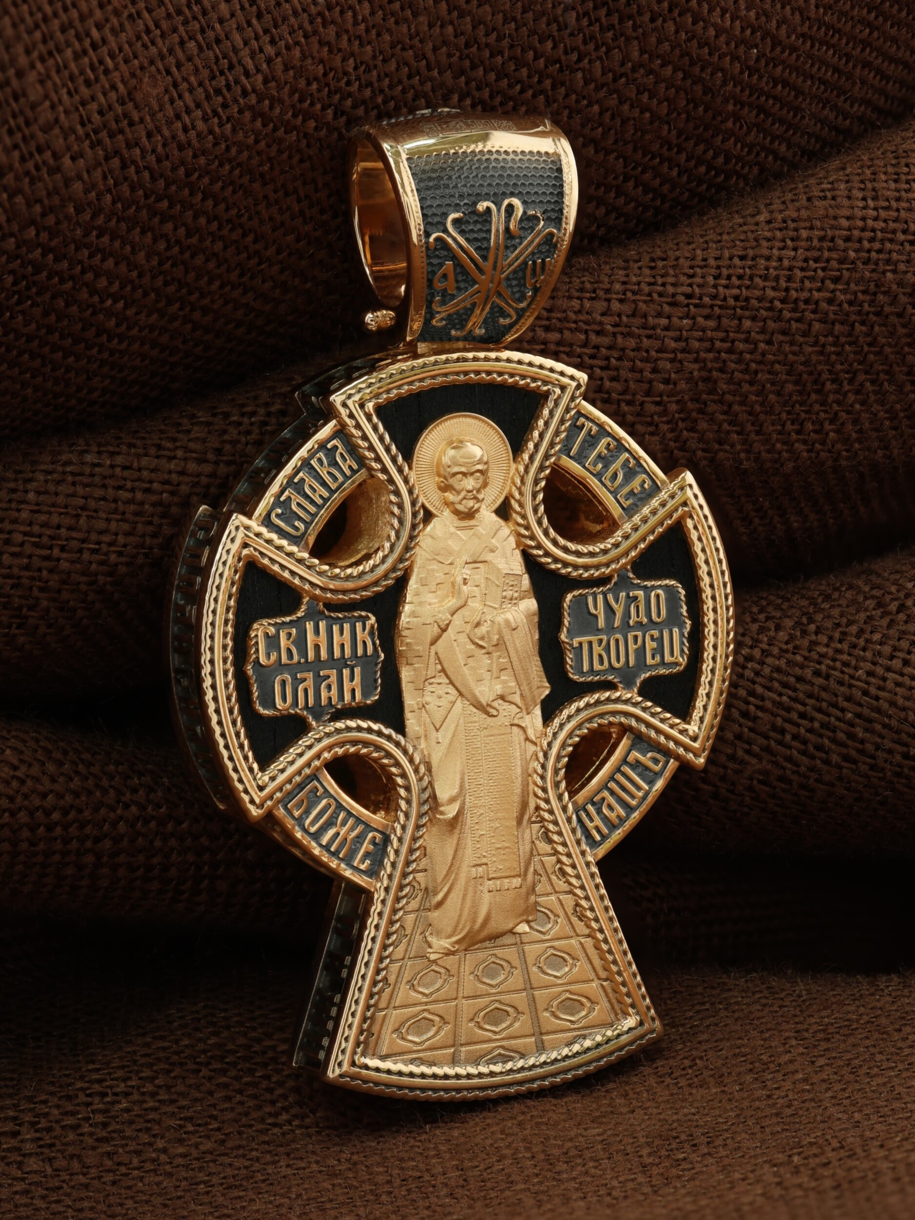 На оборотной стороне креста изображен Святитель Николай Чудотворец, архиепископ Мир Ликийских. Он является одним из самых почитаемых святых в православном мире. Вся жизнь святого Николая — это служение Богу. Из¬бран¬ник Бо¬жий Ни¬ко¬лай стал вершиной всех доб¬ро¬де¬те¬лей, под¬ня¬той до рай¬ской вы¬со¬ты. Чудес его исчислить невозможно. Николай Чудотворец подавал многим исцеления в болезнях и телесных недугах. Обогащал бедствующих в крайней нищете, подавал голодным пищу и всем являлся во всякой нужде готовым помощником, скорым предстателем и защитником. Помогал людям в бедах, спасал от потопления, освобождал из плена и избавлял от смерти. По кругу Креста размещена молитва: «Слава Тебе Боже наш».