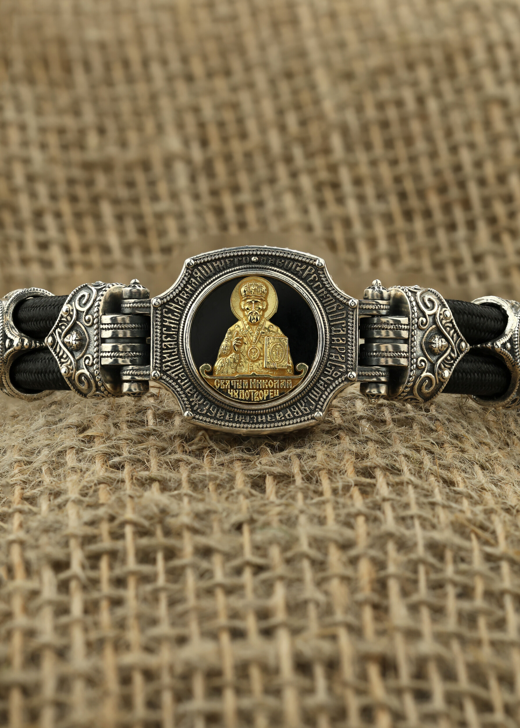 Браслет из серебра и золота c ониксом и шёлковым шнурком