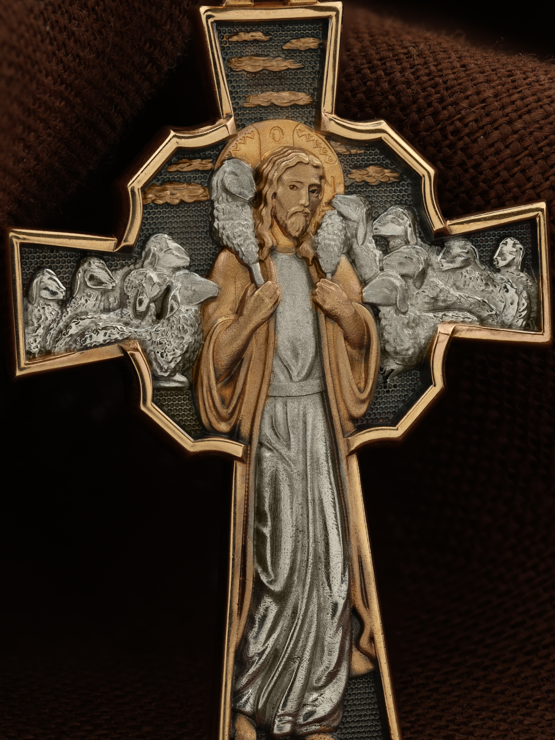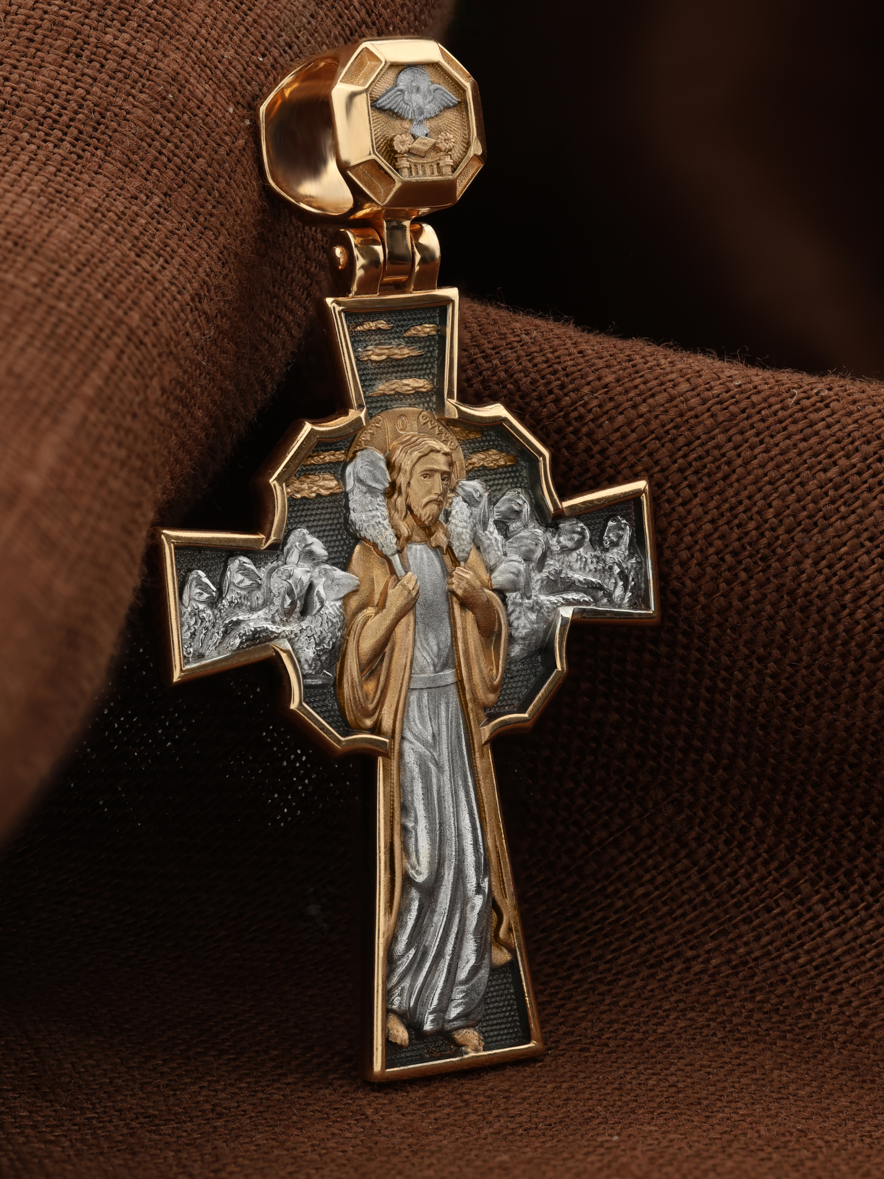 Но обратной стороне креста изображение Иисуса Христа. Добрый Пастырь — символическое именование и изображение Иисуса Христа, заимствованное из Ветхого Завета и повторенное Христом в Новом Завете в своей роли учителя. Иисус изображается с заблудшей овцой, вскинутой на плечи (Лк. 15:3−7).