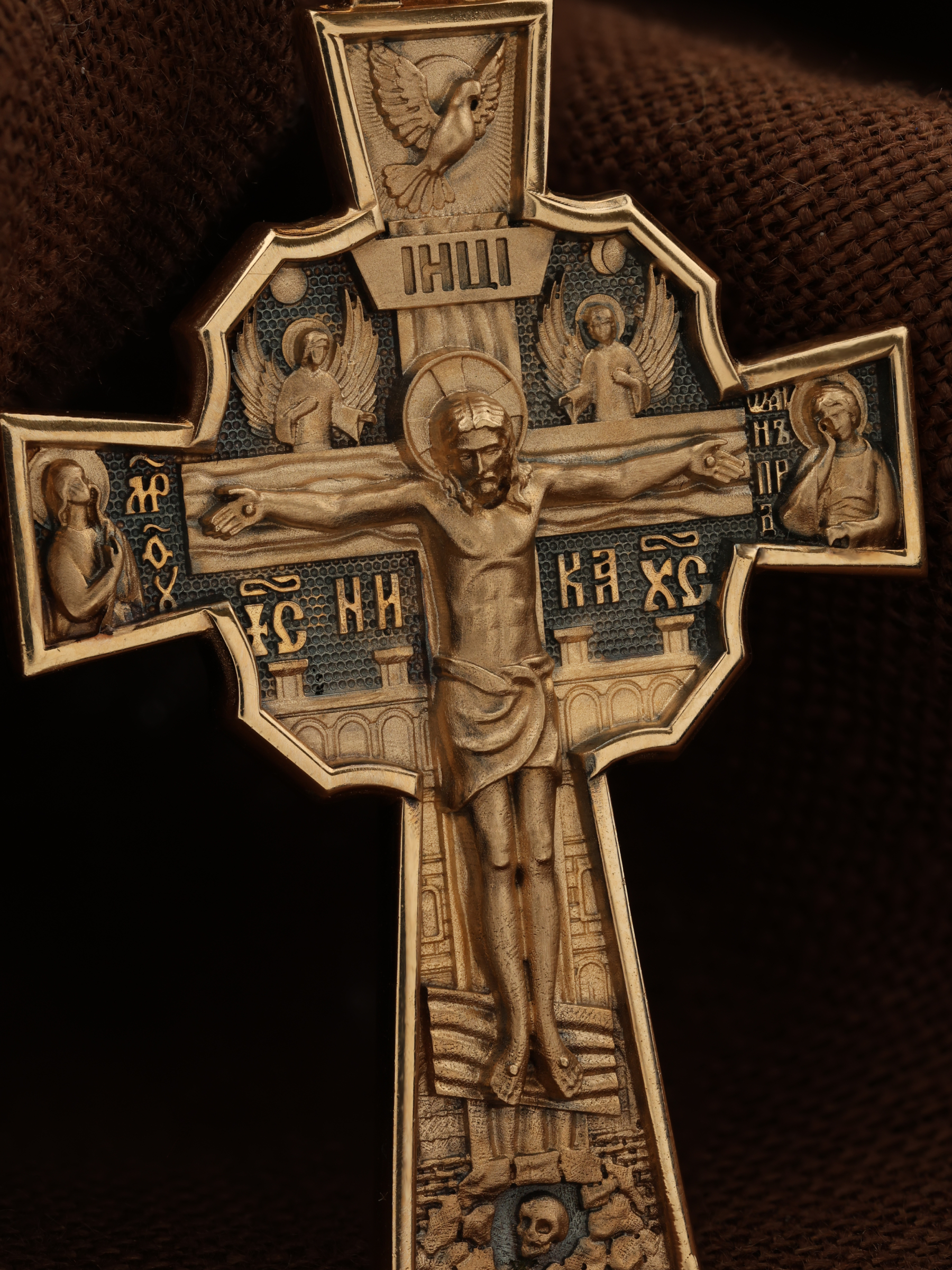 Над Распятием изображен парящий голубь — символ Святого Духа и Его благодати. На кулонном кольце изображен шестикрылый Серафим — самый приближенный к Господу Ангел.