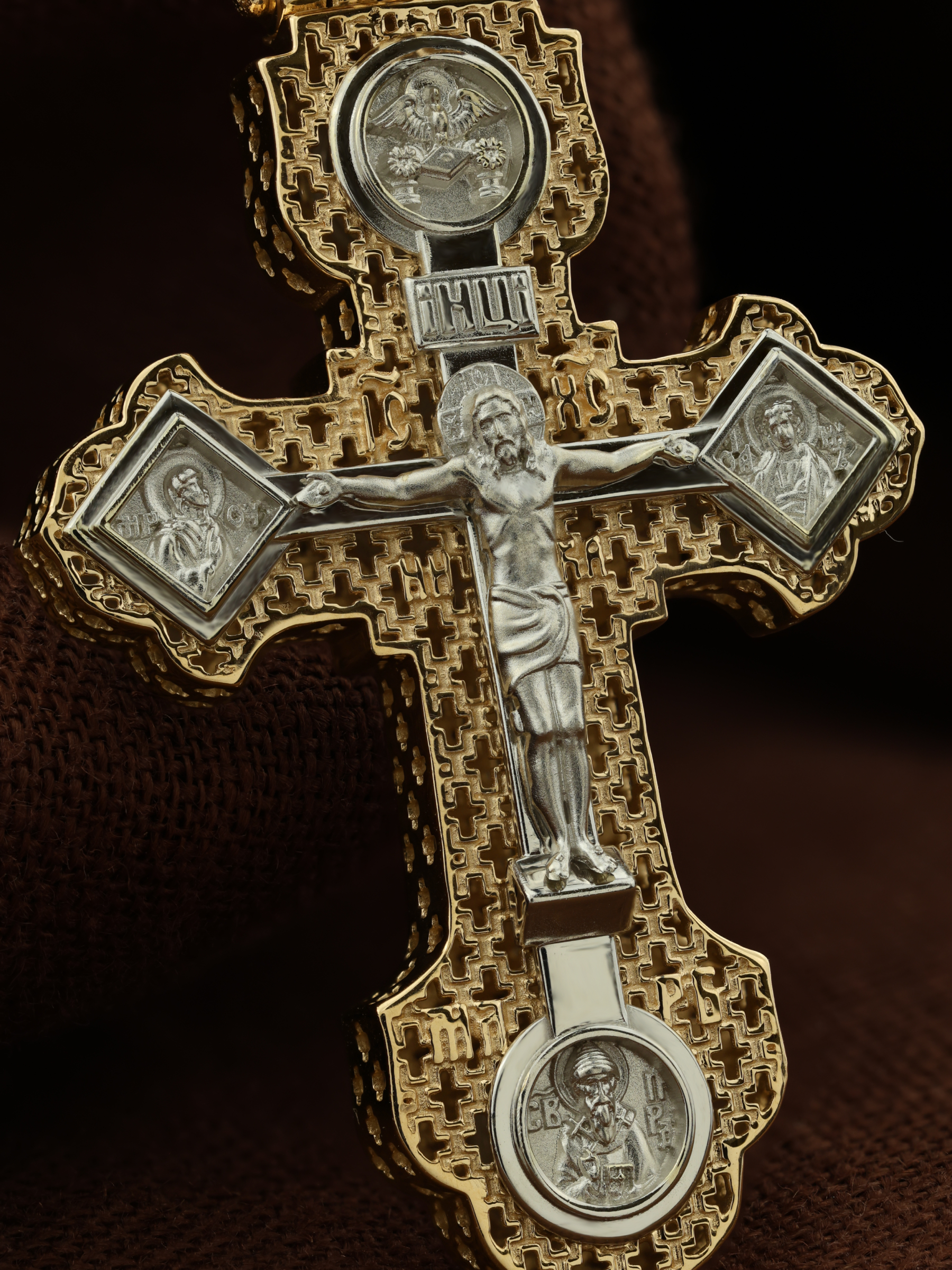 На лицевой стороне креста изображено Распятие Господа и Спасителя нашего Иисуса Христа. Крест- символ спасения и искупления рода человеческого, знамение победы над смертью и адом. Иисус Христос, как искупительная жертва освобождения человечества от власти греха, умер крестной смертью и в третий день воскрес. На верхней табличке, выше головы Иисуса, расположена надпись, составленная Понтием Пилатом — «IНЦI». Она означает «Иисус Назорей, Царь Иудейский». Над перекладиной написано сокращенно имя Спасителя «IC» «XC» — Иисус Христос. Ниже перекладины написано слово «НИКА» (греч. — Победитель). Слева от Распятия помещен лик Пречистой Богородицы, скорой помощницы и заступницы рода Христианского. Слева изображен апостол и евангелист Иоанн Богослов, один из ближайших учеников Иисуса Христа. Над Распятием изображение Этимасии (греч. — готовность) — престола, уготованного для второго пришествия Господа Иисуса Христа, грядущего вершить Суд над живыми и мертвыми (Пс.IX,5−8). Ниже Распятия размещен образ Святителя Спиридона Тримифунтского. На лицевой стороне кулонного кольца изображен Ангел Хранитель, а на оборотной стороне — слова молитвы: «Господи помилуй. Спаси и сохрани».