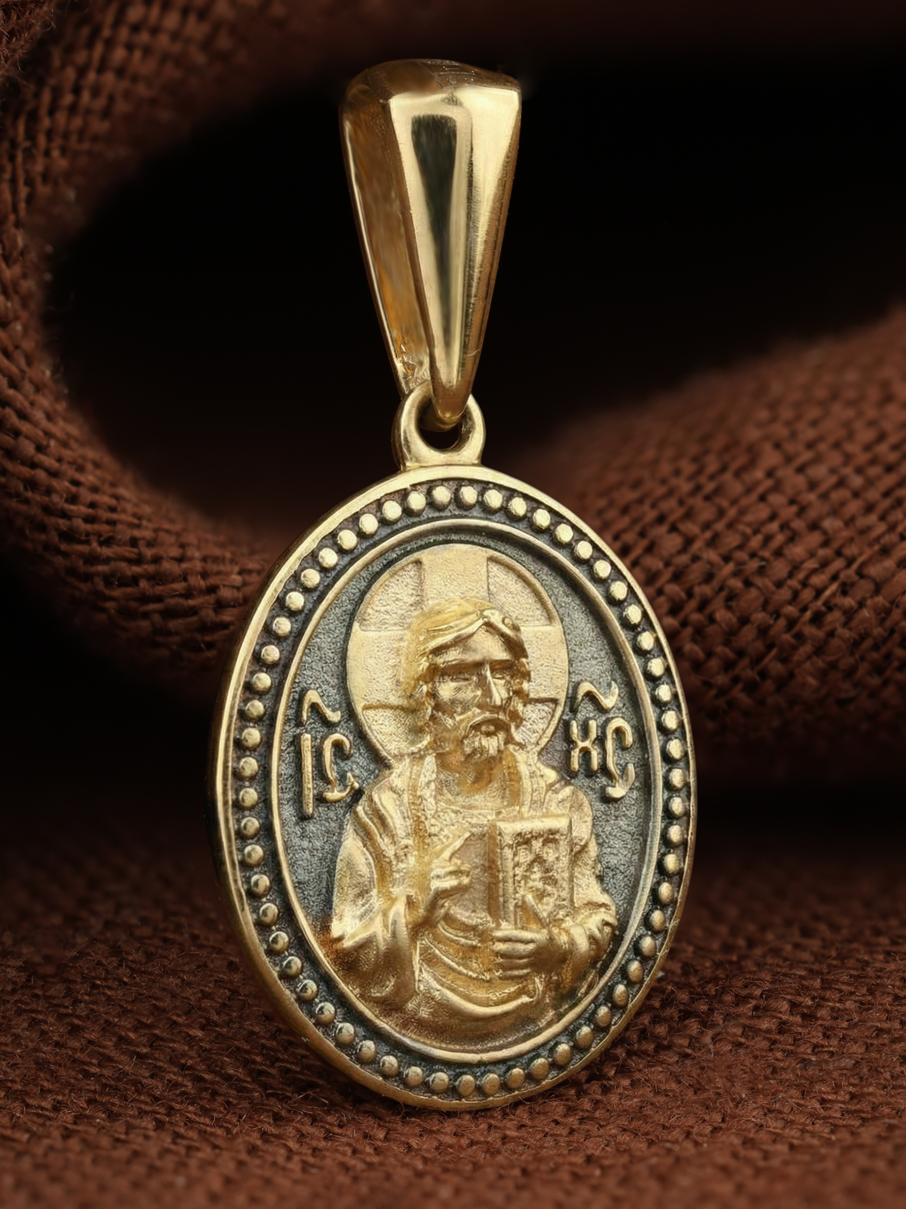 На лицевой части образка изображен Спас Вседержитель или Пантократор (от греч. «панратос» — всевластный, всесильный) — центральный образ в иконографии Христа, представляющий Его как Небесного Царя и Судию. Господь правой рукой благословляет, а в левой держит Книгу Жизни, в которой для каждого человека есть своя страница.