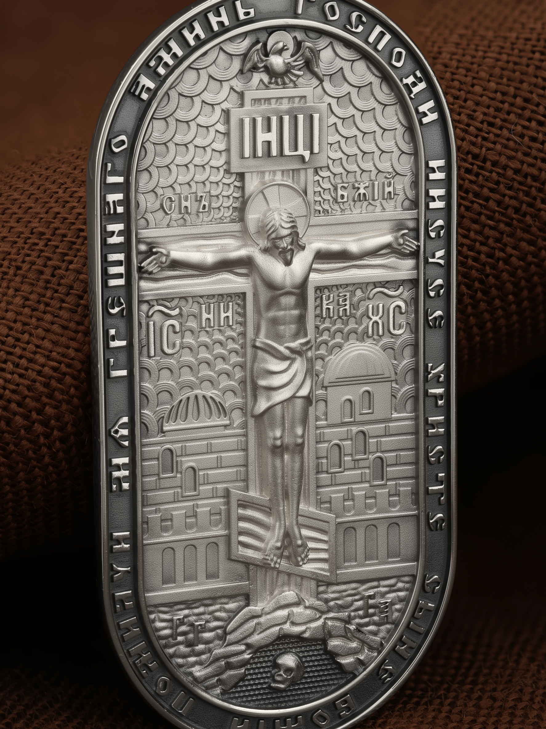 Центральную часть лицевой стороны занимает Распятие Христа — образ жертвы, принесенной Господом за грехи людей. Именно ко Христу, сошедшему на землю ради нашего спасения, возносятся все молитвы. Рядом с Его образом помещены слова — «НИКА» (греч. — Победитель) и «СЫН БОЖИЙ». Эти слова характеризуют Господа как Великого Архиерея, победителя смерти. Также Распятие сопровождается надписями, олицетворяющими Христа — это святое имя Христа «IC» (Иисус) «ХС» (Христос). Верхняя перекладина символизирует собой табличку с надписью «IHЦI» — Иисус Назарянин Царь Иудейский. Возвышение, на котором стоит Крест, символизирует гору Голгофу, на которой произошло Распятие. У подножия Креста изображают прах Адама, обозначенный черепом. На кулонном кольце изображен шестикрылый Серафим — самый приближенный к Господу Ангел. По контуру образка написана молитва: «Господи Иисусе Христе, Сыне Божий, помилуй мя грешного. Аминь»