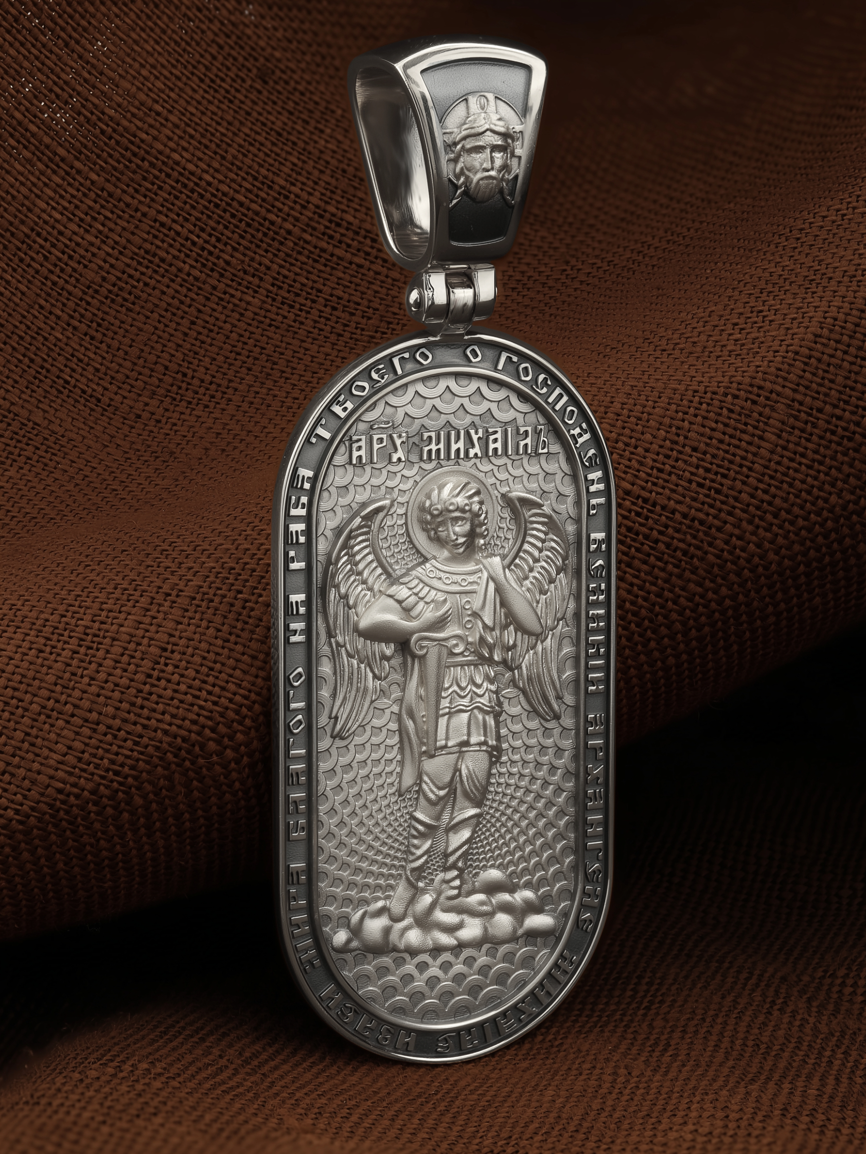 Основой композиции оборотной стороны является ростовое изображение Архангела Михаила — Архистратига всех Небесных Воинств. Он ведет непримиримую войну против сил зла, охраняет райские врата и защищает души людей. По контуру написана молитва: «О, Господень Великий Архангеле Михаиле, излей мира благого на раба Твоего». На кулонном кольце изображен Спас Нерукотворный — Символ вочеловечившегося Божества.