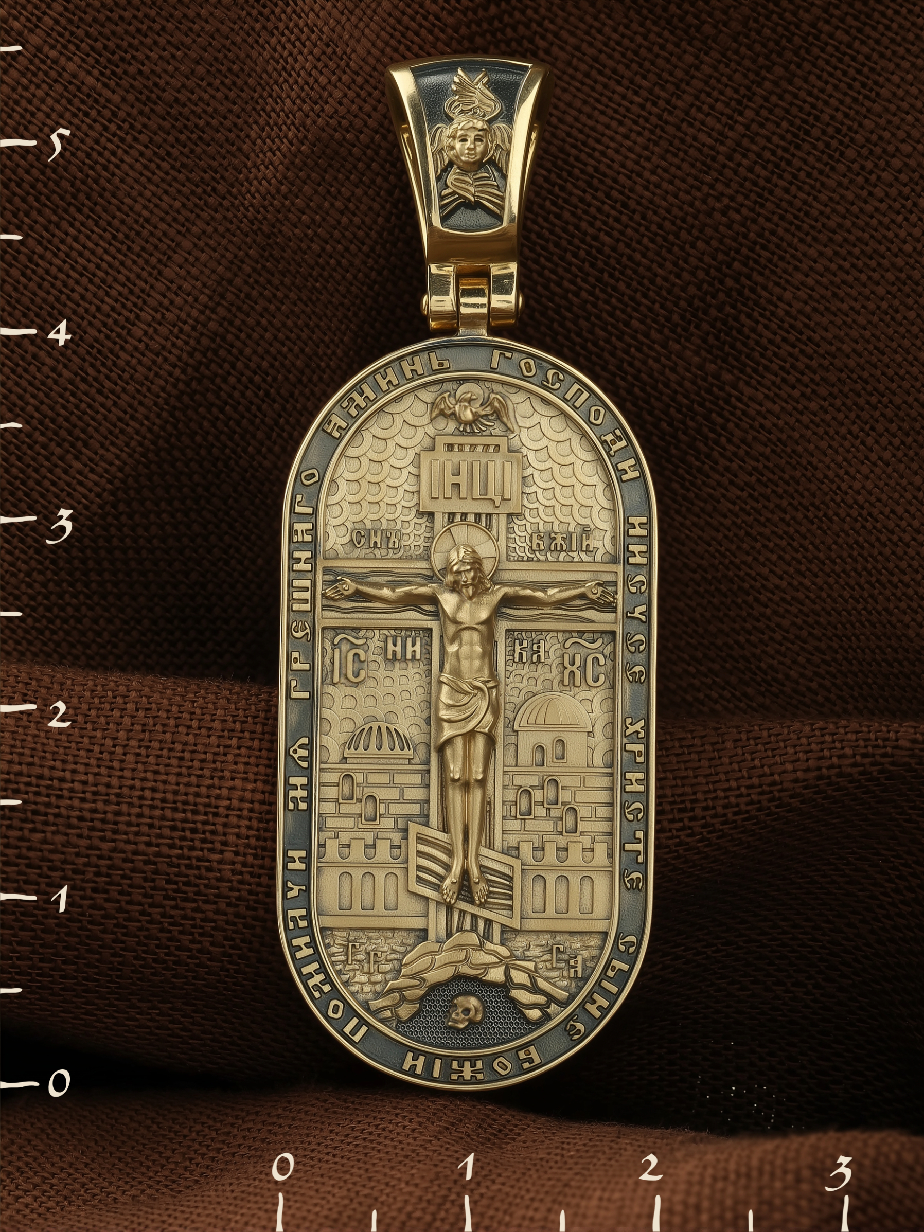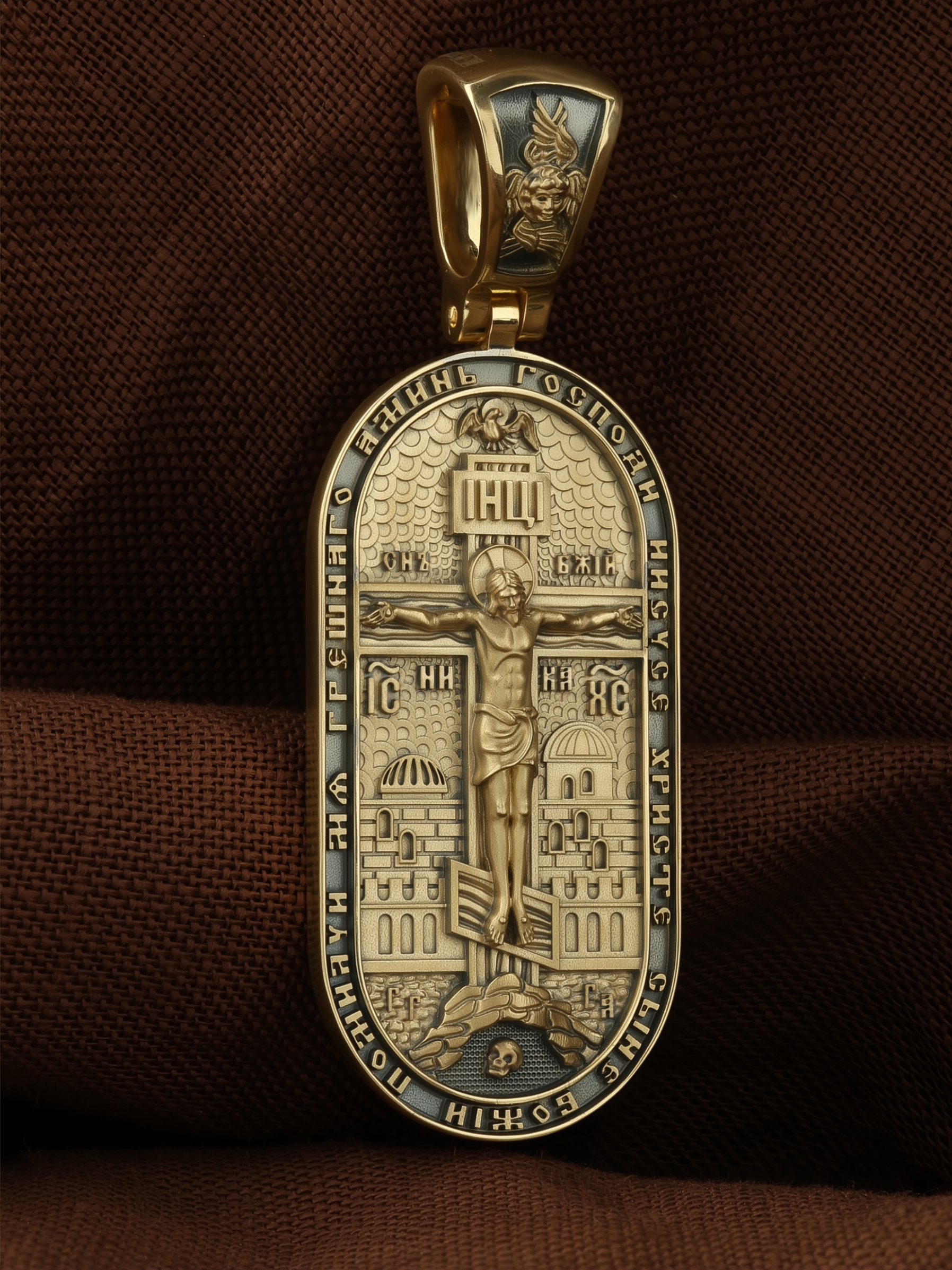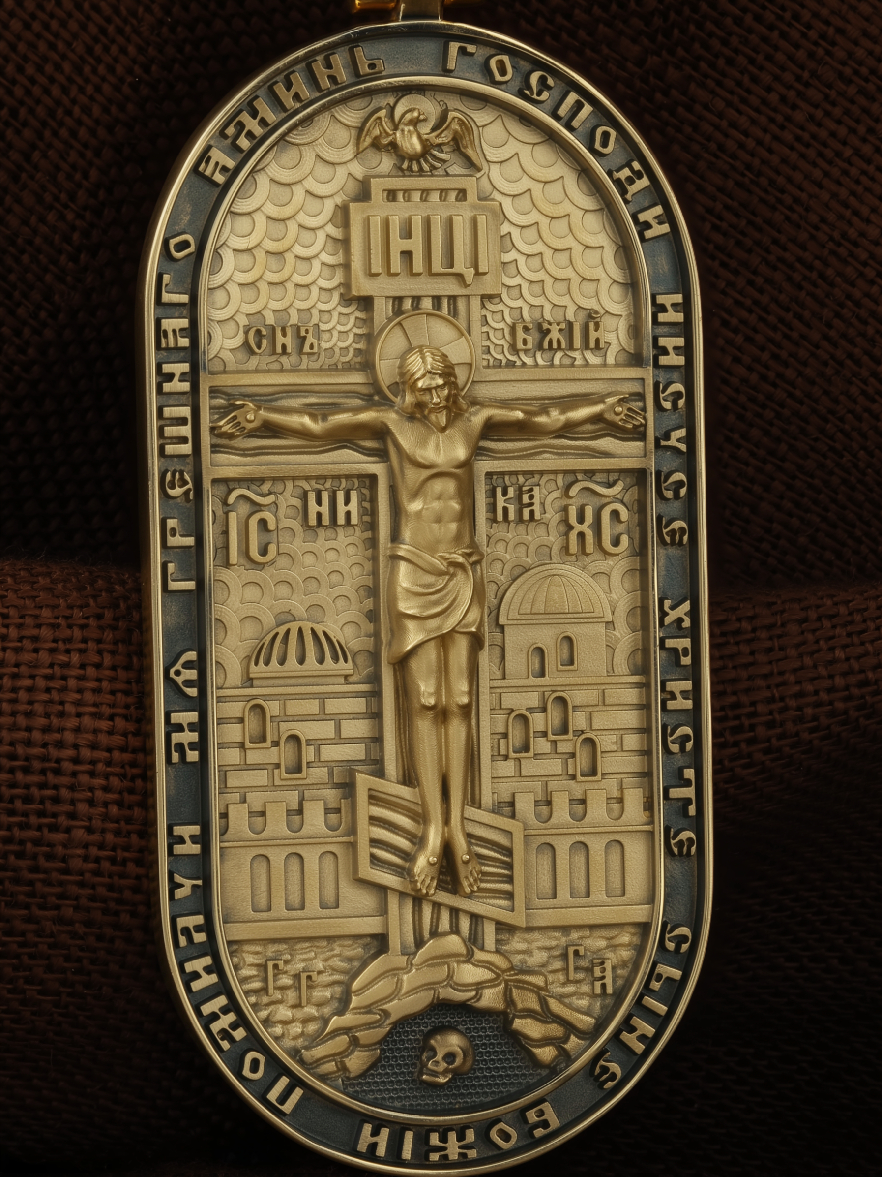 Центральную часть лицевой стороны занимает Распятие, потому что это орудие казни Иисус Христос сделал орудием победы над грехом и смертью. Своими страданиями Он искупил грехи человечества, умерев и сошествовав во ад, победил сатану, освободил души праведников от вечной смерти и открыл им небесные врата рая. Жертва Христа сделала возможным спасение для каждого человека. На православном кресте Христос не умирает, а свободно простирает руки, ладони Иисуса открыты, будто он хочет обнять все человечество, даря им свою любовь и открывая путь к вечной жизни.