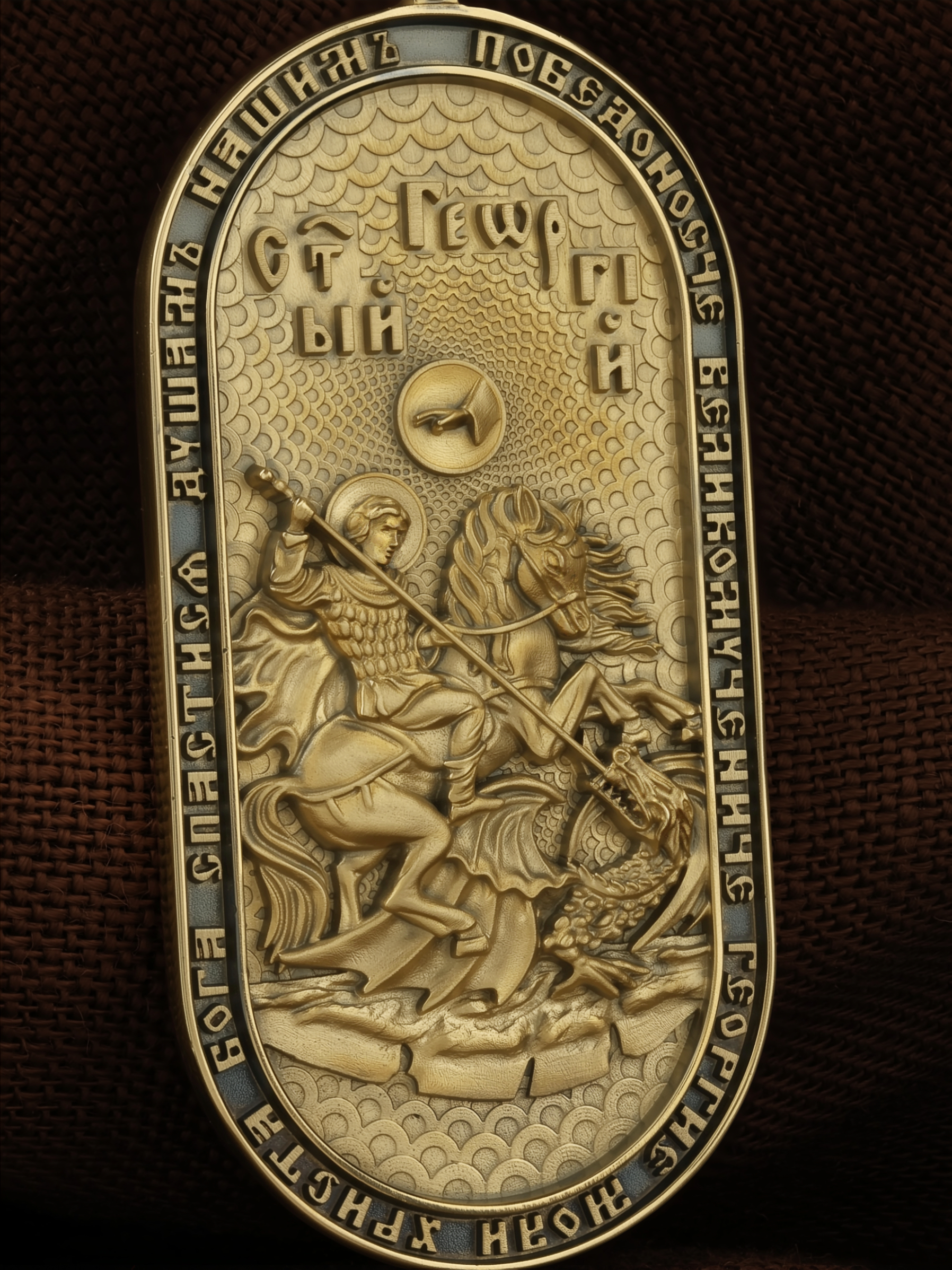 По контуру написана молитва: «Победоносче Великомучениче Георгие, моли Христа Бога спастися душам нашим». На кулонном кольце изображен Спас Нерукотворный — Символ вочеловечившегося Божества.
