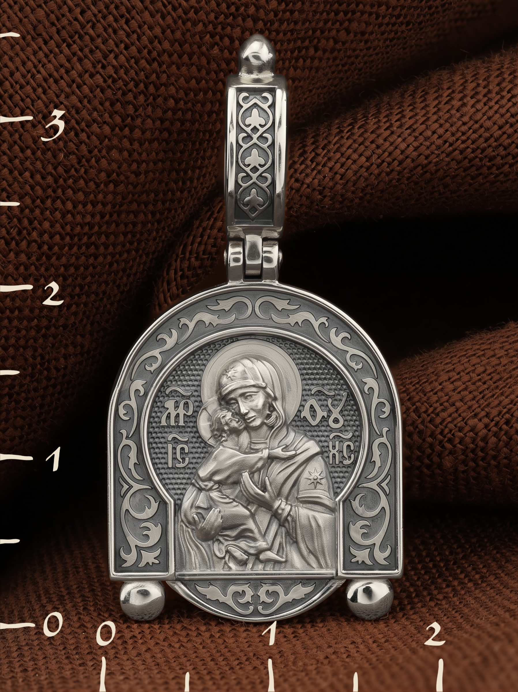 Лицевую сторону возглавляет Владимирская икона Божией Матери — самая Великая русская Святыня, многие века бывшая олицетворением нашей земли. Перед ней венчались на царство государи, избирались патриархи. Пречистой Богородице Владимирской клялись в верности Отечеству солдаты и за нее умирали на поле брани. Именно на ее защиту более всего уповала Россия в самые страшные периоды своей истории. Владимирская икона Божией Матери, по преданию, была написана на доске трапезного стола из дома Иисуса Христа. На Русь она была привезена в начале XII века и с тех пор почитается как главная святыня нашего Отечества. Перед ней молитвенно просят Богородицу об исцелении от телесных недугов, в частности, заболеваний сердца и сердечнососудистой системы. За помощью к ней обращаются во время бедствий, когда нуждаются в защите от врагов.