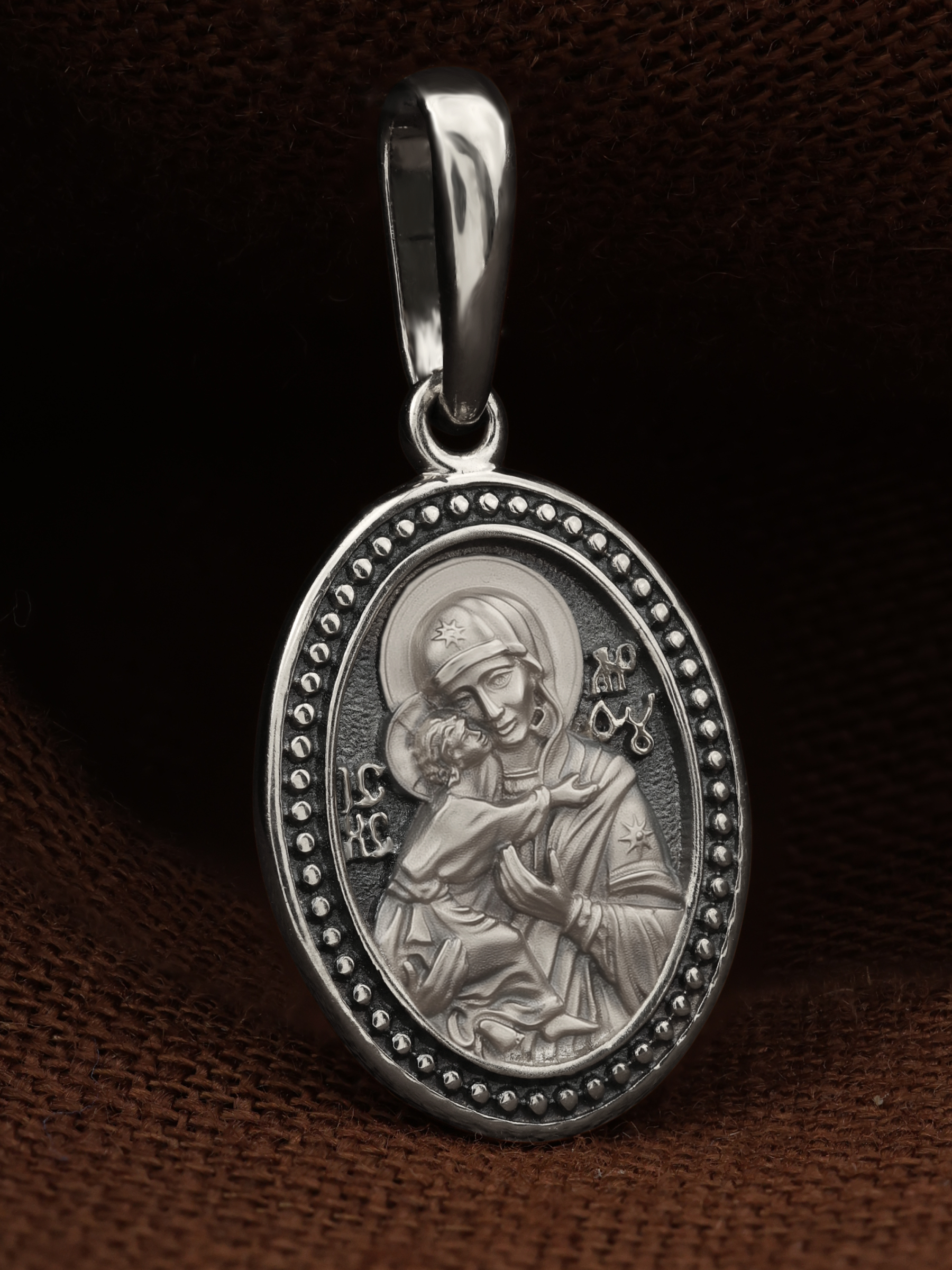 Лицевую сторону возглавляет Владимирская икона Божией Матери. По преданию, она была написана на доске трапезного стола из дома Иисуса Христа. На Русь икона была привезена в начале XII века и с тех пор почитается как главная святыня нашего Отечества. Перед ней молитвенно просят Богородицу об исцелении от телесных недугов, в частности, заболеваний сердца и сердечно-сосудистой системы. За помощью к Владимирской иконе Божией Матери обращаются во время бедствий, когда нуждаются в защите от врагов.