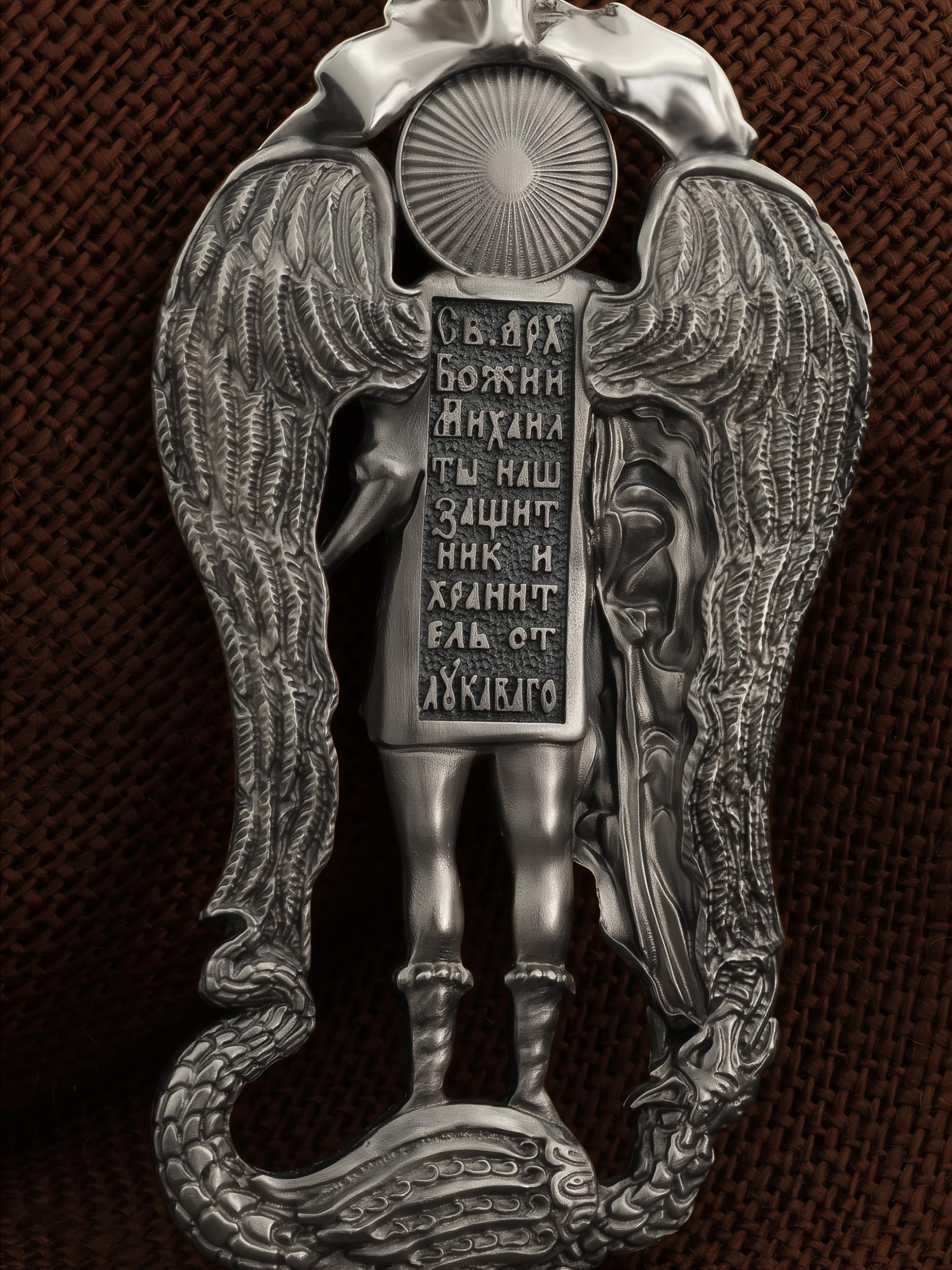 На обороте образка написана молитва Архангелу Михаилу: «Святой Архангел Божий Михаил! Ты наш защитник и хранитель от лукавого.»