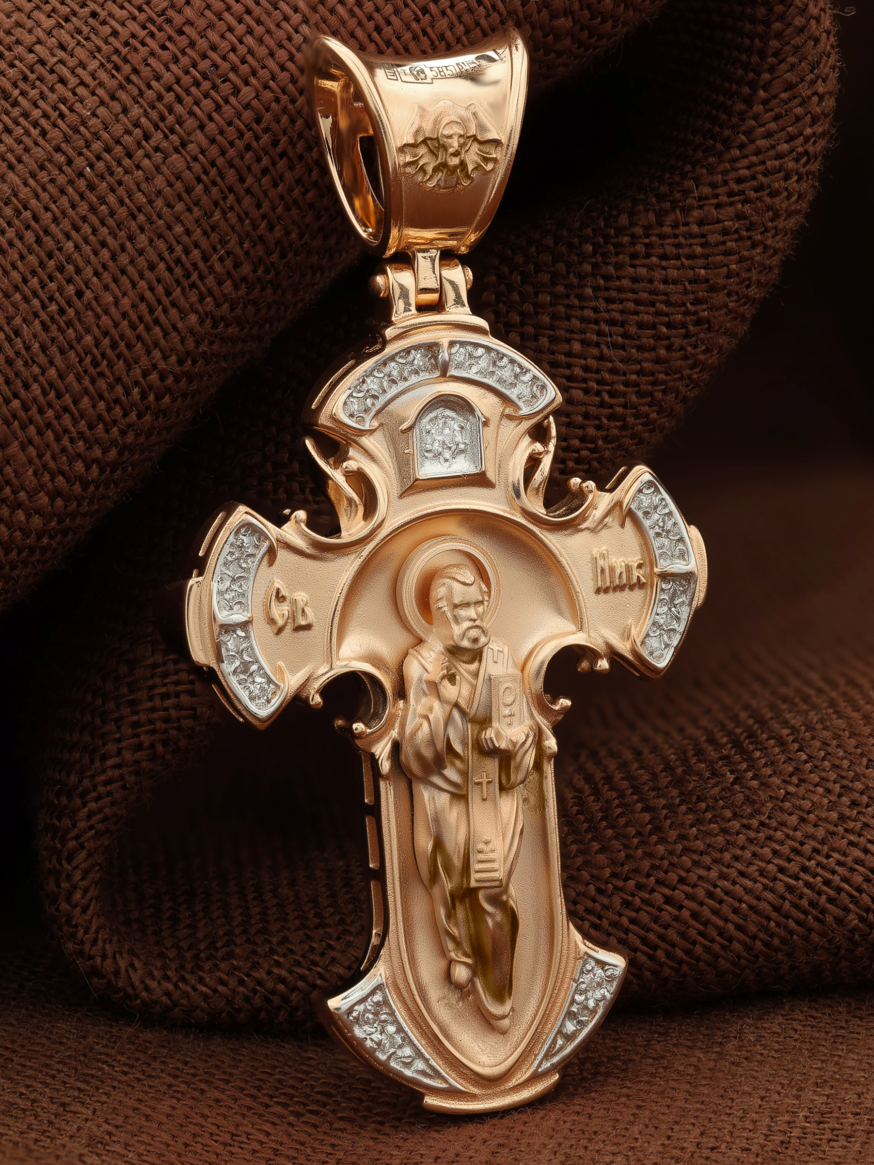 Оборотную сторону креста возглавляет икона святителя Николая Чудотворца. На кулонном кольце помещено изображение Спаса Нерукотворного — образ Спасителя, который Он запечатлел на плате и передал для исцеления больному проказой царю Эдессы. ему придается победное и защитное значение.