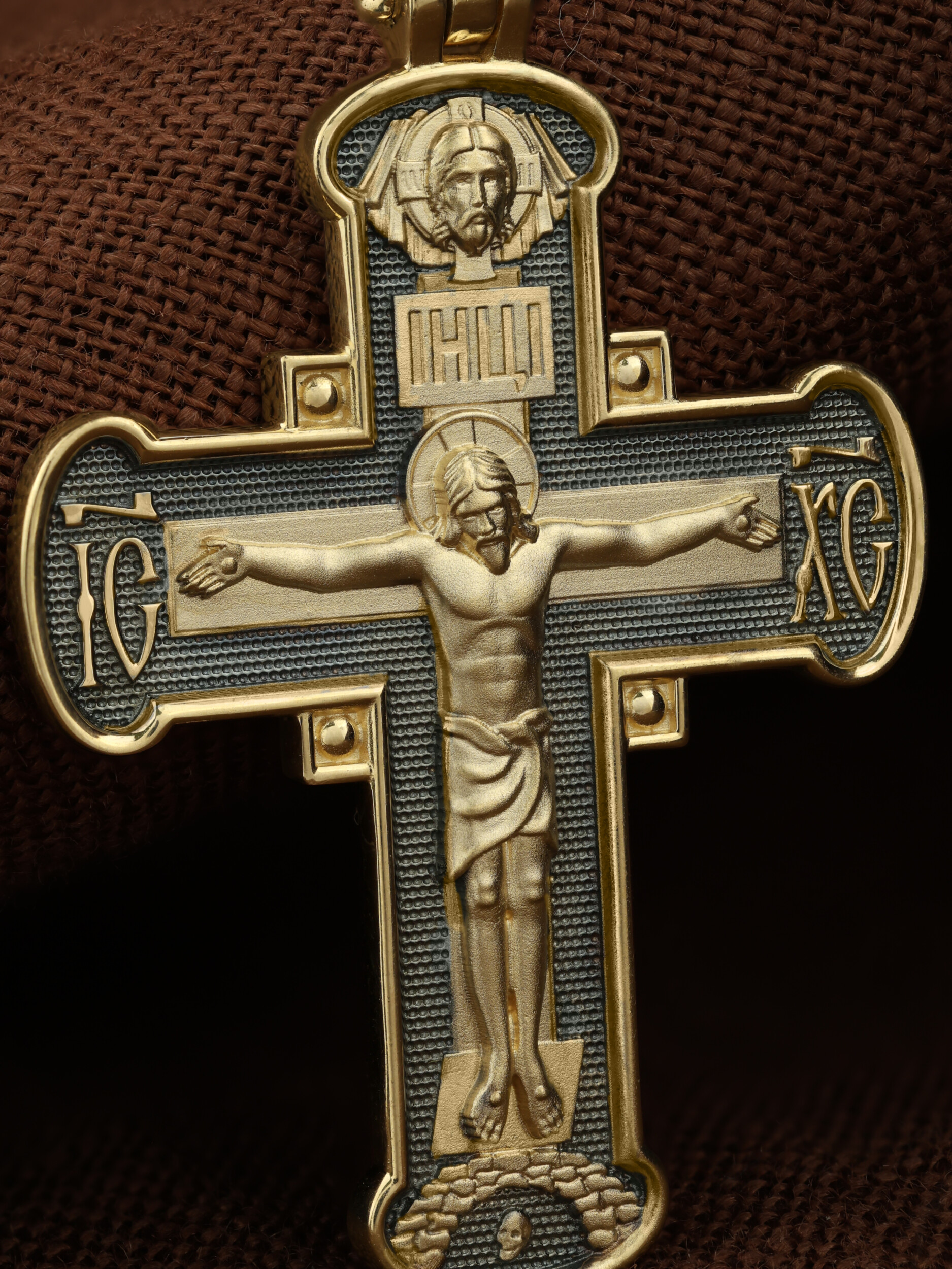 На лицевой стороне креста изображено Распятие Господа и Спасителя нашего Иисуса Христа, отдавшего Себя на смерть, для искупления грехов мира. Крест является символом жертвенной любви Всеблагого Бога к падшим людям, всепобеждающим духовным оружием христиан, основанием и средоточием церковной жизни. Господь сказал: «кто хочет идти за Мною, отвергнись себя, и возьми крест свой, и следуй за Мною». (Мк. 8: 34). На кулонном кольце помещена надпись «Царь Славы». На верхней табличке, выше головы Иисуса, расположена надпись, составленная Понтием Пилатом — «IНЦI». Она означает «Иисус Назорей, Царь Иудейский». Над ней — Нерукотворный образ Господа и Спасителя нашего Иисуса Христа, чудесно отпечатавшийся на плате, котором Христос вытер свой лик. Надпись «IC» «ХC», означает Иисус Христос, помещается на разных сторонах поперечной перекладины креста. Крест стоит на горе камней, символизирующих Голгофу. В ее основании различается череп– это голова Адама.