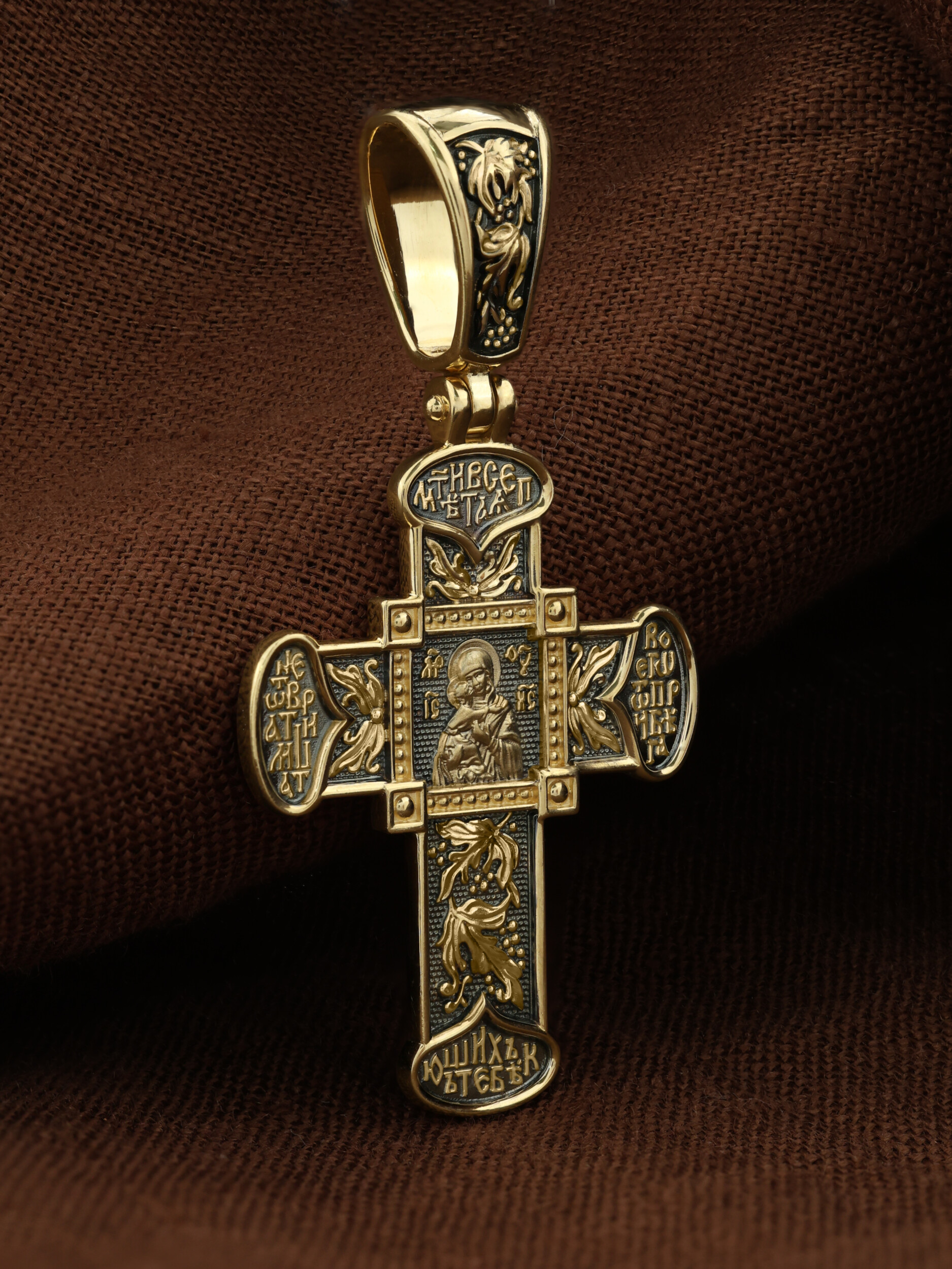 В центре оборотной стороне креста помещен образ Владимирской иконы Божией Матери — один из самых чтимых святынь Русской православной церкви. По преданию, икона была написана Святым апостолом и евангелистом Лукой во время земной жизни Богородицы. Дева Мария, увидев Свое изображение, молвила: «Отныне ублажат Мя вси роди. Благодать Рождшегося от Меня и Моя с сим образом да будет». Образ написан в лирическом иконографическом типе «Умиление». Младенец припал щекой к щеке Матери и тянется к ней правой рукой, другой нежно обнимая за шею. Икона Владимирской Божией Матери вплоть до V века находилась в Иерусалиме, затем была перевезена в Византию. На Русь икона была привезена в 1131 г. За прошедшие столетия святыня неоднократно переезжала из Владимира в Москву и обратно, не раз спасая страну от захватчиков. Русская Православная Церковь установила троекратное празднование Владимирской иконе Божией Матери. Каждый из дней празднования связан с избавлением русского народа от порабощения иноплеменниками по молитвам ко Пресвятой Богородице. В последующие века у иконы происходили многие важные исторические события: подписание актов, принятие присяги значимых государственных деятелей и возведение на престол. Вокруг образа, по сторонам Креста, написана молитва: «Мати Всепетая, не отврати лица Твоего от прибегающих к Тебе». Оборотная сторона креста украшена растительным орнаментом.