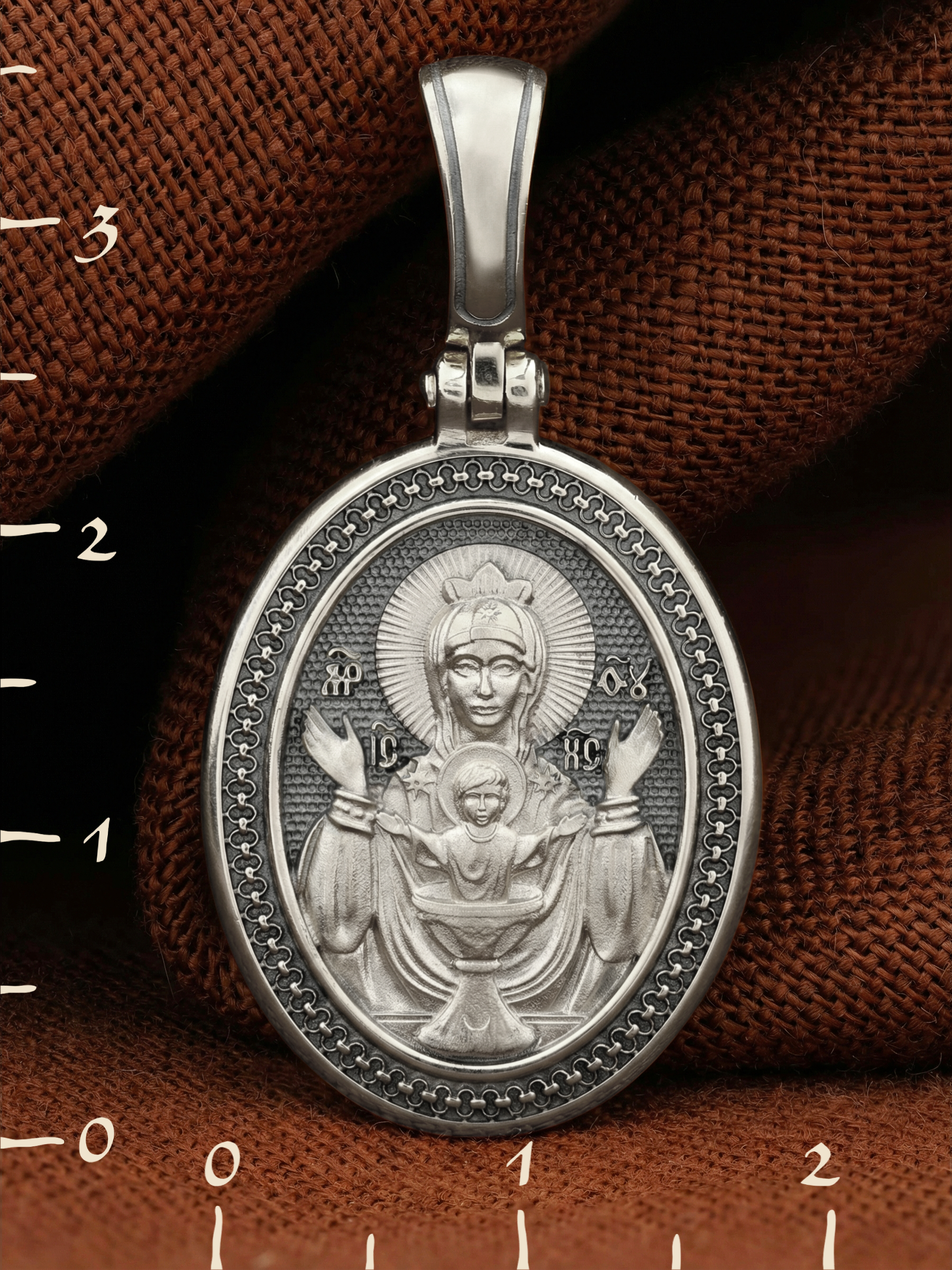 На лицевой части образка изображена икона Божией Матери «Неупиваемая чаша». Икона славится помощью в исцелении зависимостей, помогает людям обрести свободу от греховных страстей.