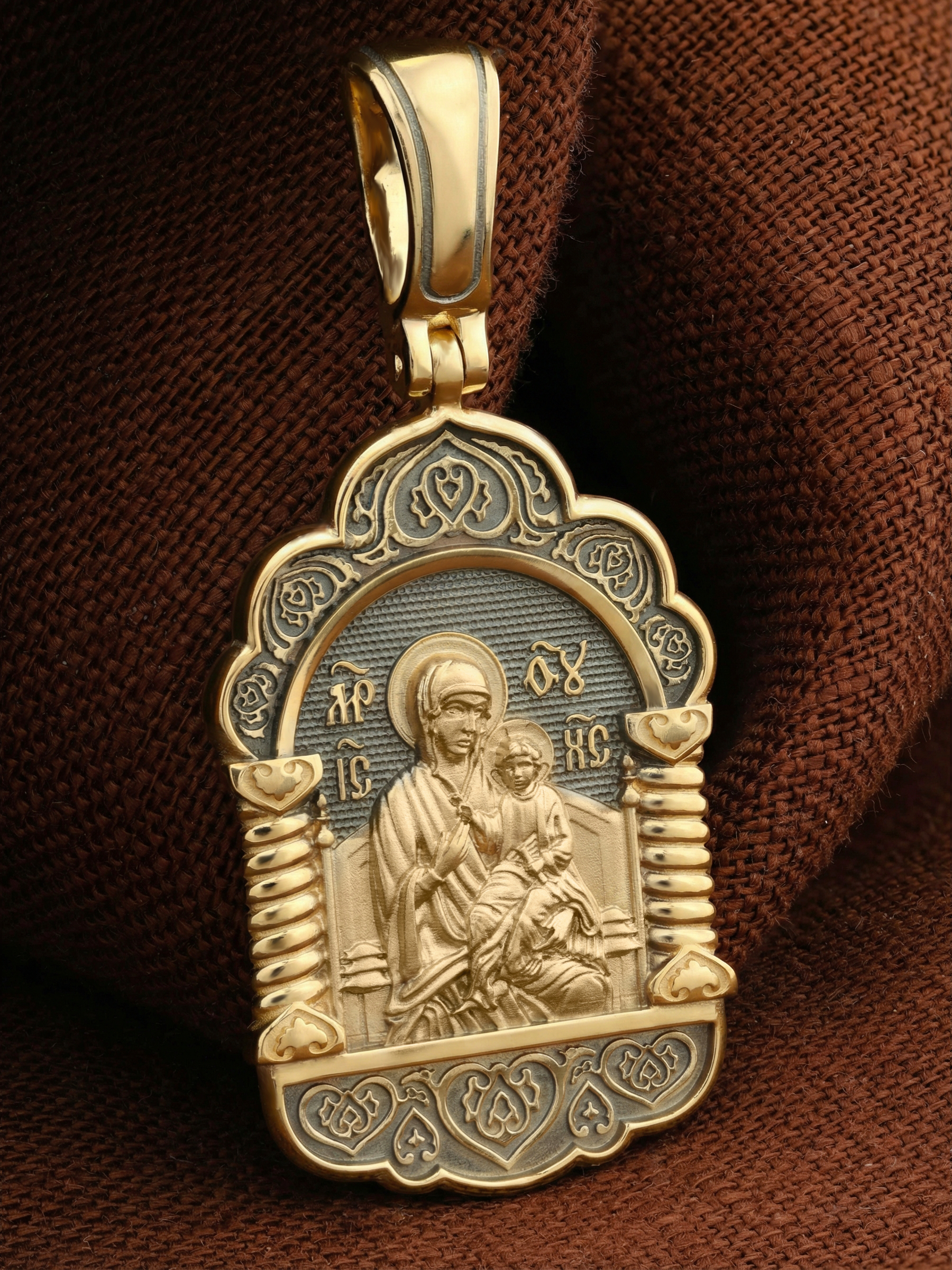 В центр образка помещен образ Божией Матери «Всецарица», восседающая на царском троне. На руках Ее — Богомладенец Иисус Христос со свитком в левой руке. Пальцы Его правой руки сложены в благословляющем жесте.