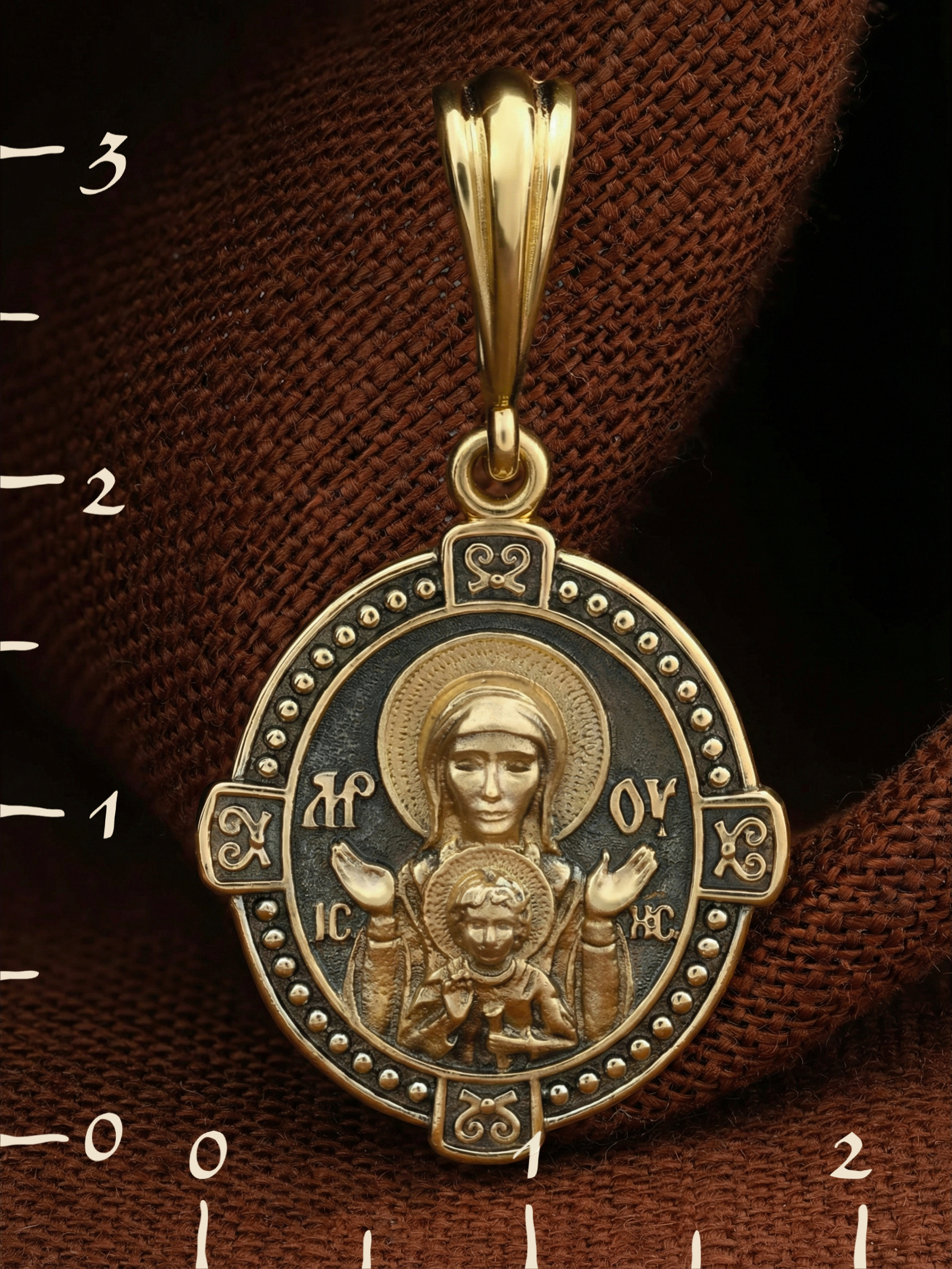 В центр образка помещен образ Божией Матери «Знамение», прославившийся многими чудесами в Новгороде в XII веке. Икона эта чтится как одна из самых великих святынь Русской земли. Молитвенно воздетые руки Богородицы означают заступничество за людей пред Богом. Рядом с Ней, на фоне круглого щита, — благословляющий Божественный Младенец — Спас-Эммануил.