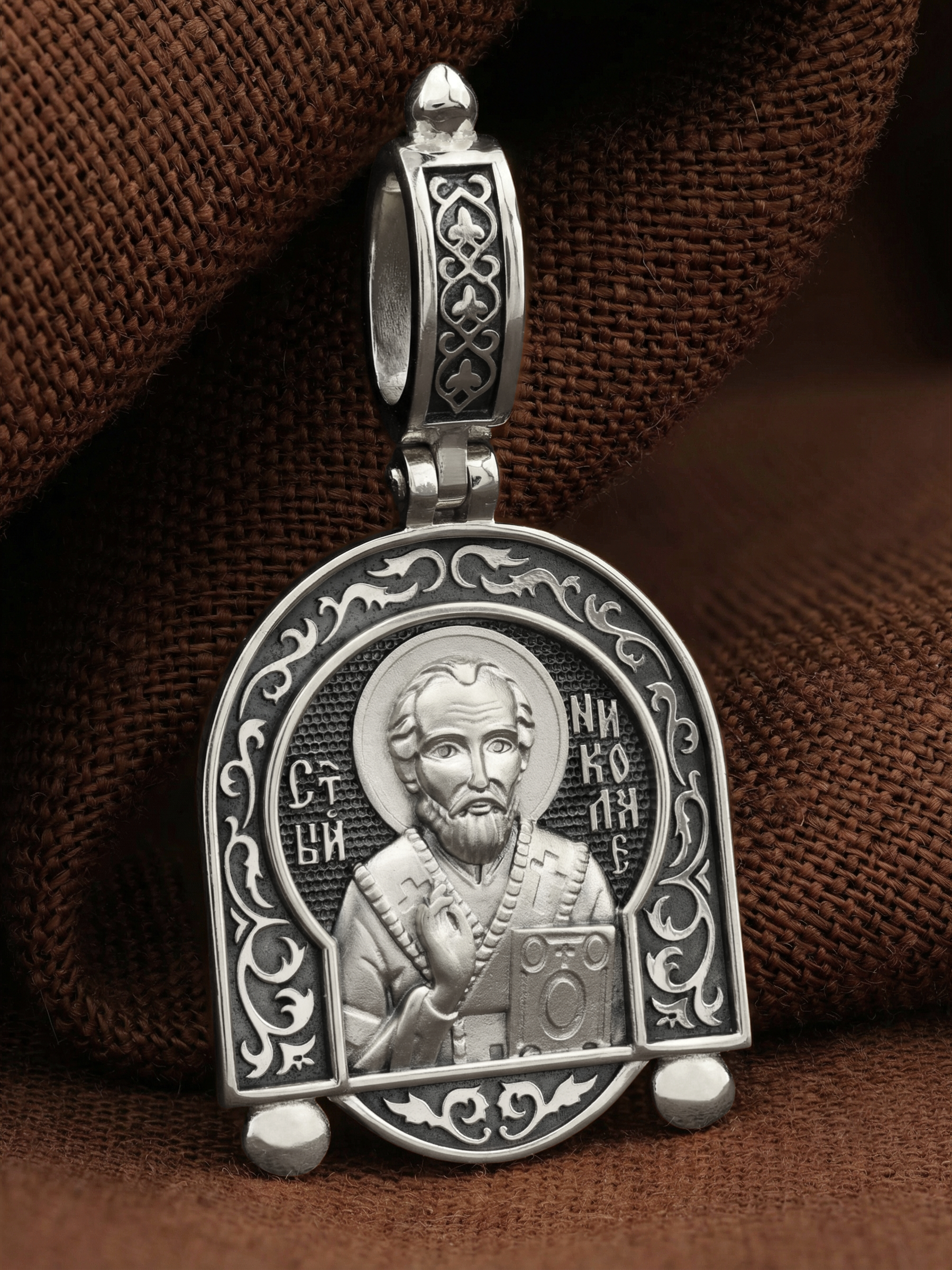 На лицевой стороне образка изображен Святитель Николай архиепископ Мир Ликийских, Чудотворец. Он является одним из самых почитаемых святых в православном мире. Святитель Николай родился во второй половине III века в Малой Азии в Ликийском городе Патары. С рождения Божий Угодник проявлял необыкновенные дарования. Сохранилось Предание, что во время крещения он, никем не поддерживаемый, простоял в купели три часа. Приняв сан священника, святитель Николай стал проводить еще более строгую подвижническую жизнь. Избранник Божий Николай стал вершиной всех добродетелей, поднятой до райской высоты. С кем из величайших праведников не сравнялся он образом духов­ной красоты, кому из них не последовал в своих деяниях и чудотворениях? Вся жизнь святого Николая — это служение Богу. Много великих и преславных чудес сотворил великий Святитель Николай Угодник. Он помогал сущим в бедах, укрощал штормы, спасал от потопления и выносил на сушу из глубины морской, освобождал из плена и приносил освобожденных домой, избавлял от уз и темницы, защищал от посечения мечом, освобождал от смерти и подавал многим различные исцеления: слепым — прозрение, хромым — хождение, глухим — слух, немым — дар слова.