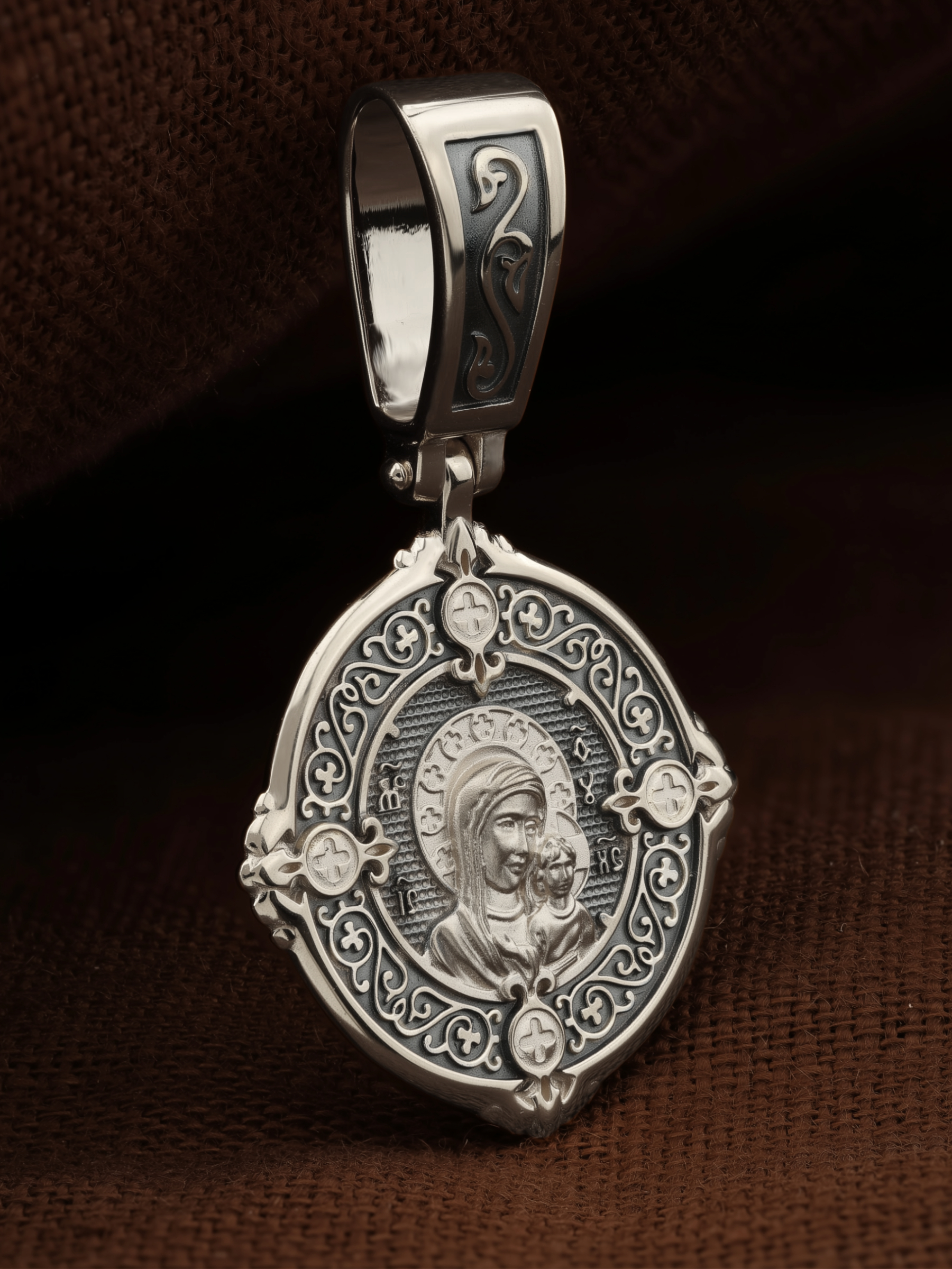 На лицевой части образка изображена Казанская икона Пресвятой Богородицы — одна из самых почитаемых в России чудотворных икон Богородицы. Богословское значение Казанской иконы — указать верующим истинный Путь к спасению, который лежит через Христа. Только Божия Матерь имеет настолько сильное дерзновение к Спасителю, что может ходатайствовать перед Ним за всех верных. Именно этот образ дарится новой повенчанной паре, как хранитель очага и семейная реликвия. Молитва перед Казанской иконой Божьей Матери помогает во всех сложных случаях жизни, в болезнях, во всех печалях, невзгодах, скорбях. Уникальная история появления, чудеса, случившиеся по молитвам православных людей возле образа — все это делает Казанскую Богородицу особенной, среди тысяч других икон.