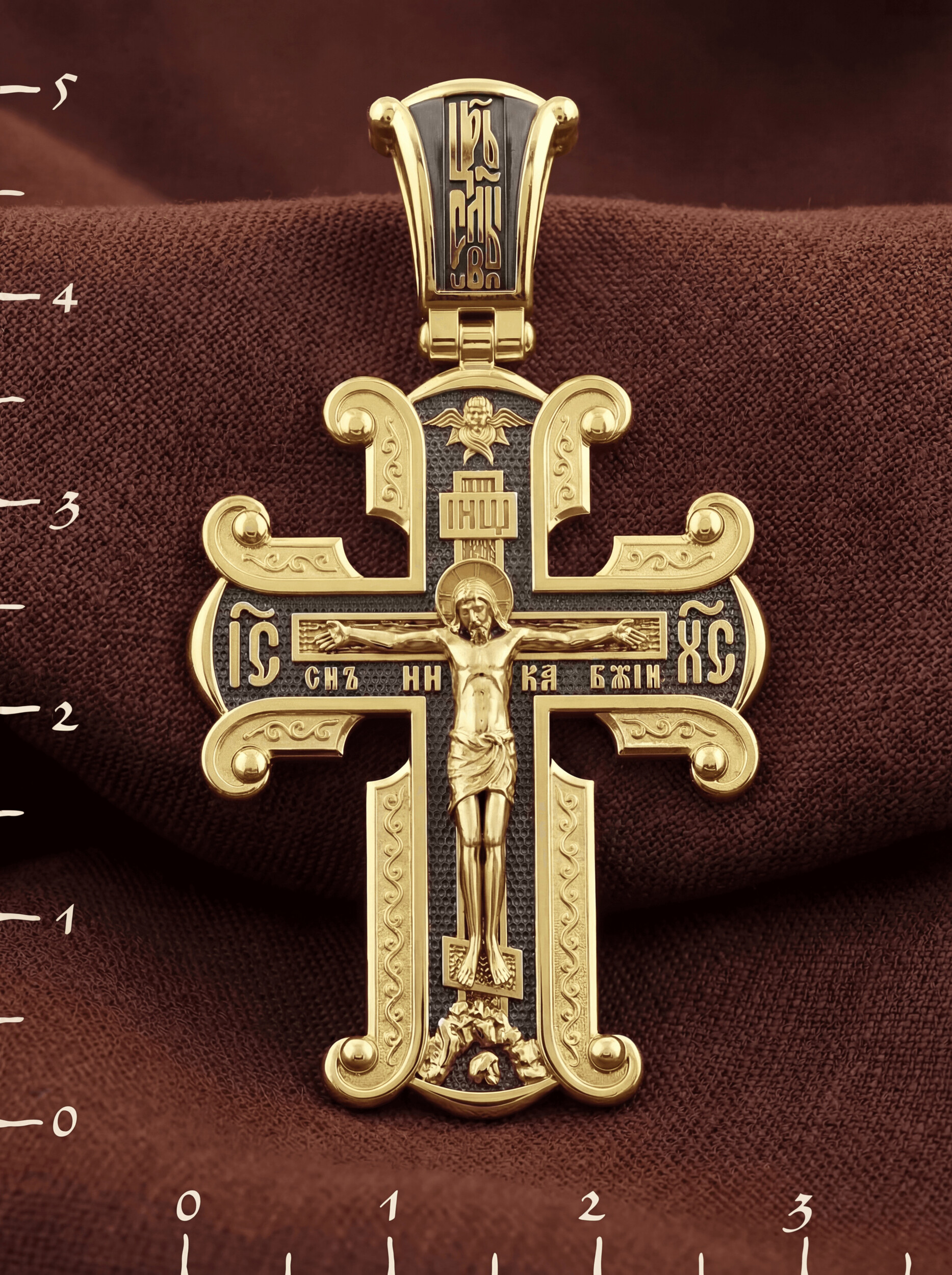 На лицевой стороне необычной формы нательного креста мы видим распятие Господне. Сам крест украшен плетением полурастительной тематики и золотым ободком, заканчивающимся завитками. На кулонном кольце с лицевой стороны надпись — Царь Славы. Под ней — шестикрылый огненный серафим, и буквы «IНЦI», означающие Иисус Назорей Царь Иудейский. С обеих сторон горизонтальной перекладины надписи — монограмма Святого имени Христа — «ИС ХС», а под ней — «НИКА» (Победитель) и «Сын Божий». В подножии мы видим изображенную гору Голгофу в виде скалистой горки с Главой Адамовой в пещере.
