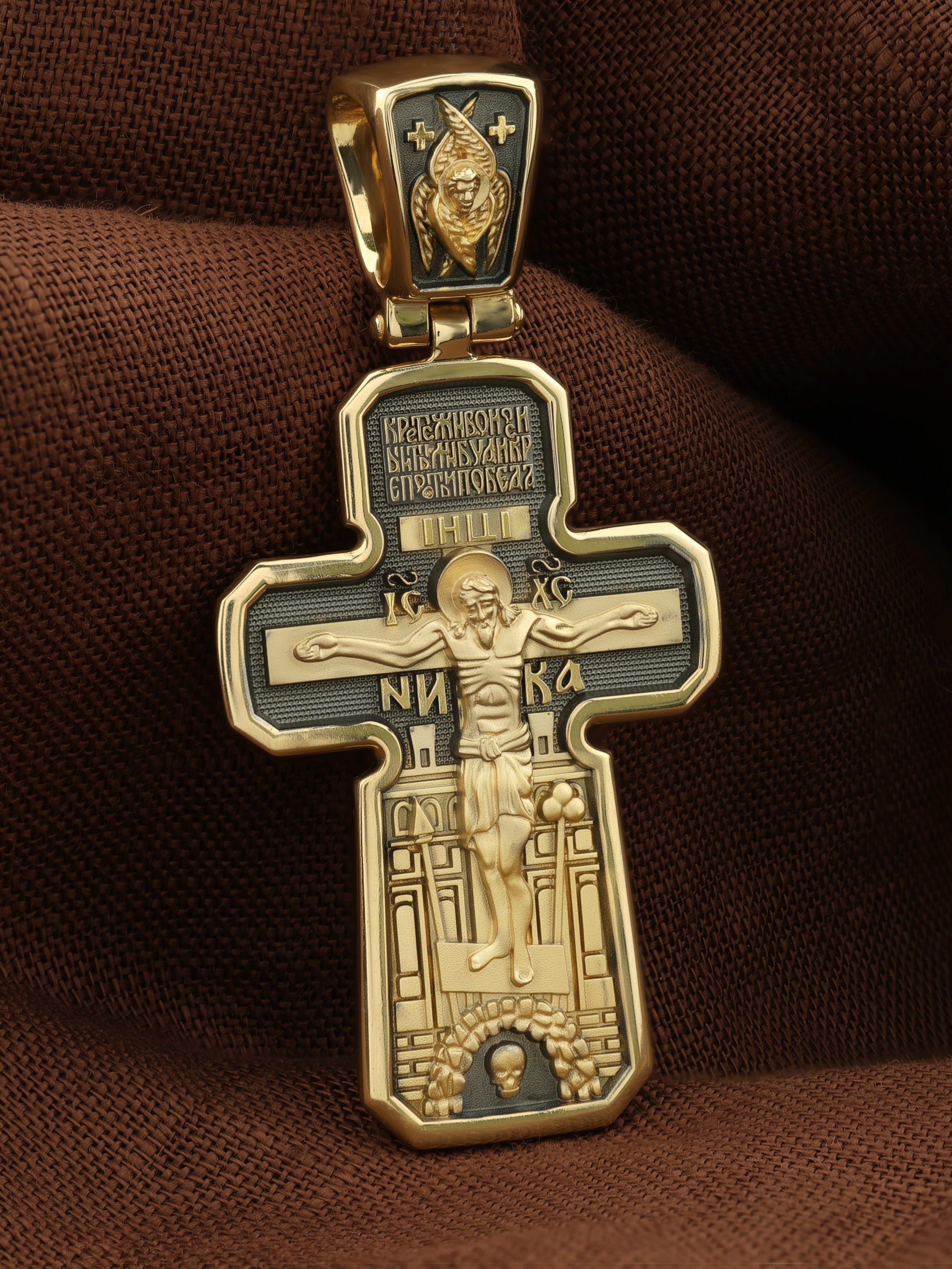 Основное поле лицевой стороны креста занято изображением рельефного Распятия на восьмиконечном Голгофском кресте с копием, тростью по сторонам и Главой Адамовой в пещере на ступенчатой Голгофе. Над крестом написаны слова Канона святому и животворящему Кресту Господню: «Кресте живоносный, ты ми буди крепость, и победа, и щит, и стена нератуема, бесов отгнание, и помыслов погашение, и ума моего сохранение».