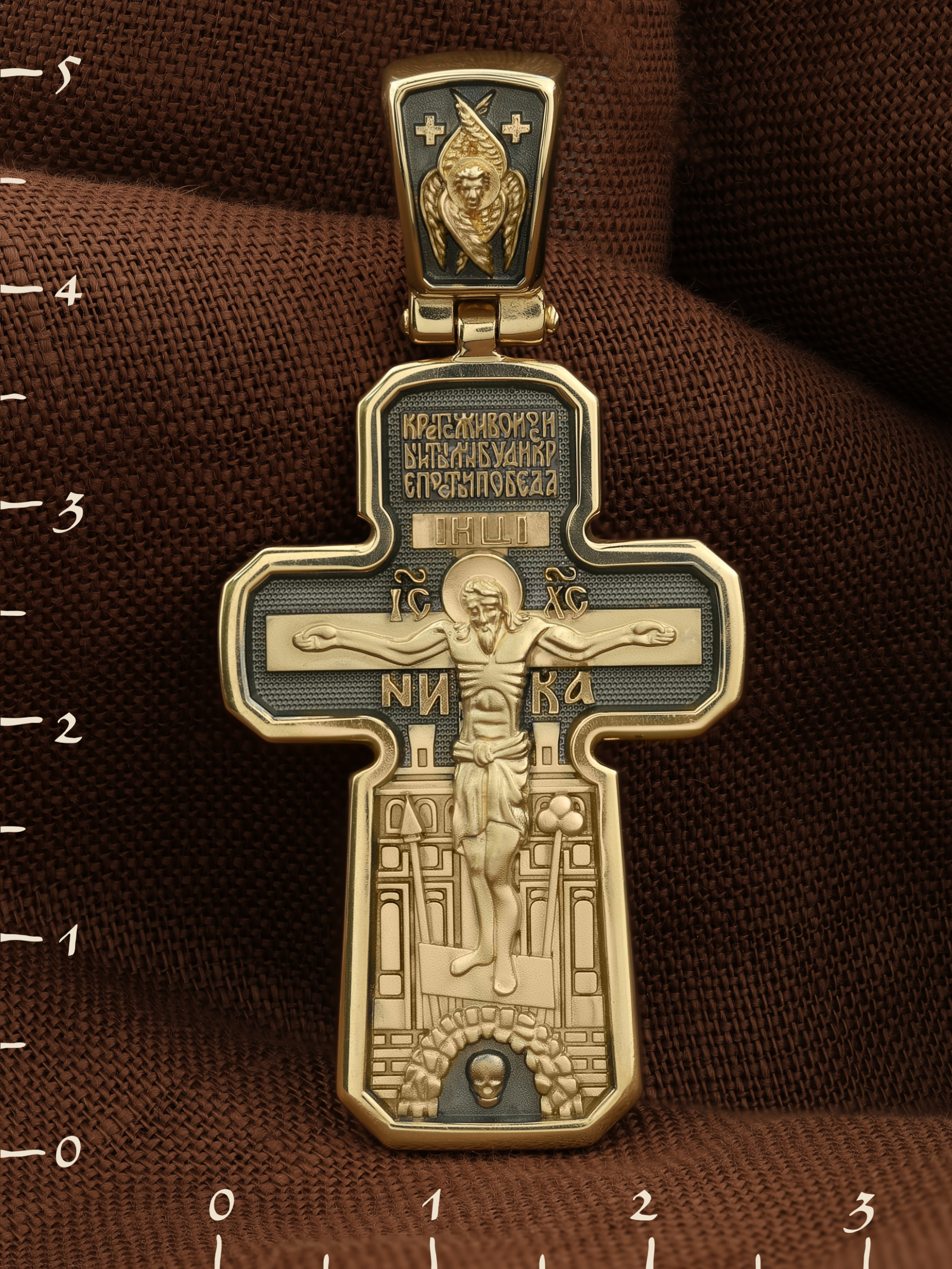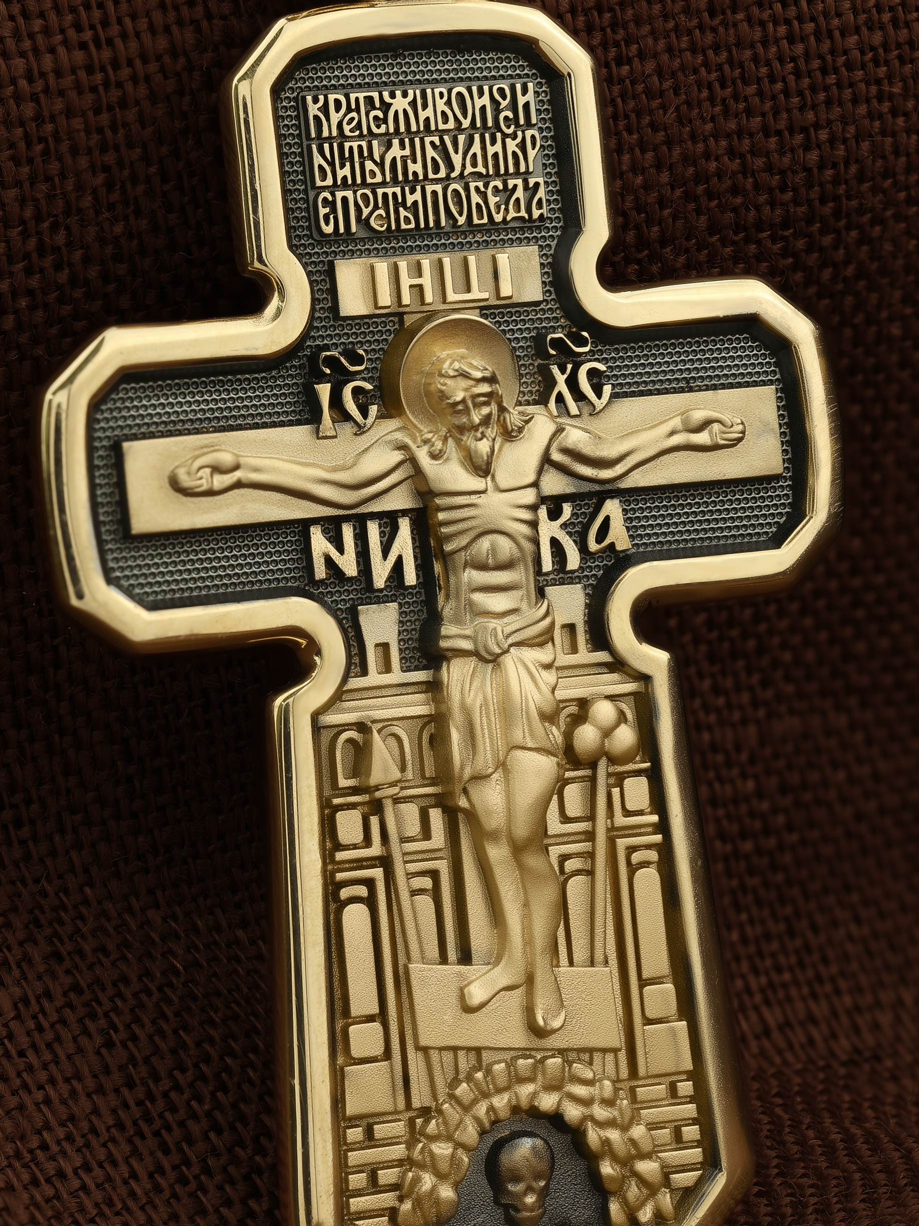 Позади Распятия видна иерусалимская стена, знак того, что Господь был распят вне стен города. Но вместе с тем стена символизирует и Небесный Иерусалим, путь который открылся для человека через Голгофу. Сам образ Распятия сопровождается каноническими надписями — инициалы Христа «IС ХС» и надпись «НИКА» (Победитель).