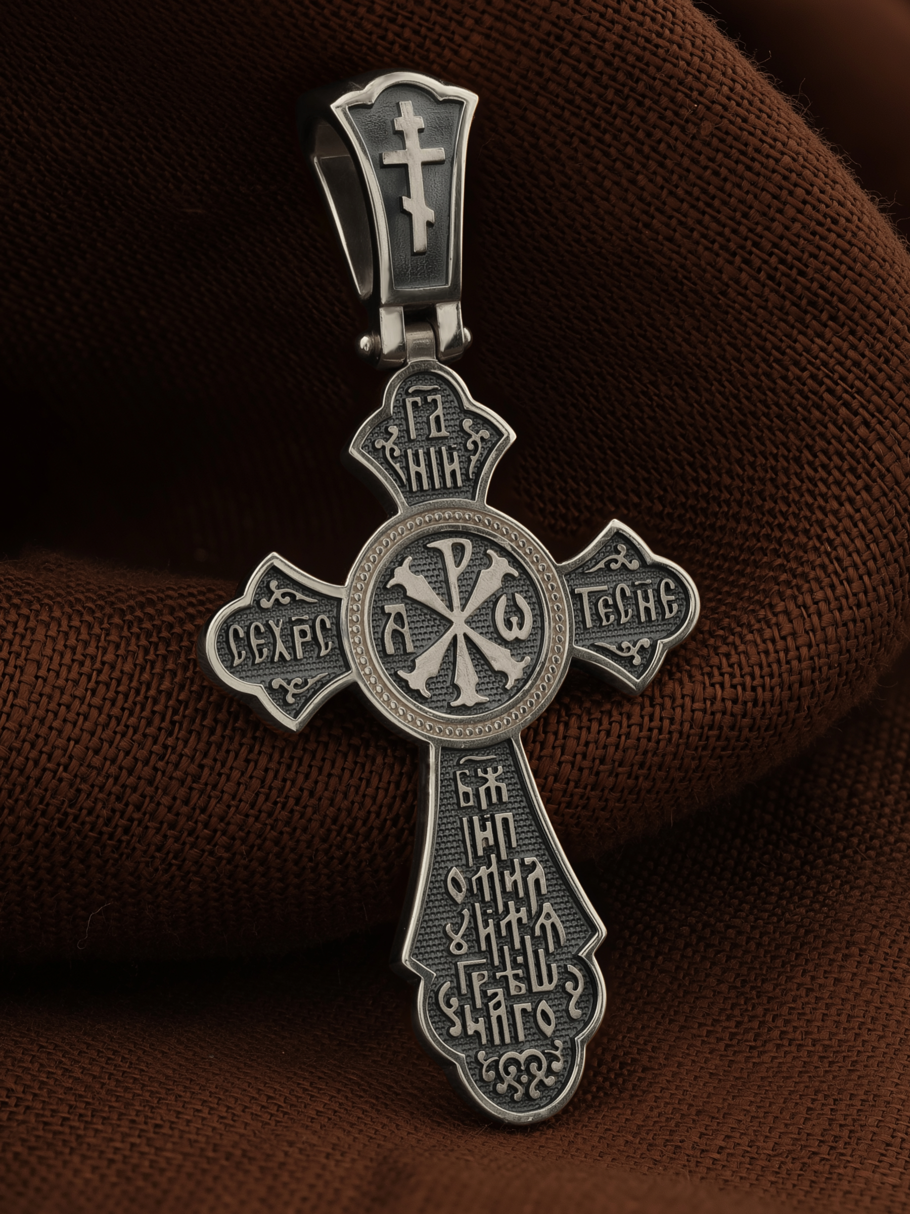 На боковых оконечностях креста размещены инициалы святого имени Христа «ИС ХС». В верхней оконечности креста имеется монограмма «Царь Славы», а в нижней оконечности — надпись «НИКА» (Победитель).