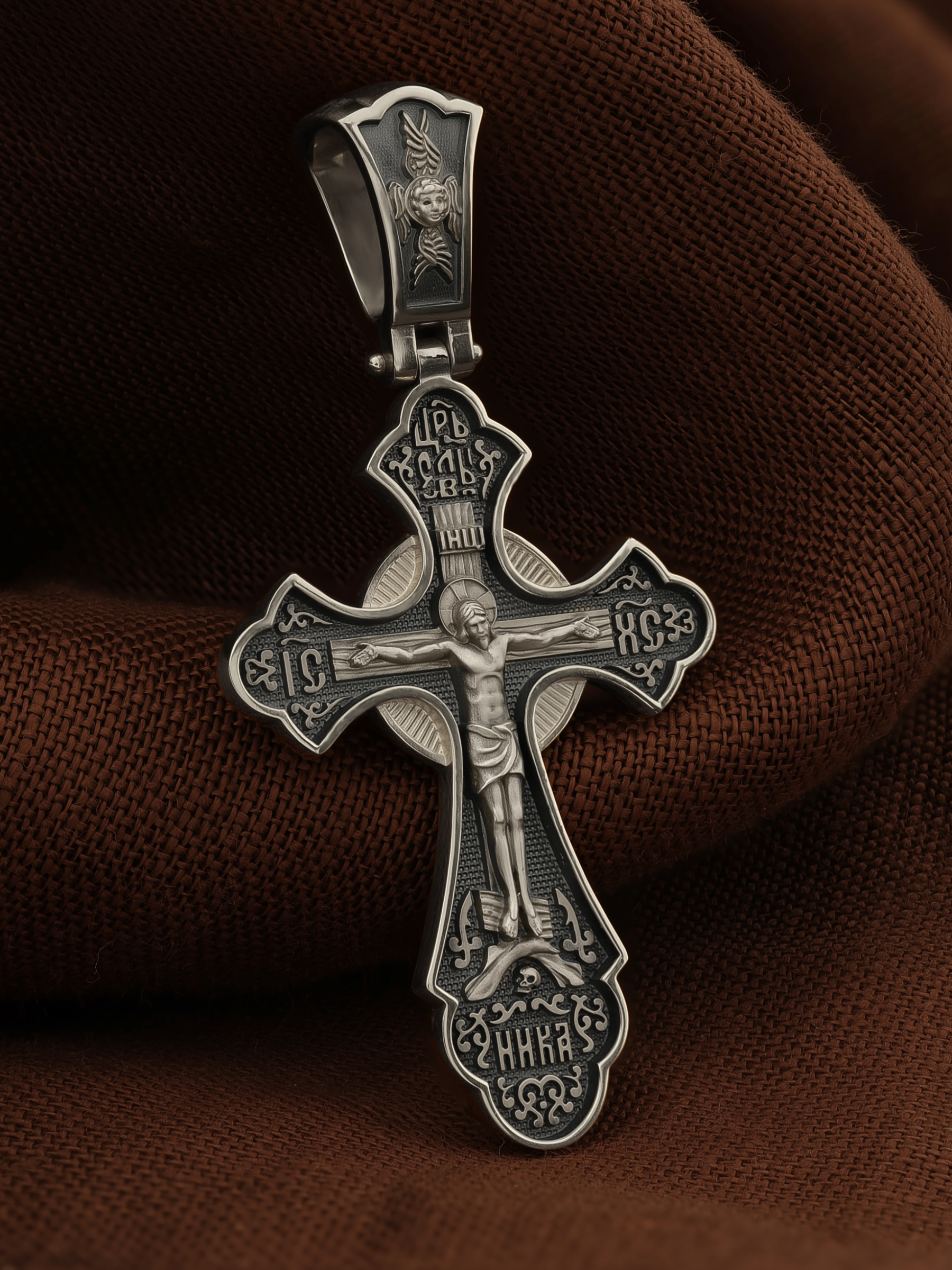 На лицевой стороне креста по каноническим правилам Церкви изображен Господь Иисус Христос. Сверху у изголовья Иисуса Христа размещена табличка с надписью в виде аббревиатуры ИНЦИ — «Иисус Назорей Царь Иудейский», которая, согласно Евангелию, была прибита к кресту после Распятия. У подножия креста Господа в виде скалистой горки изображена гора Голгофа с Главой Адамовой в пещере.