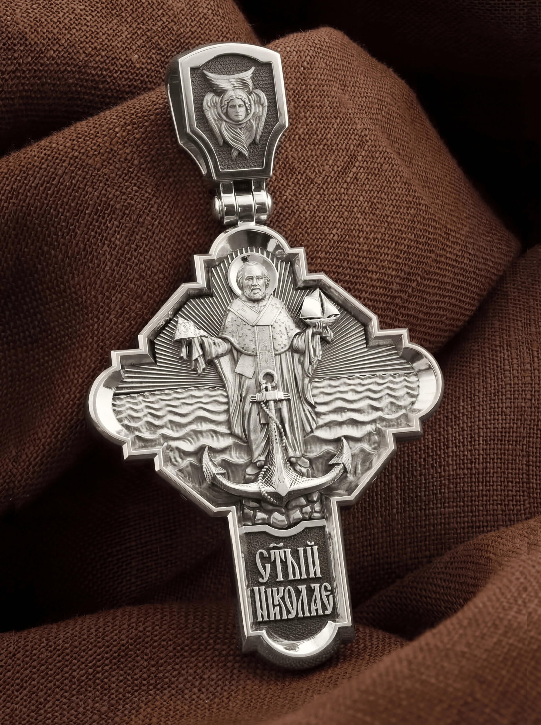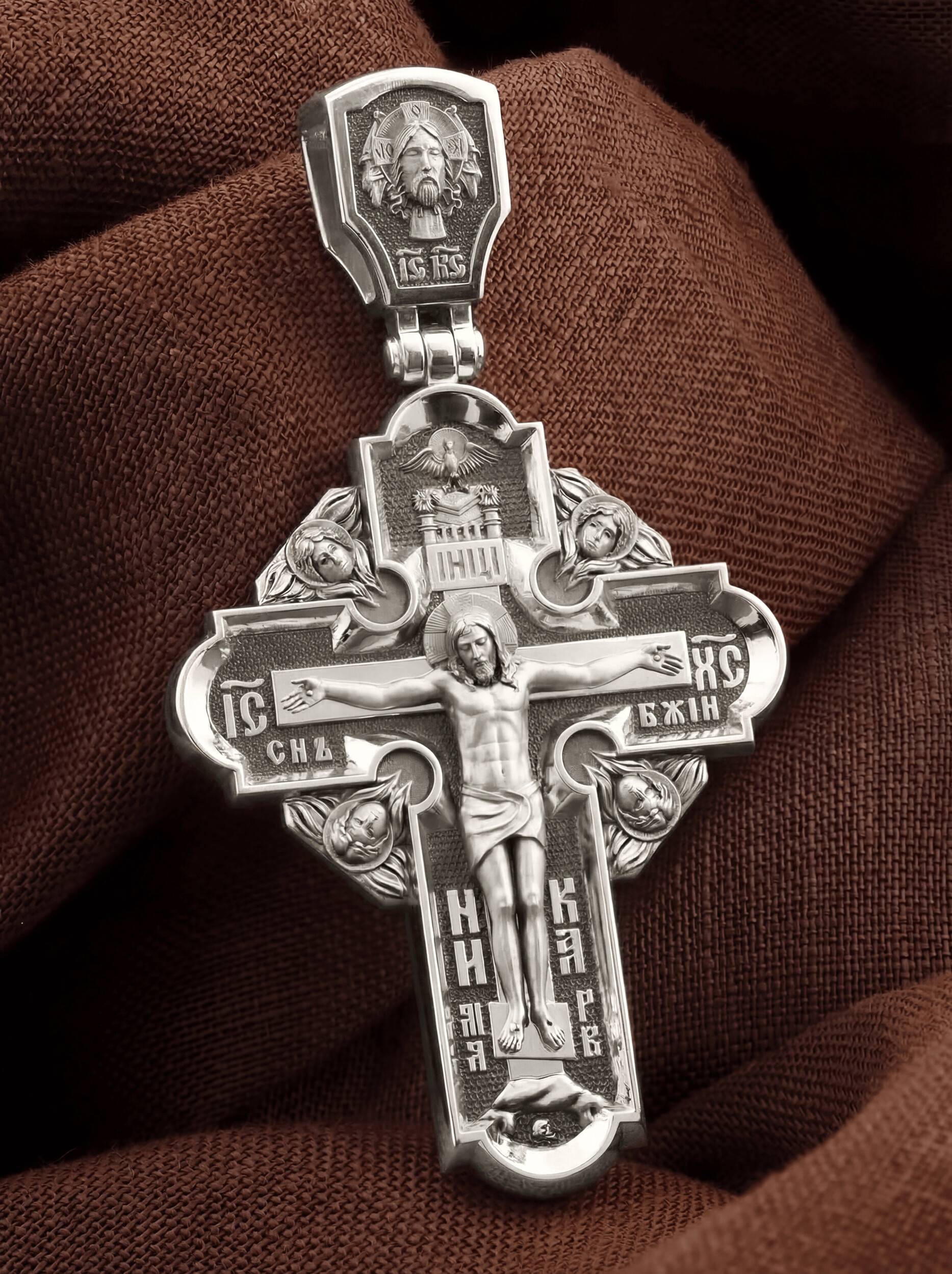 На лицевой стороне креста изображено Распятие Господа и Спасителя нашего Иисуса Христа, отдавшего Себя на смерть, чтобы другие могли жить — жить вечной жизнью, жить с Богом. Своею кровью Господь освятил крест и сделал его проводником Своей благодати, источником освящения верующих. На верхней табличке, выше головы Иисуса, расположена надпись, составленная Понтием Пилатом — «ИНЦИ». Она означает «Иисус Назорей, Царь Иудейский». Надпись «IС ХС» означает Иисус Христос помещается на разных сторонах поперечной (большой) перекладины креста. На кулонном кольце помещено изображение Духа Святого в виде голубя, сходящего с Небес