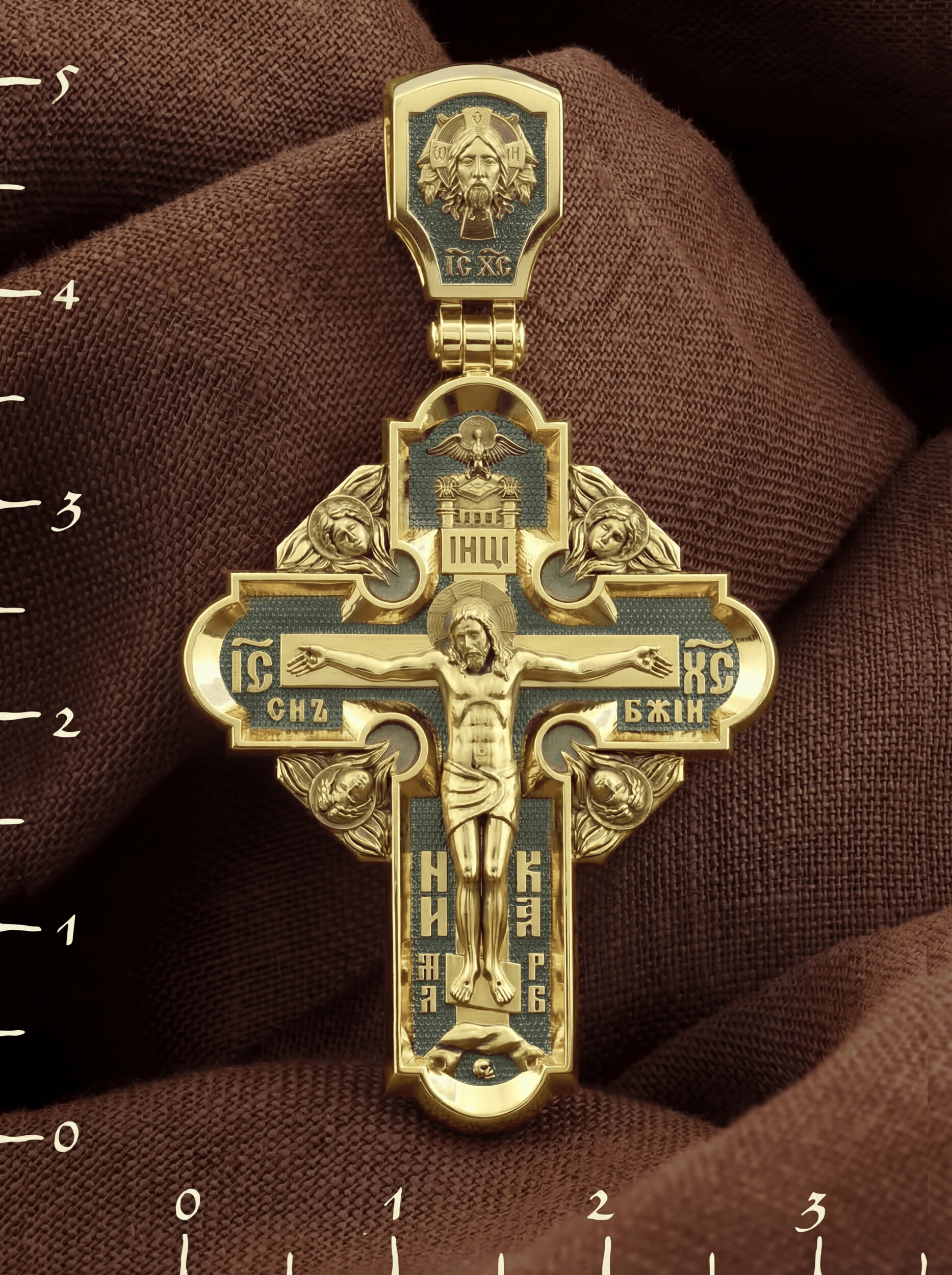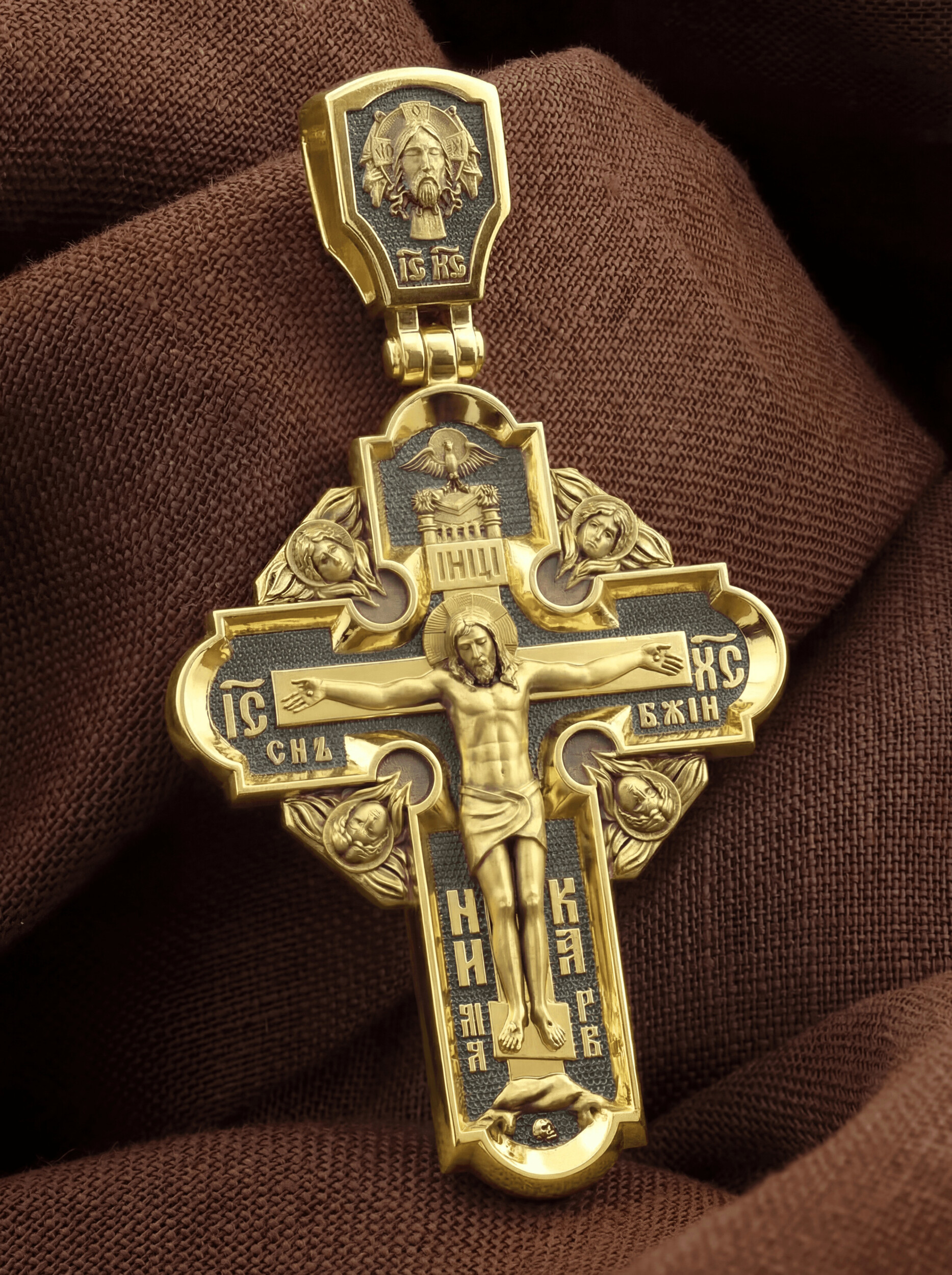 На лицевой стороне креста изображено Распятие Господа и Спасителя нашего Иисуса Христа, отдавшего Себя на смерть, чтобы другие могли жить — жить вечной жизнью, жить с Богом. Своею кровью Господь освятил крест и сделал его проводником Своей благодати, источником освящения верующих. На верхней табличке, выше головы Иисуса, расположена надпись, составленная Понтием Пилатом — «ИНЦИ». Она означает «Иисус Назорей, Царь Иудейский». Надпись «IС ХС» означает Иисус Христос помещается на разных сторонах поперечной (большой) перекладины креста. На кулонном кольце помещено изображение Духа Святого в виде голубя, сходящего с Небес