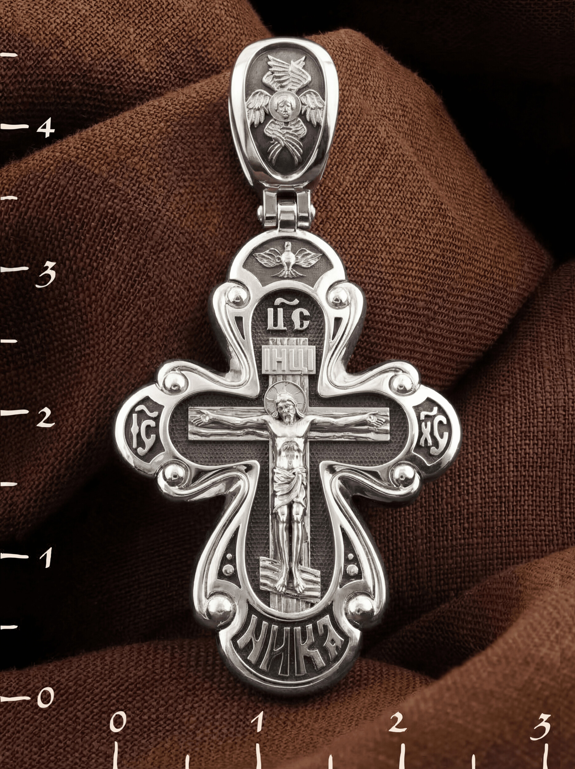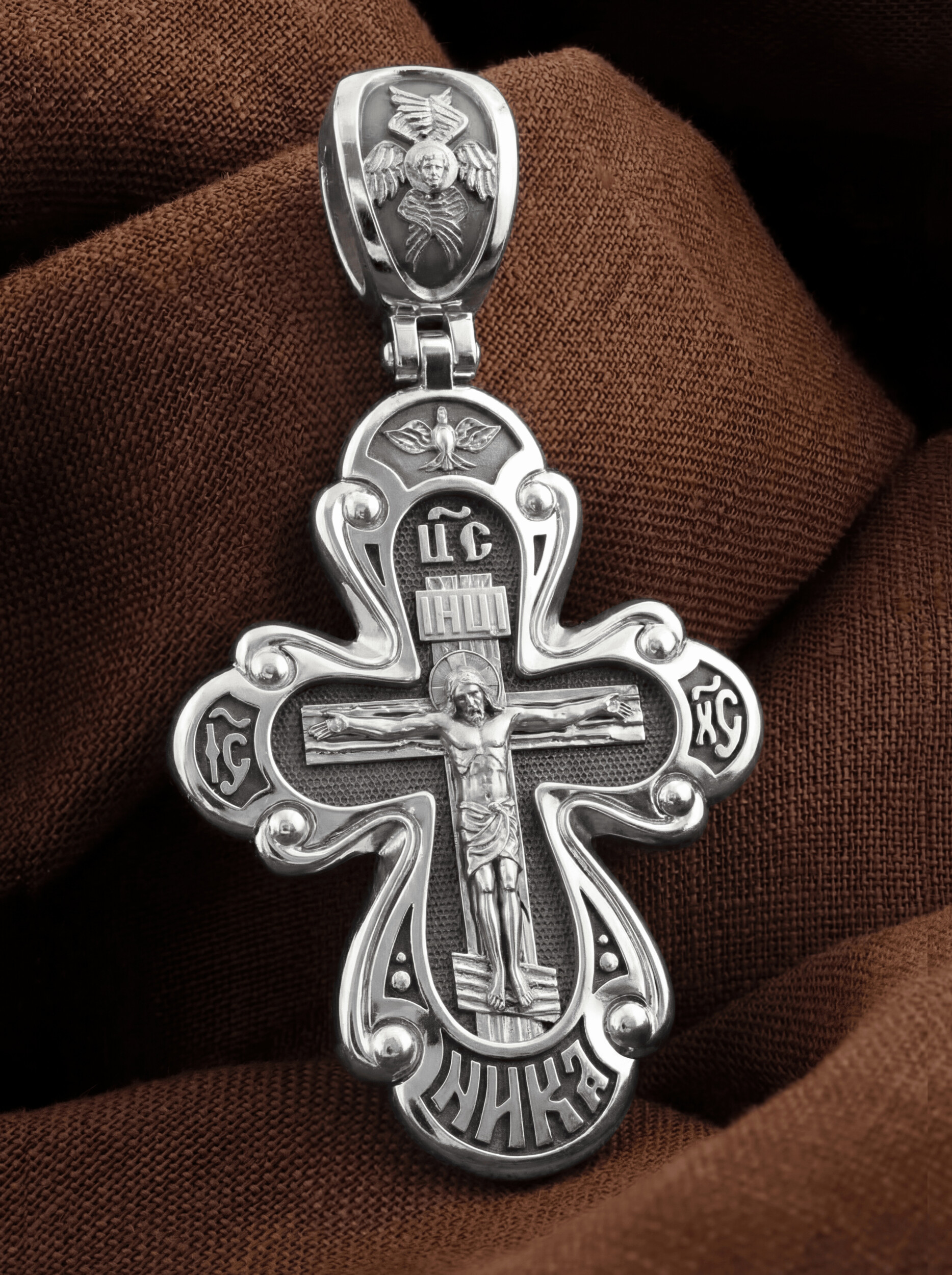 На лицевой стороне креста изображено Распятие Иисуса Христа. Господь представлен свободно покоящимся на кресте с простертыми руками и как бы обнимающим всю Вселенную. Он — Спаситель, искупивший грехи мира, «поправший смертию смерть» и призывающий к Себе «все концы земли». Поэтому рядом с Его образом помещены слова — «НИКА» и «Царь Славы». Эти слова характеризуют Господа как Великого Архиерея, победителя смерти. Верхняя перекладина символизирует титло — табличку, на которой, согласно Евангелию, было начертано: Иисус Назорей Царь Иудейский (IНЦI). Также Распятие сопровождается надписями, олицетворяющими Христа. Это святое имя Христа «IC» (Иисус) «ХС» (Христос), и словосочетание «СЫН БОЖИЙ».