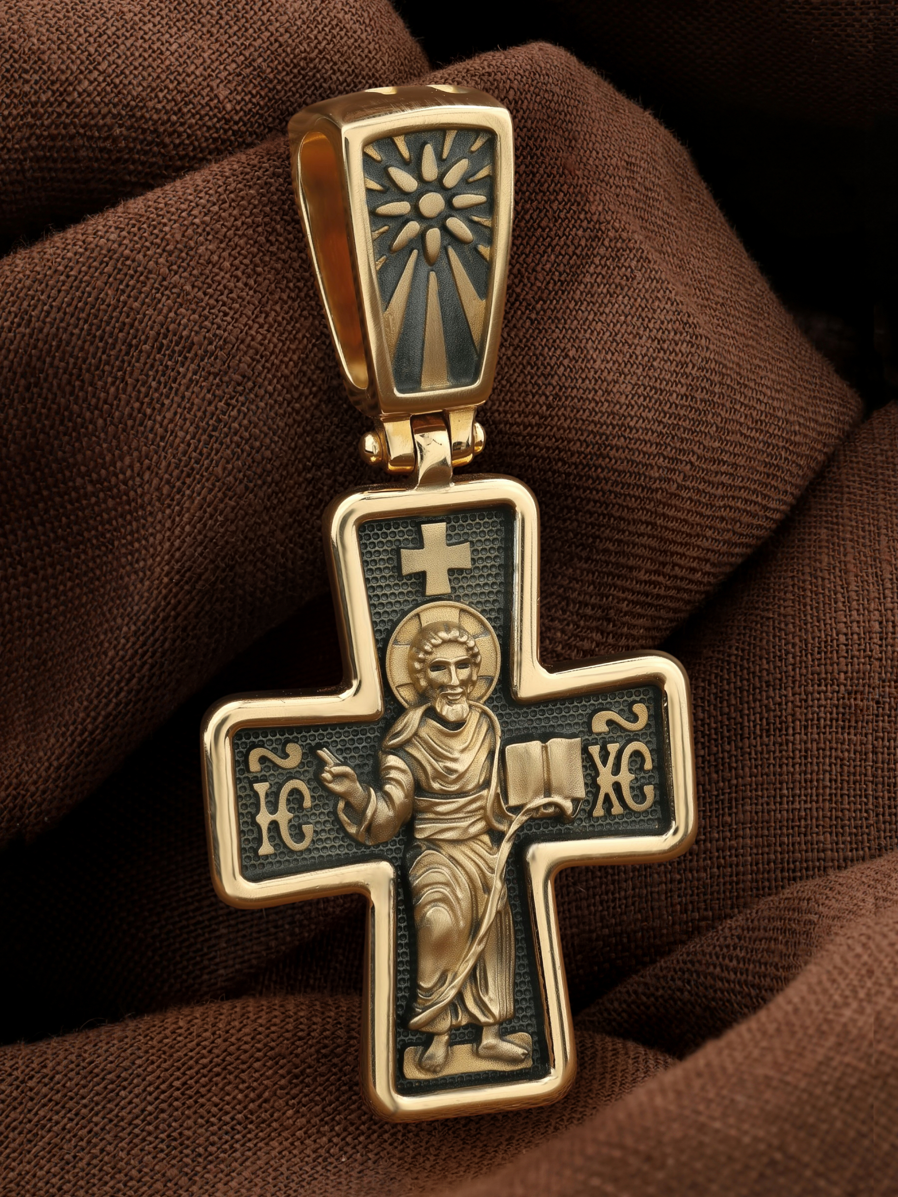 На лицевой стороне креста изображена икона Господа и Спасителя нашего Иисуса Христа — Господь Вседержитель или Пантократор. Он представлен как Царь Небесный и будущий Судия мира. Именование Иисуса «Вседержителем» указывает, с одной стороны, на Его Божественную природу: «Аз есмь Альфа и Омега, начало и конец, говорит Господь, Который есть и был и грядет, Вседержитель» (Откр. 1: 8). С другой стороны, такое именование связано и с человеческой природой Христа, искупившего крестной жертвой людские грехи и обновившего тем самым человеческую природу. Правой рукой Он благословляет, а левой держит Книгу. Она символизирует Евангелие — благую весть, принесенную Христом всему миру. Указывая на раскрытое Евангелие и одновременно благословляя, Иисус недвусмысленно указывает нам путь к спасению души.