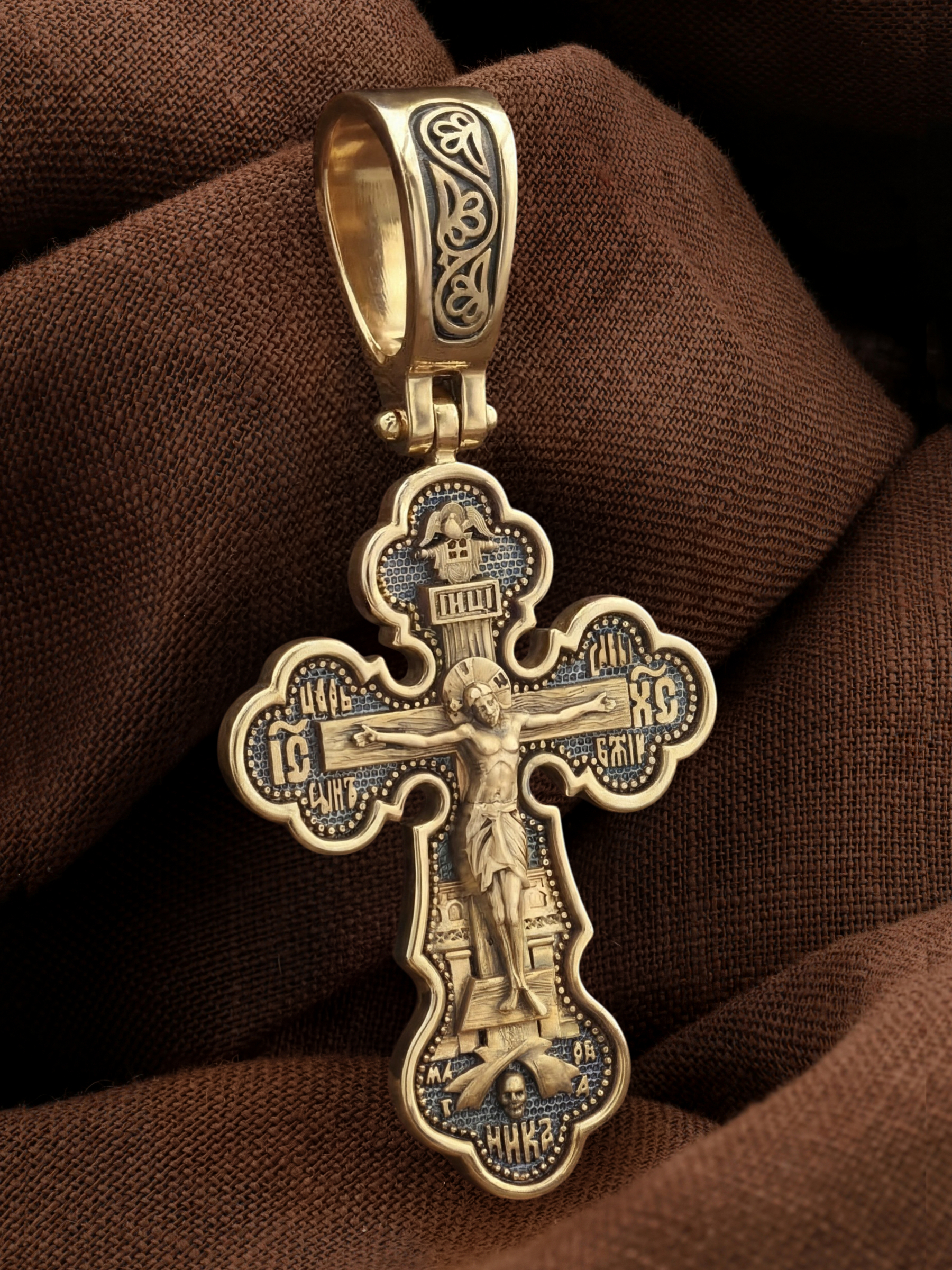 На лицевой стороне креста изображено Распятие Господа и Спасителя нашего Иисуса Христа. Христос, подвергнутый на кресте мучительной казни, своими страданиями искупил нас от древнего греха и даровал нам жизнь вечную. На верхней табличке, выше головы Иисуса, расположена надпись, составленная Понтием Пилатом — «IНЦI». Она означает «Иисус Назорей, Царь Иудейский». Распятие сопровождается каноническими надписями. Надпись «IС ХС» означает Иисус Христос, надпись «Царь Славы» и словосочетание «СЫН БОЖИЙ», что означает божественную природу Иисуса Христа, помещаются на разных сторонах поперечной перекладины креста. В нижней части креста находятся надписи –«НИКА» и «МЛРБ». В переводе с греческого, слово «НИКА» означает «победитель». Именно оно является символом победы Христа над смертью. Надпись «МЛРБ» — «место лобное рай бысть» означает, что место лобное стало раем. Крест стоит на горе камней, символизирующих Голгофу. Под подножием Креста изображена покоящаяся голова (череп) Адама и надпись «Г.А.». Христос в Своей Божественной любви, над которой смерть не властна и которая, страдая, и не страдает в обычном смысле, простирает к людям со Креста Свои объятия, в которые призывается и привлекается весь мир. Поэтому Тело Его не висит, а торжественно покоится на Кресте.