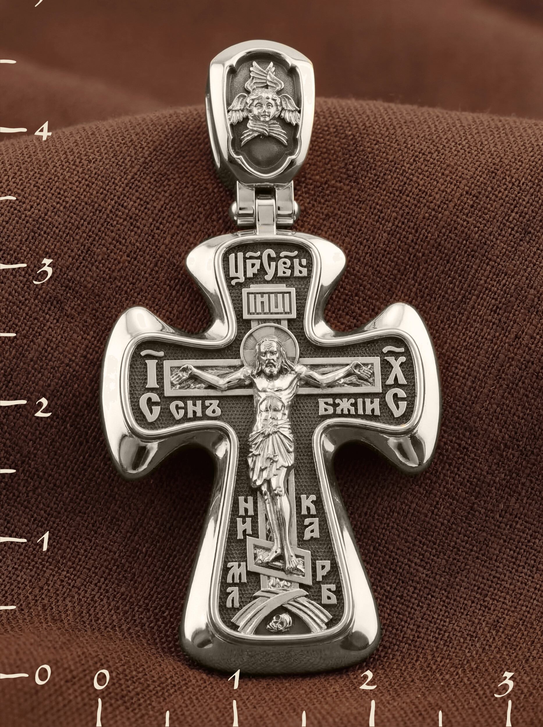 На лицевой стороне креста изображено Распятие Иисуса Христа. Господь представлен свободно покоящимся на кресте с простертыми руками и как бы обнимающим всю Вселенную. Он — Спаситель, искупивший грехи мира, «поправший смертию смерть» и призывающий к Себе «все концы земли». Поэтому рядом с Его образом помещены слова — «НИКА» и «Царь Славы». Эти слова характеризуют Господа как Великого Архиерея, победителя смерти. Также Распятие сопровождается надписями, олицетворяющими Христа. Это святое имя Христа «IC» (Иисус) «ХС» (Христос), и словосочетание «СЫН БОЖИЙ».