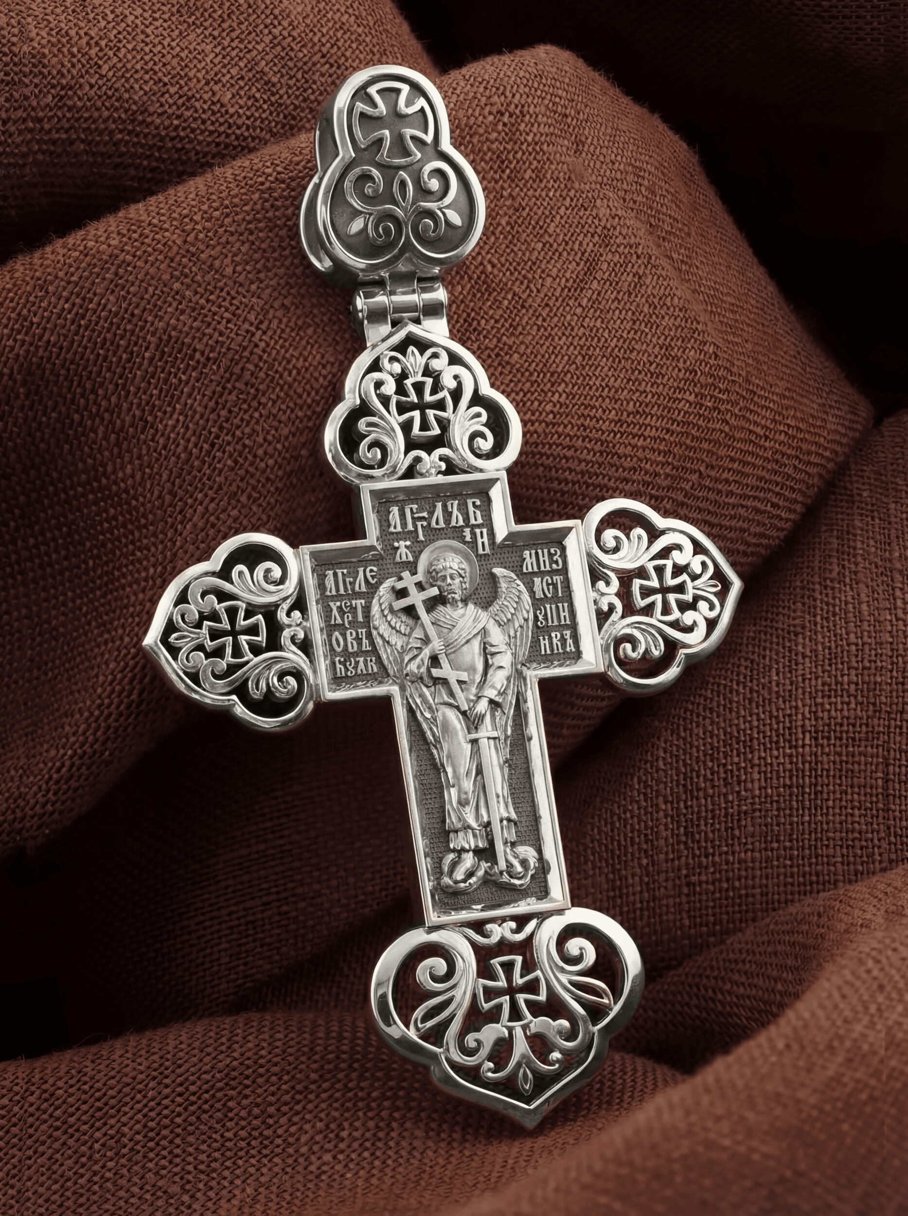 Оборотную сторону креста возглавляет Ангел Хранитель с крестом и мечом: ими он защищает человека от злых духовных и физических нападений. Ангел не может нарушить свободу воли человека, поэтому его надо молитвенно просить о помощи: «Ангеле Христов, буди ми заступник», — эта молитва написана вокруг его образа.