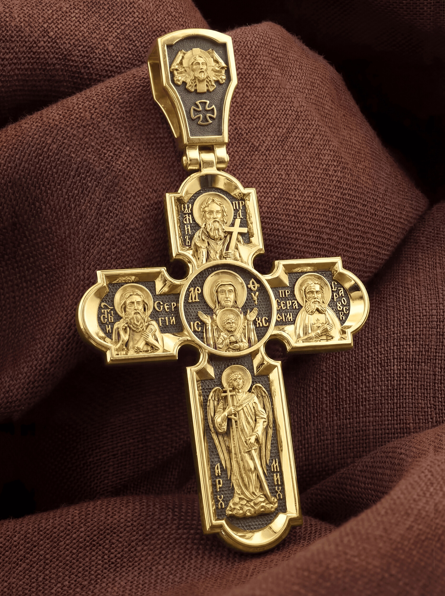 Центральную часть оборотной стороны креста украшает икона Божией Матери «Знамение». Иконы Божией Матери, известные под именем «Знамение», появились на Руси в XI — XII веках, а называться так стали после чудесного знамения от Новгородской иконы, случившегося в 1170 году. Многочисленные списки с иконы Знамения известны по всей России. Многие из них просияли чудесами в местных храмах и были наименованы по месту явления чудес. На кресте внизу изображен Архангел Михаил, слева — Преподобный Сергий Радонежский, справа — Преподобный Серафим Саровский, вверху  — Предтеча Господень Иоанн Креститель. На кулонном кольце помещено изображение Спаса Нерукотворного — образ Спасителя, который Он запечатлел на плате и передал для исцеления больному проказой царю Эдессы. Ему придается победное и защитное значение.