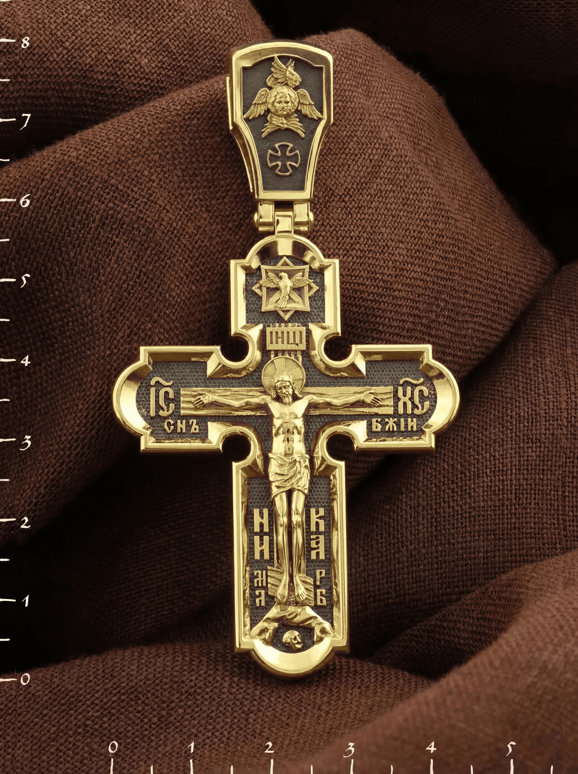 На лицевой стороне креста изображено Распятие Господа и Спасителя нашего Иисуса Христа. Христос, подвергнутый на кресте мучительной казни, своими страданиями искупил нас от древнего греха и даровал нам жизнь вечную. На верхней табличке, выше головы Иисуса, расположена надпись, составленная Понтием Пилатом — «IНЦI». Она означает «Иисус Назорей, Царь Иудейский». Надпись «IС ХС» означает Иисус Христос и словосочетание «СЫН БОЖИЙ», что означает божественную природу Иисуса Христа, помещается на разных сторонах поперечной перекладины креста. В нижней части креста находятся надписи –«НИКА» и «МЛРБ». В переводе с греческого, слово «НИКА» означает «победитель». Именно оно является символом победы Христа над смертью. Надпись «МЛРБ» — «место лобное рай бысть» означает, что место лобное стало раем. Крест стоит на горе камней, символизирующих Голгофу. Под подножием Креста изображена покоящаяся голова (череп) Адама, грехи которого Христос омыл Своею Кровью. Христос в Своей Божественной любви, над которой смерть не властна и которая, страдая, и не страдает в обычном смысле, простирает к людям со Креста Свои объятия, в которые призывается и привлекается весь мир. Поэтому Тело Его не висит, а торжественно покоится на Кресте.