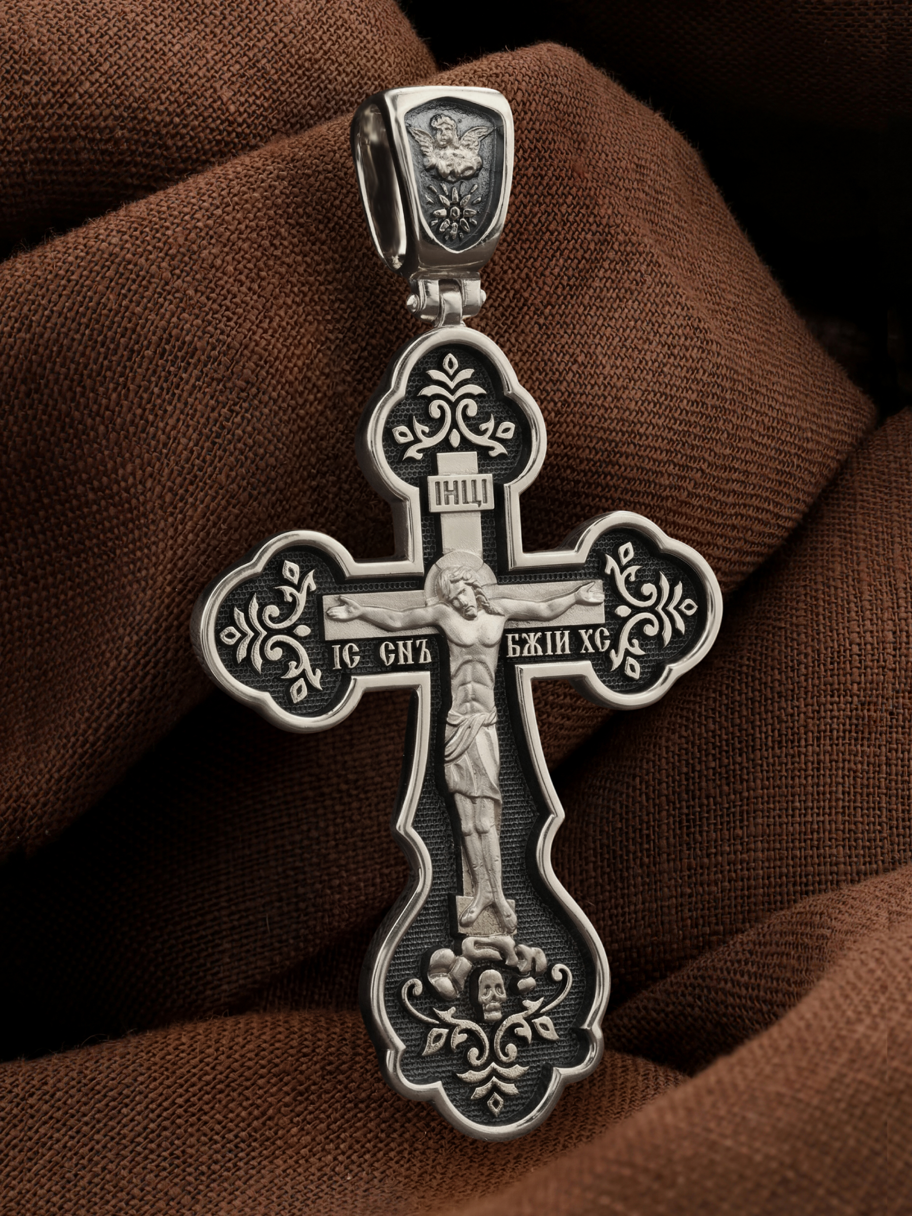 На лицевой стороне креста традиционно изображено Распятие, потому что, это орудие казни Иисус Христос сделал орудием победы над грехом и смертью. Своими страданиями Он искупил грехи человечества, умерев и сошествовав во ад, победил сатану, освободил души праведников от вечной смерти и открыл им небесные врата рая.
