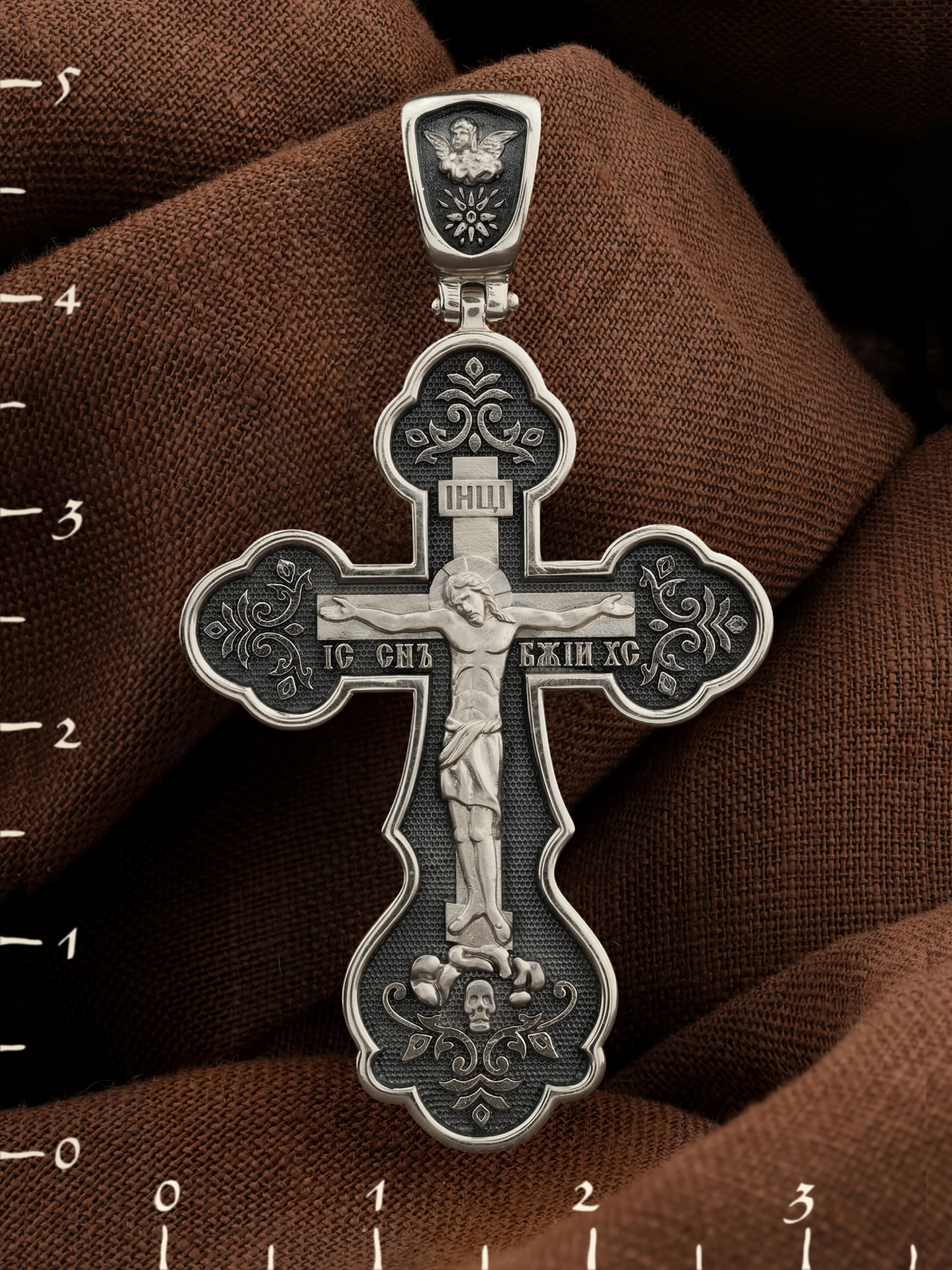 Верхняя часть креста, лицевой стороны, область Божественного бытия, как бы отделяется короткой верхней перекладиной. Эта перекладина изображает табличку с надписью в виде аббревиатуры IНЦI — «Иисус Назорей Царь Иудейский», которая, согласно Евангелию, была прибита к кресту после Распятия. Внизу, в земной части креста, под ногами Христа изображается наклоненная перекладина. Это подножие, символизирующее мерило дел человеческих, в чаши которого на Страшном Суде будут полагаться добрые и злые дела людей. Один из распятых с Христом разбойников хулил Господа, и мерило склонилось под тяжестью его грехов, как бы низводя его в ад. Другой же каялся и просил у Господа милости. Ему подножие указывает на Царство Небесное.