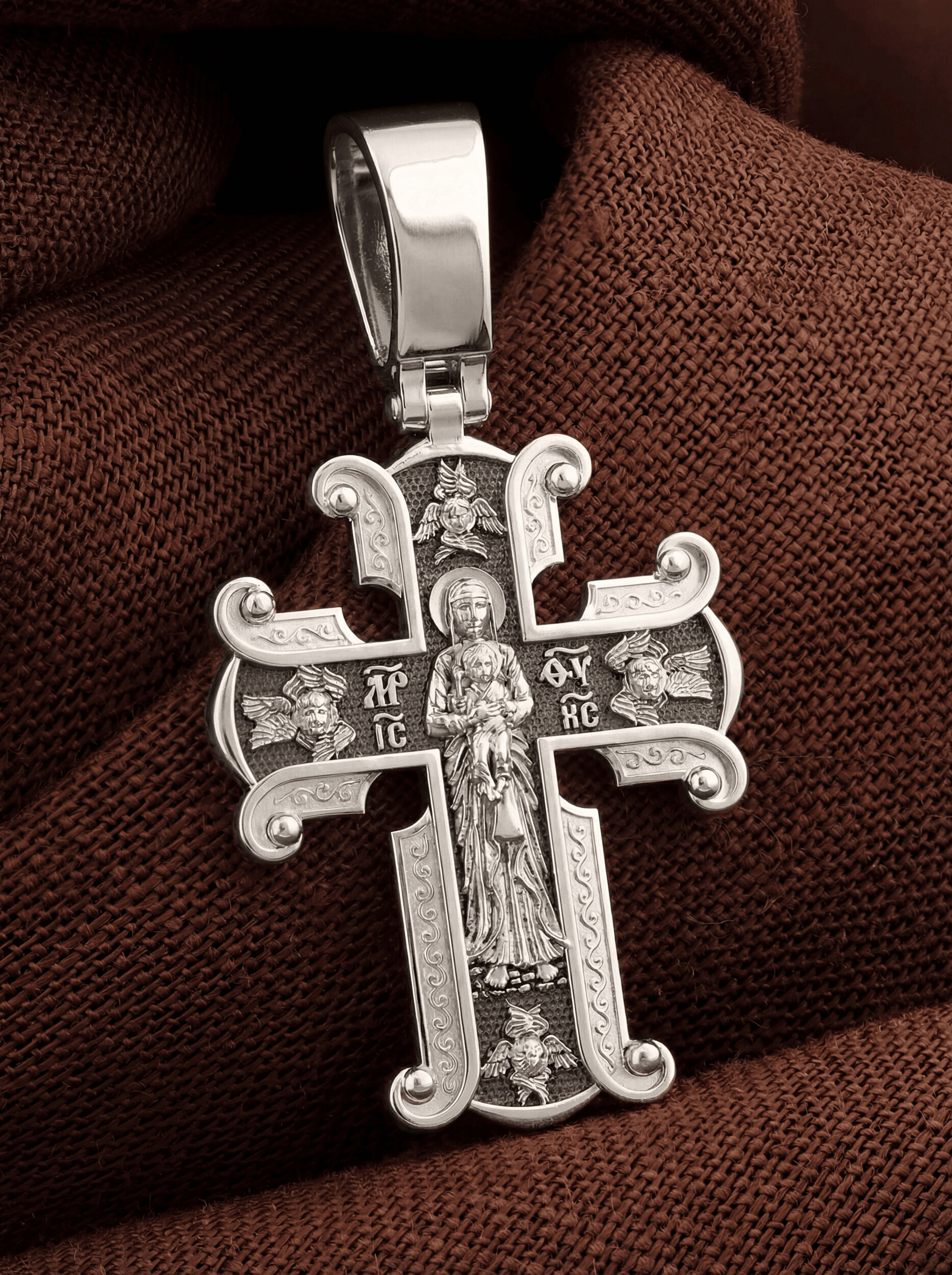 На лицевой стороне необычной формы нательного креста мы видим распятие Господне. Сам крест украшен плетением полурастительной тематики и золотым ободком, заканчивающимся завитками. На ухе с лицевой стороны надпись — Царь Славы. Под ней — шестикрылый огненный серафим, и буквы «IНЦI», означающие Иисус Назорей Царь Иудейский. С обеих сторон горизонтальной перекладины надписи — монограмма святого имени Христа — «ИС ХС», а под ней — «НИКА» (Победитель) и «Сын Божий». В подножии мы видим изображенную гору Голгофу в виде скалистой горки с Главой Адамовой в пещере.