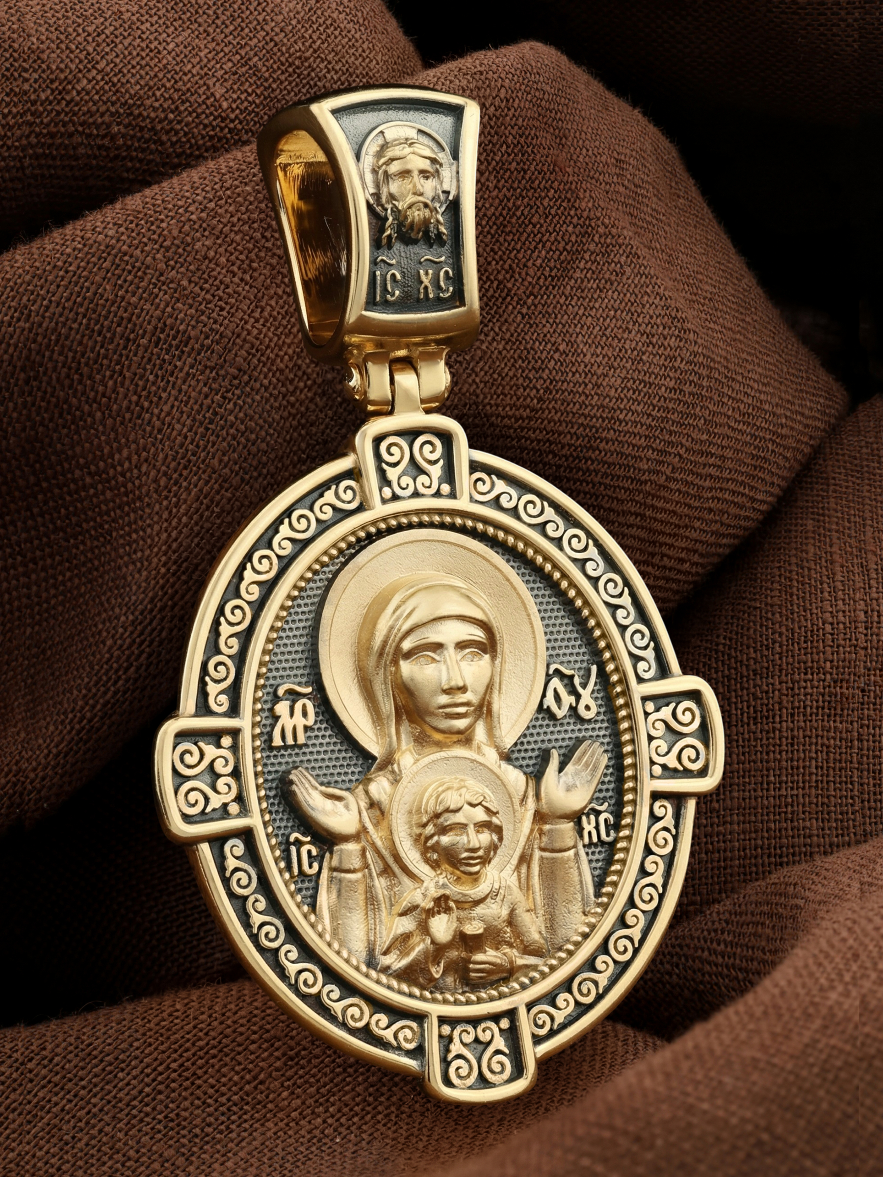 В центр образка помещен образ Божией Матери «Знамение», прославившийся многими чудесами в Новгороде в XII веке. Икона эта чтится как одна из самых великих святынь Русской земли. Молитвенно воздетые руки Богородицы означают заступничество за людей пред Богом. Рядом с Ней — благословляющий Божественный Младенец — Спас-Эммануил.